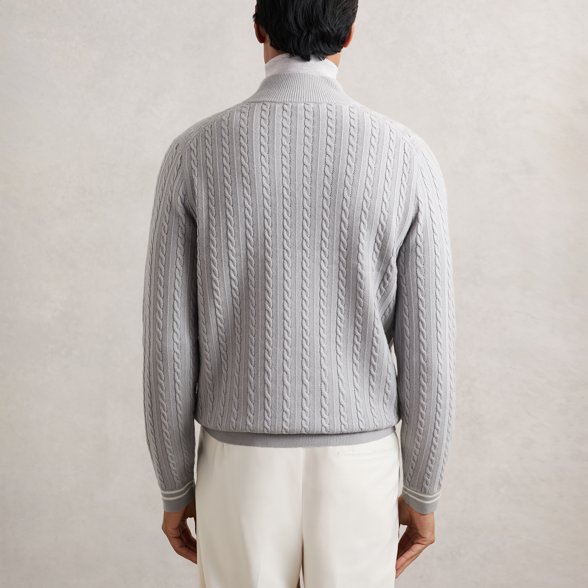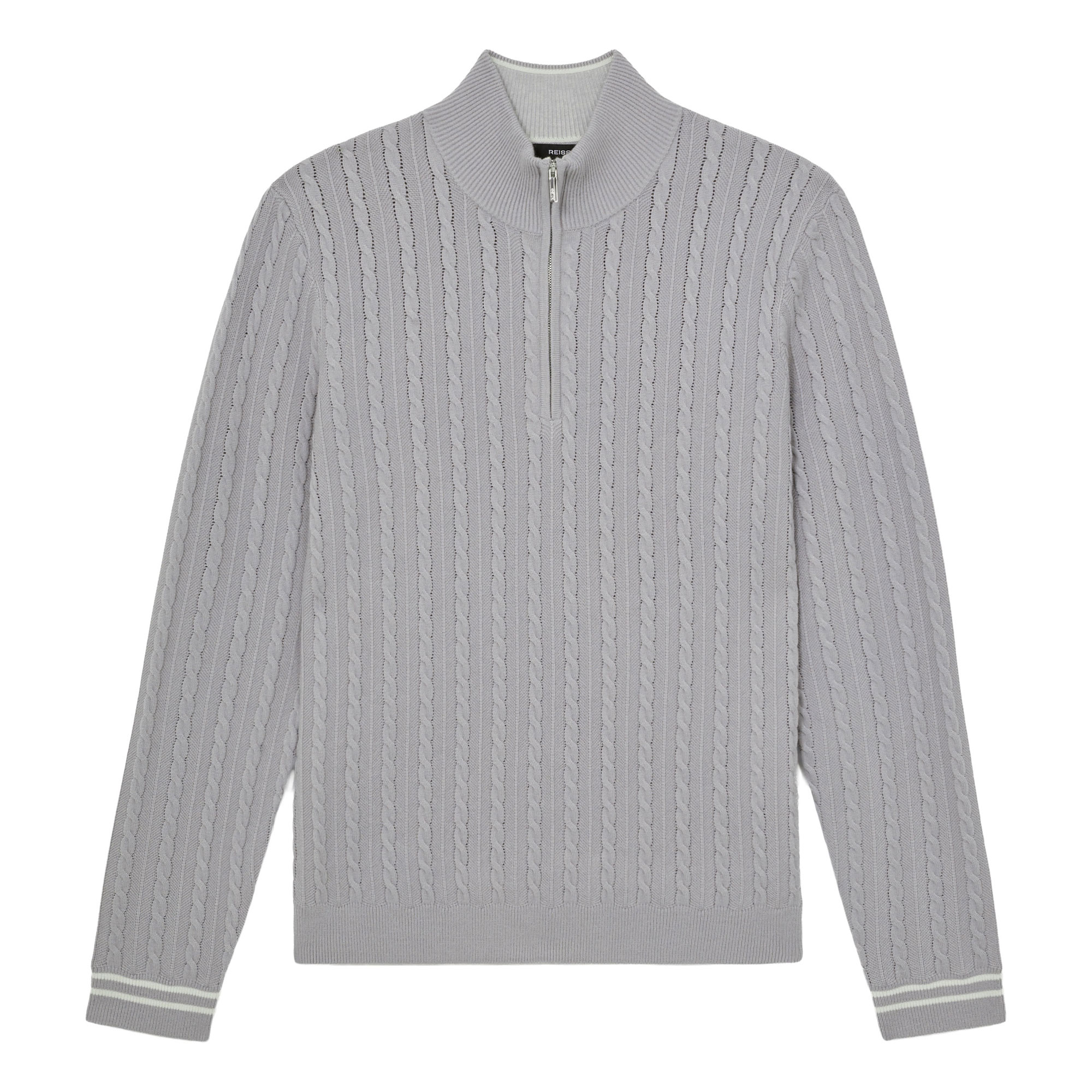 - Cable knit, funnel neck, half zip fastening, long sleeves, ribbed trims, tipped cuffs