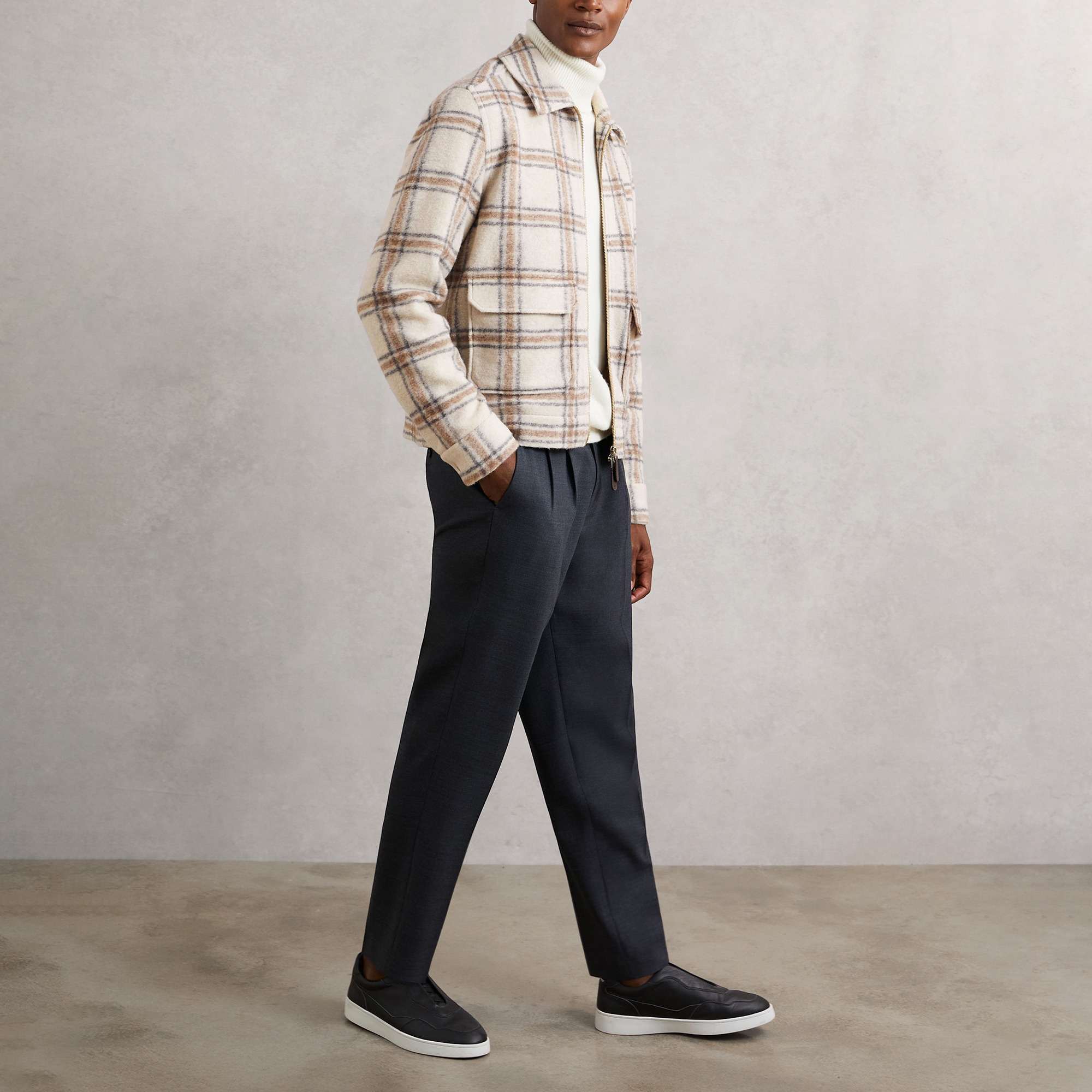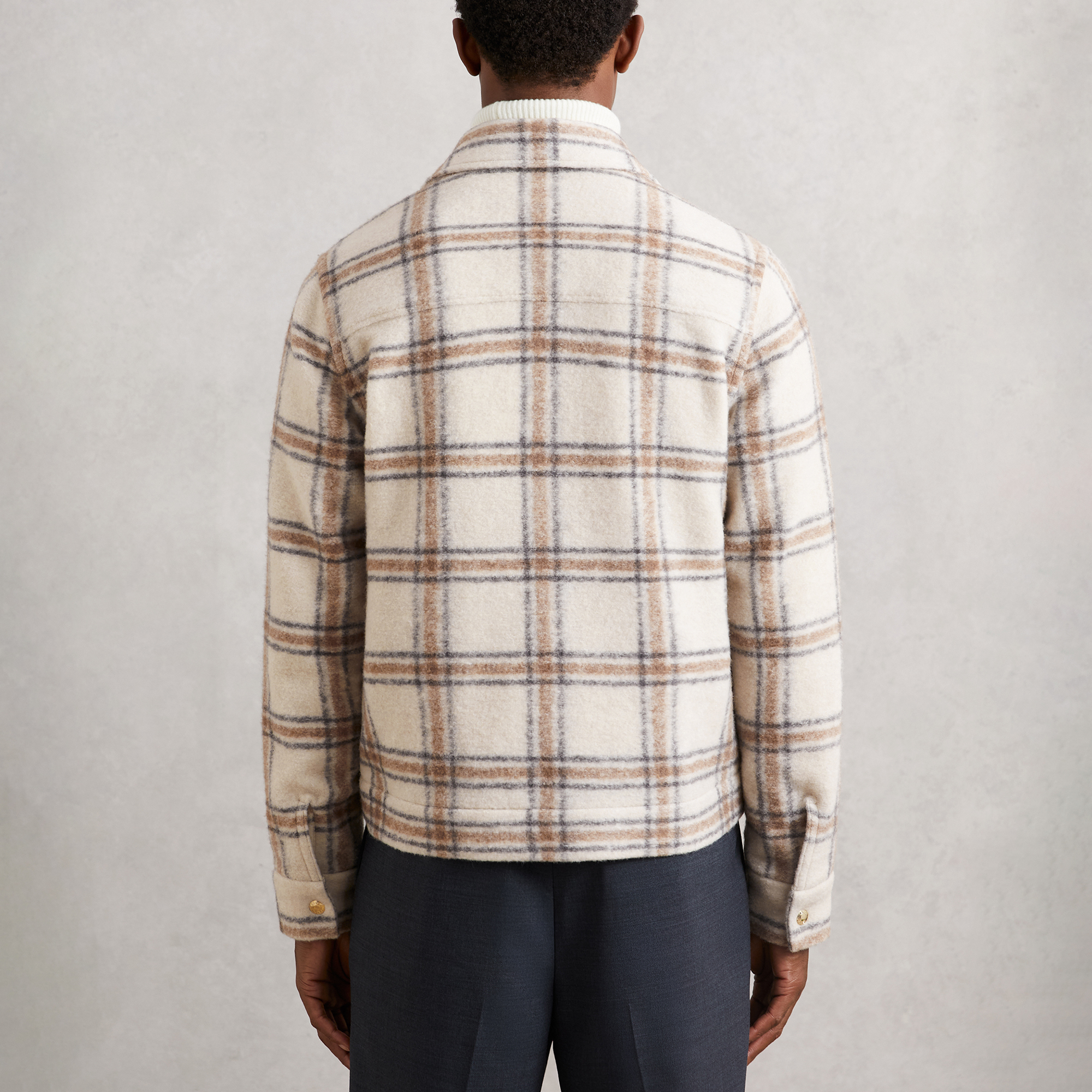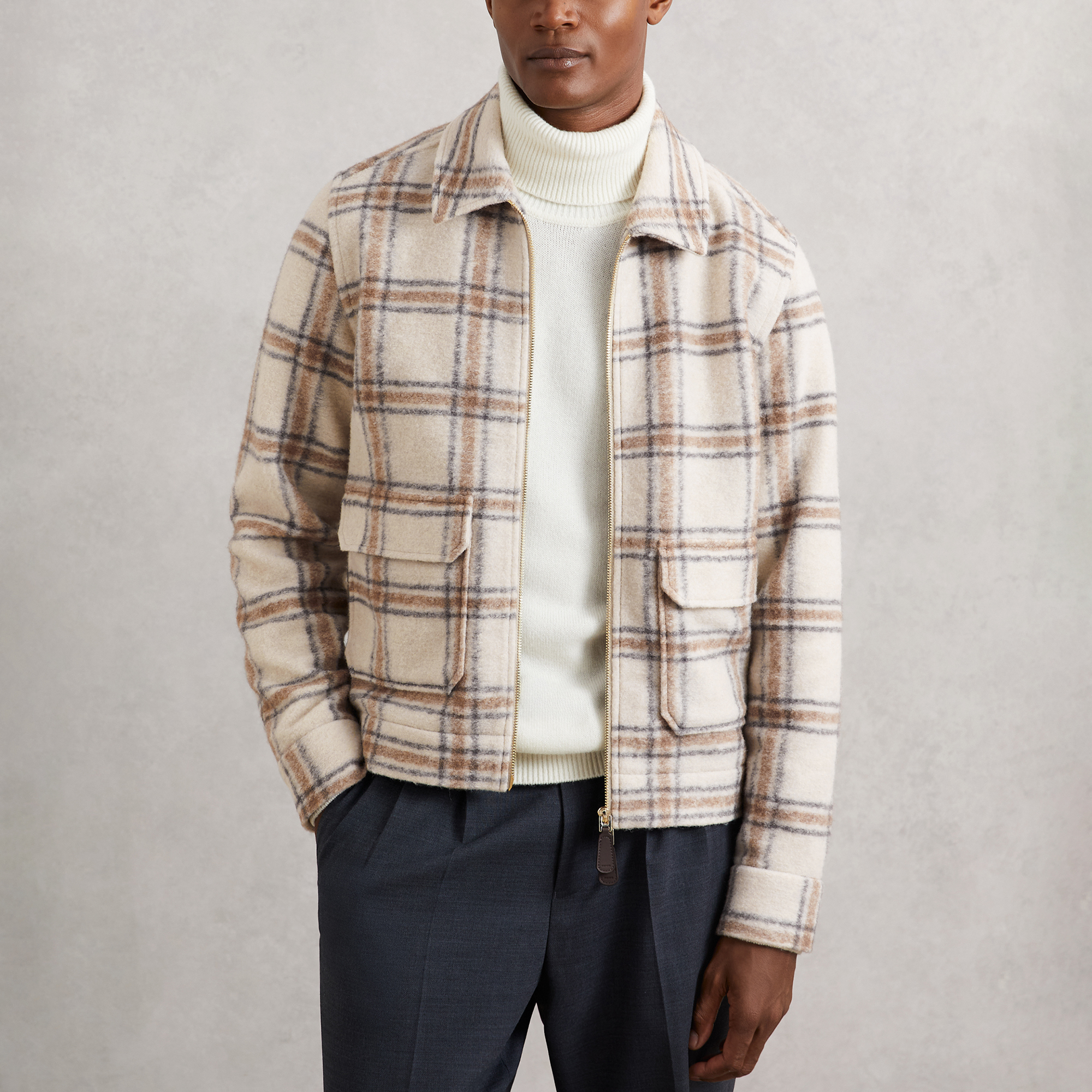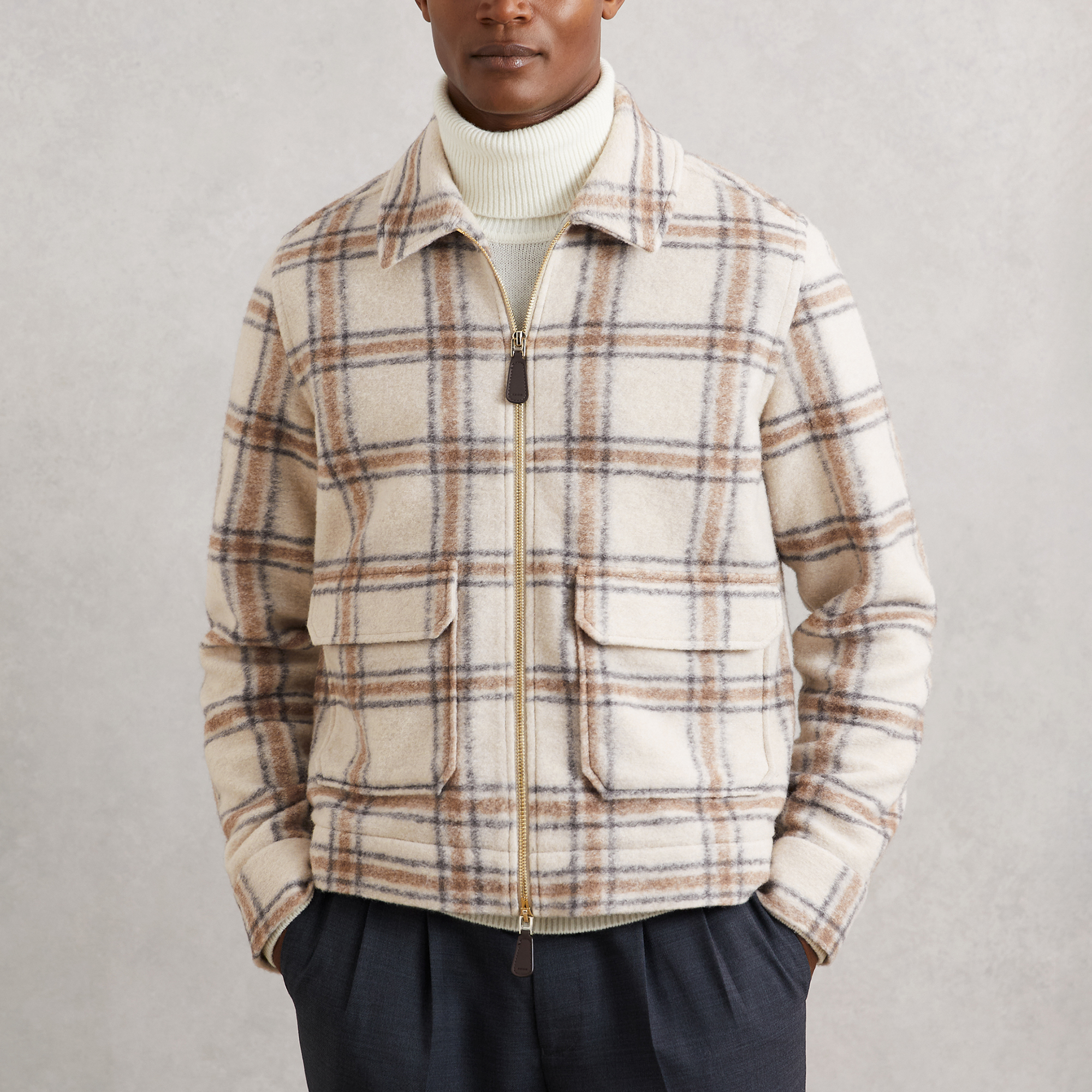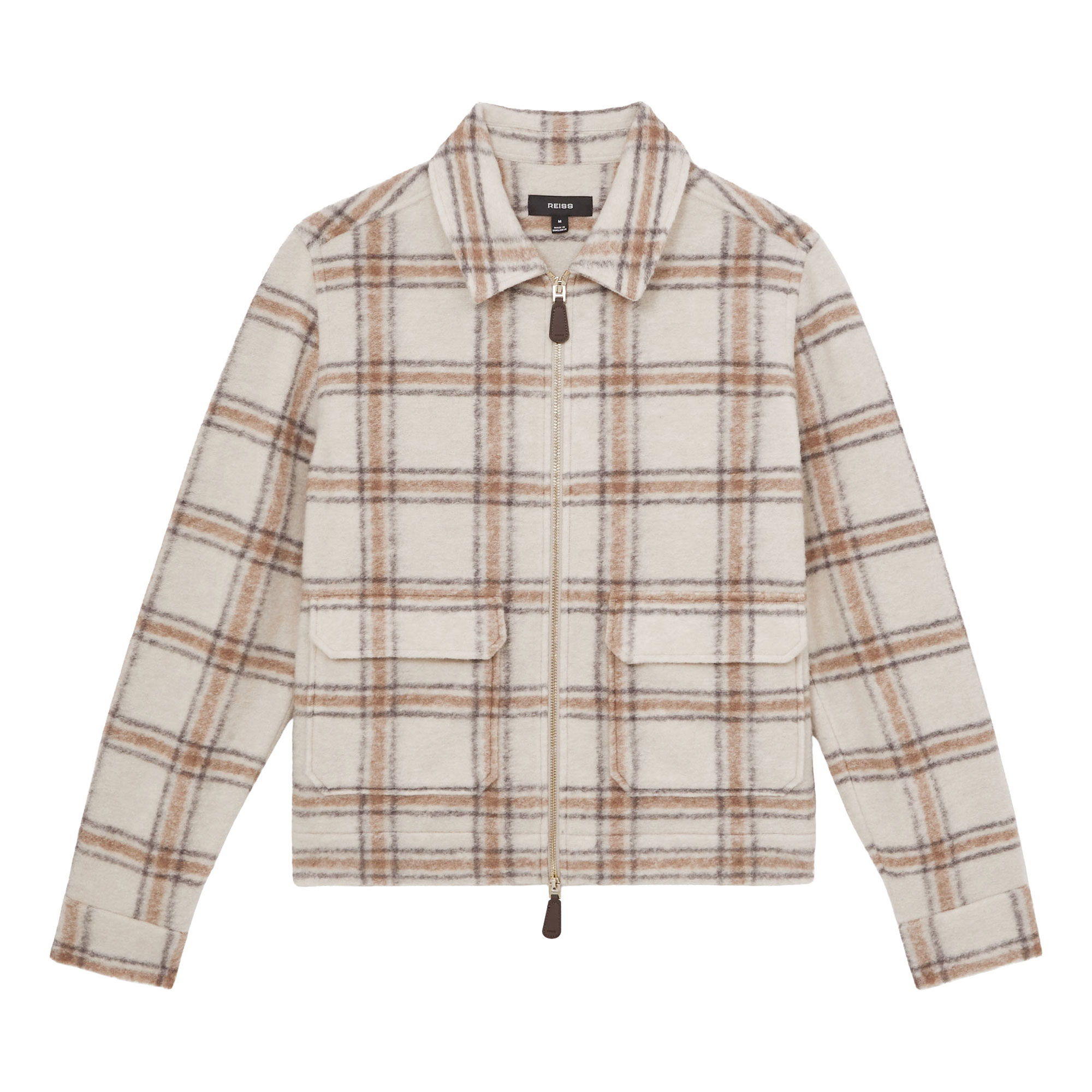 - Check pattern, classic collar, front flap pockets, buttoned cuffs, dual front zip