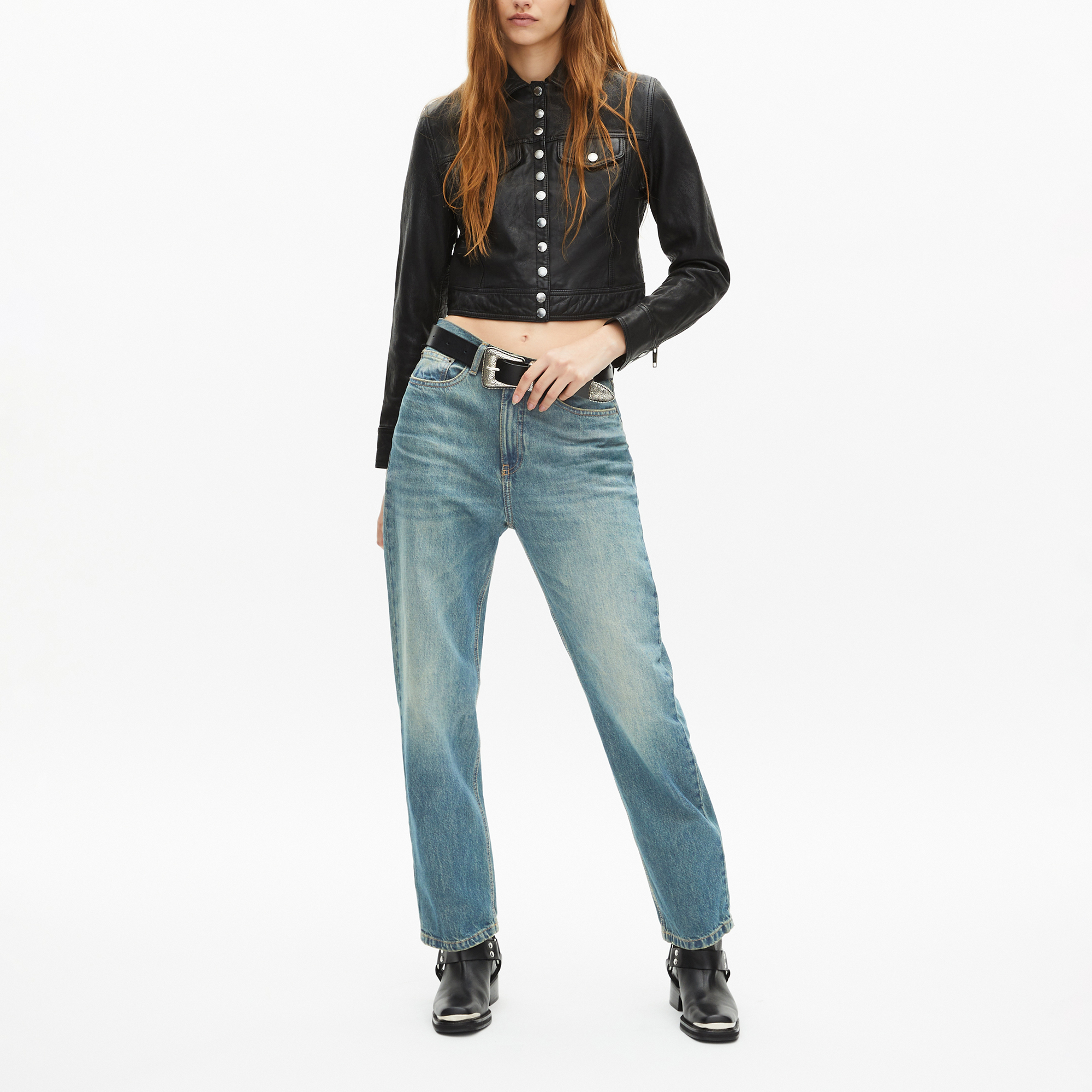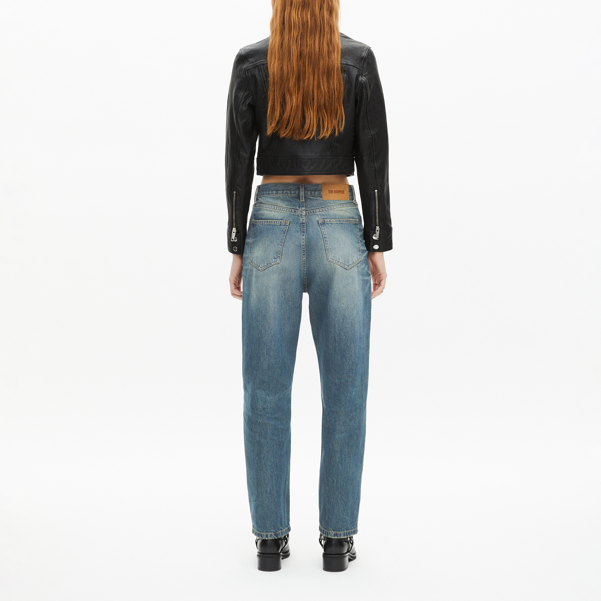 - Boyfriend style, denim fabric, belt loops, zip closure, five-pocket style
