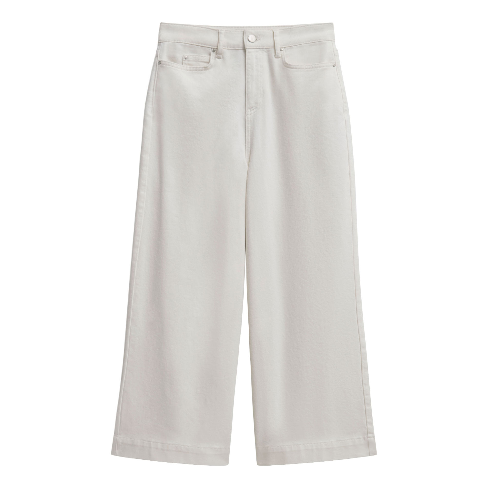 - Denim fabric, wide-leg silhouette, side pockets, belt loops, front zip fastening