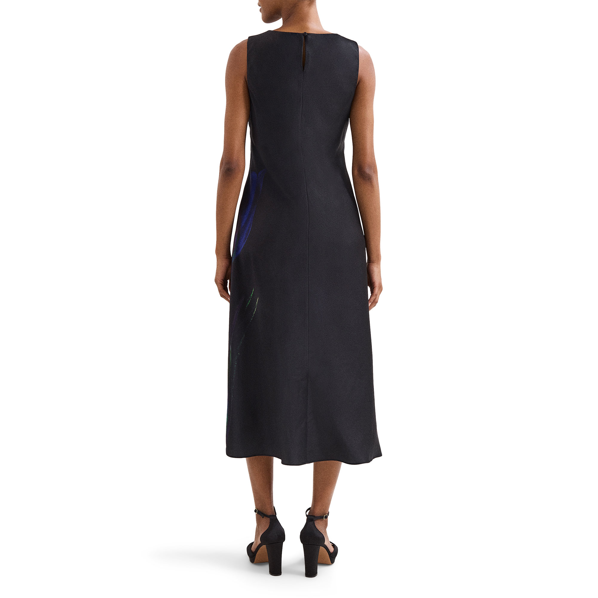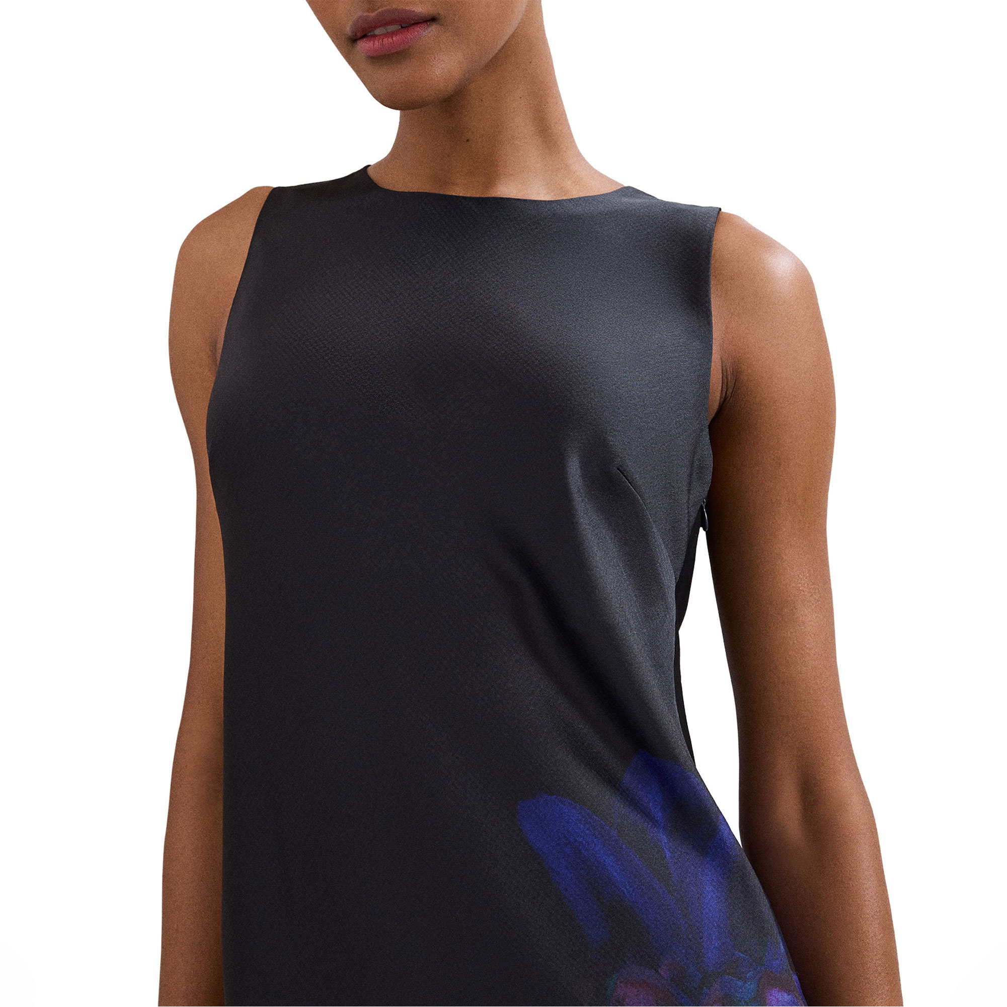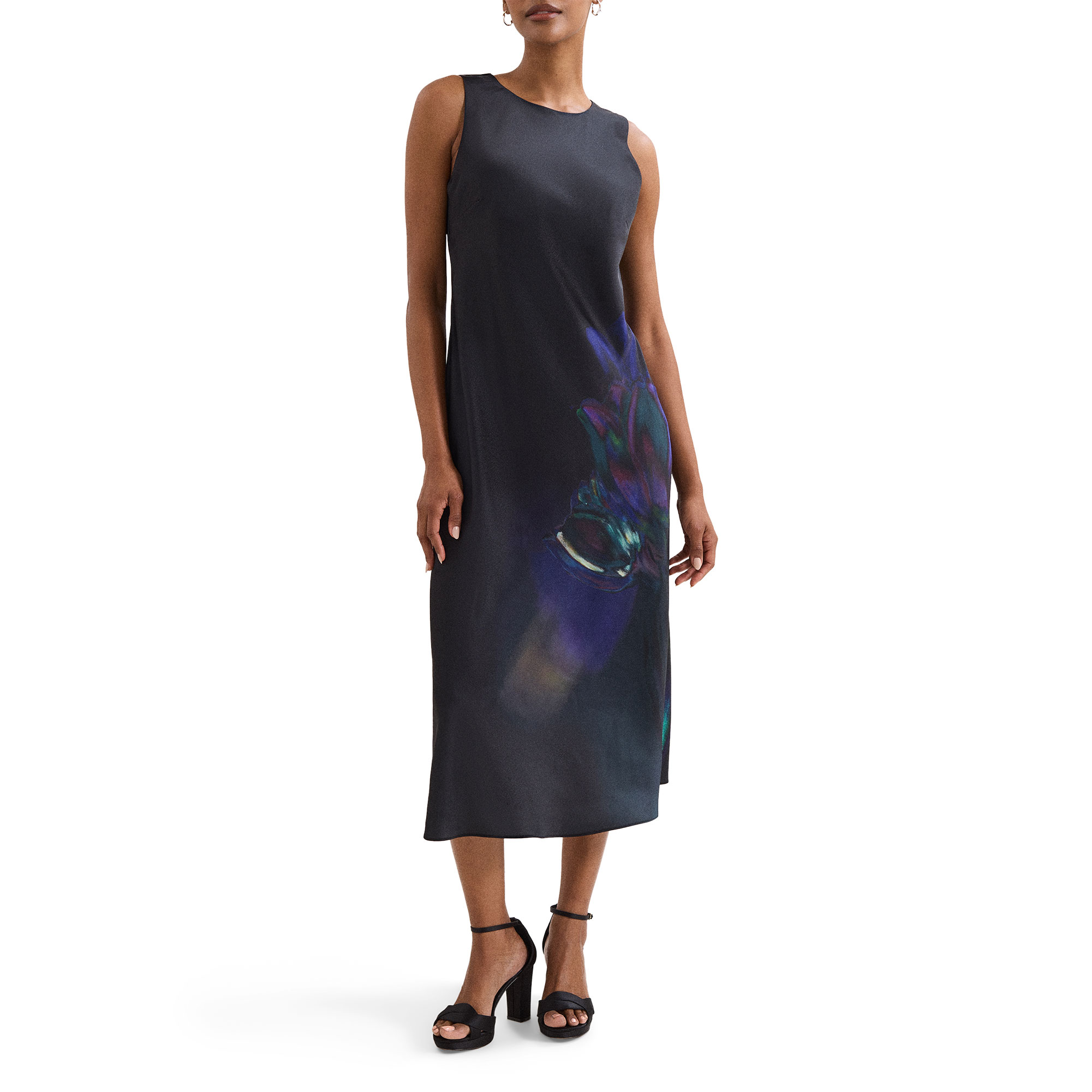 - Midi length, slip style, boat neckline, sleeveless silhouette, soft satin-feel material, floral print, concealed zip fastening