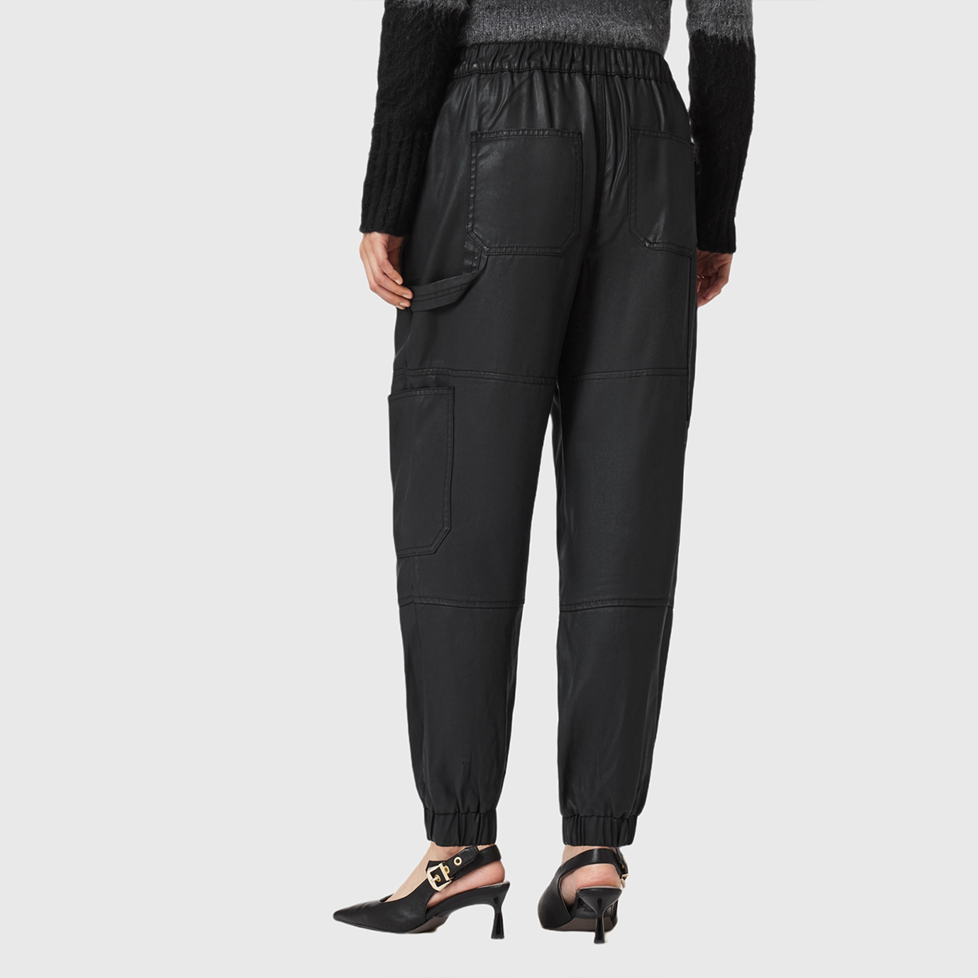 - Workwear-inspired carpenter-style trousers, bellow front pockets, cargo pocket details, elasticated hem and back waistband, tapered cuffs
