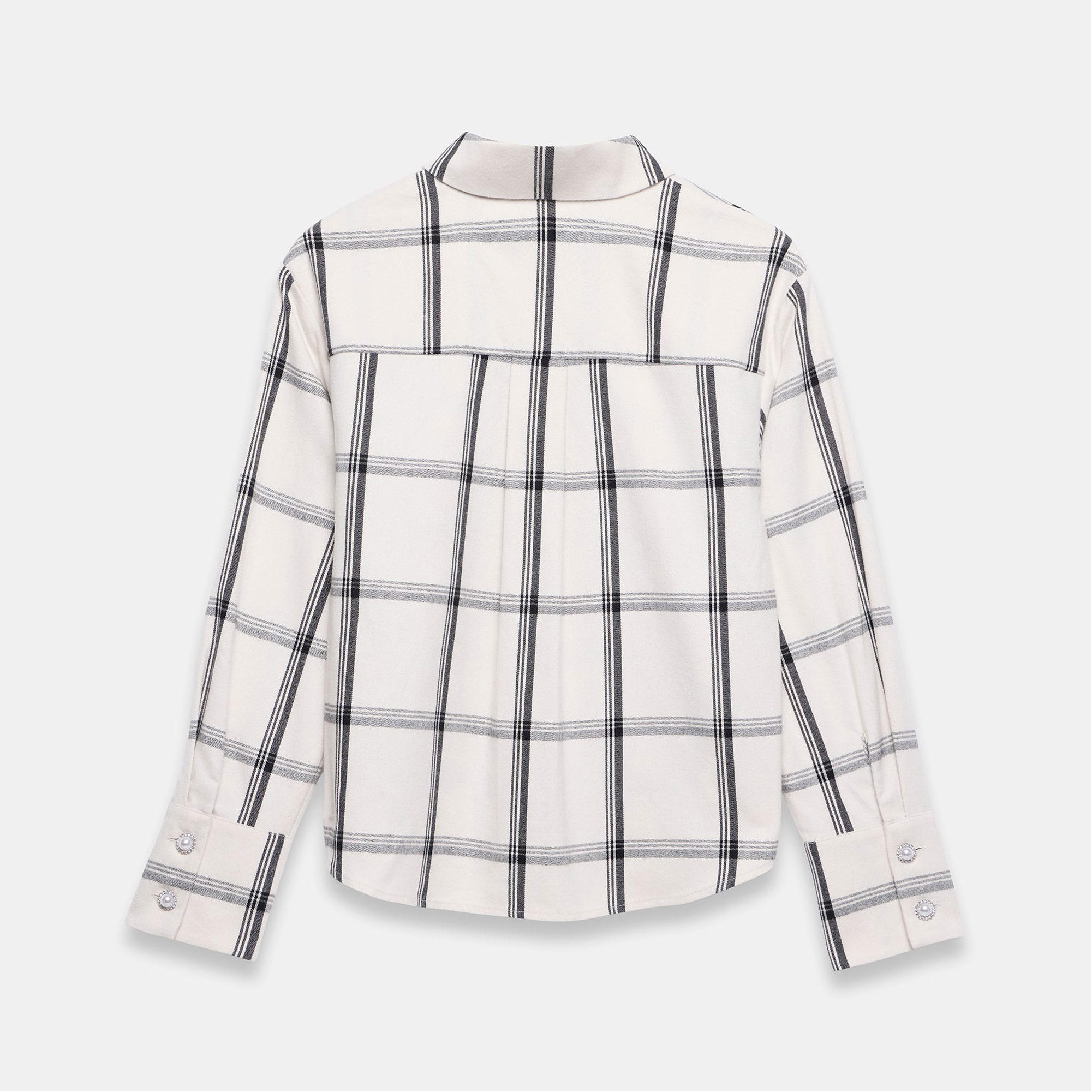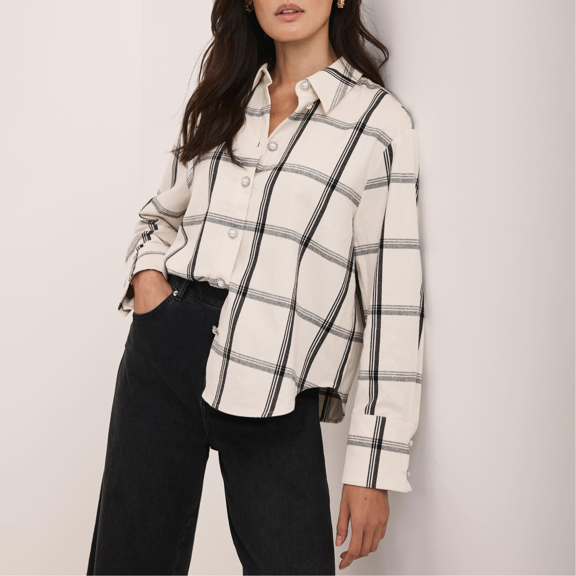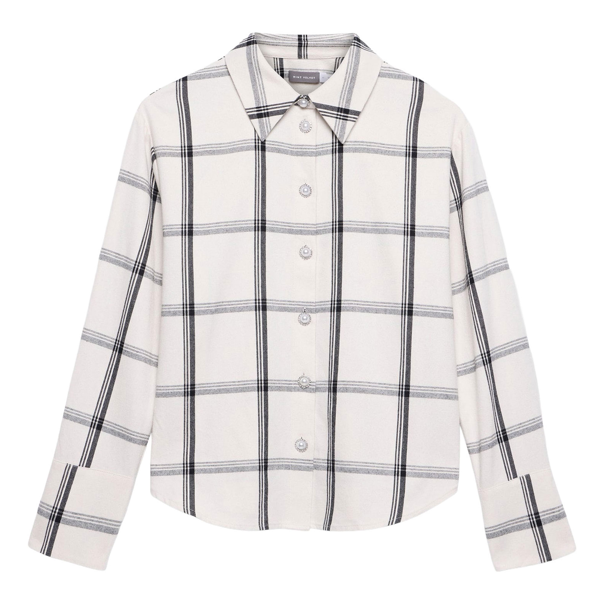 - Check design, classic collar, long sleeves, buttoned cuffs, diamante pearl button fastening