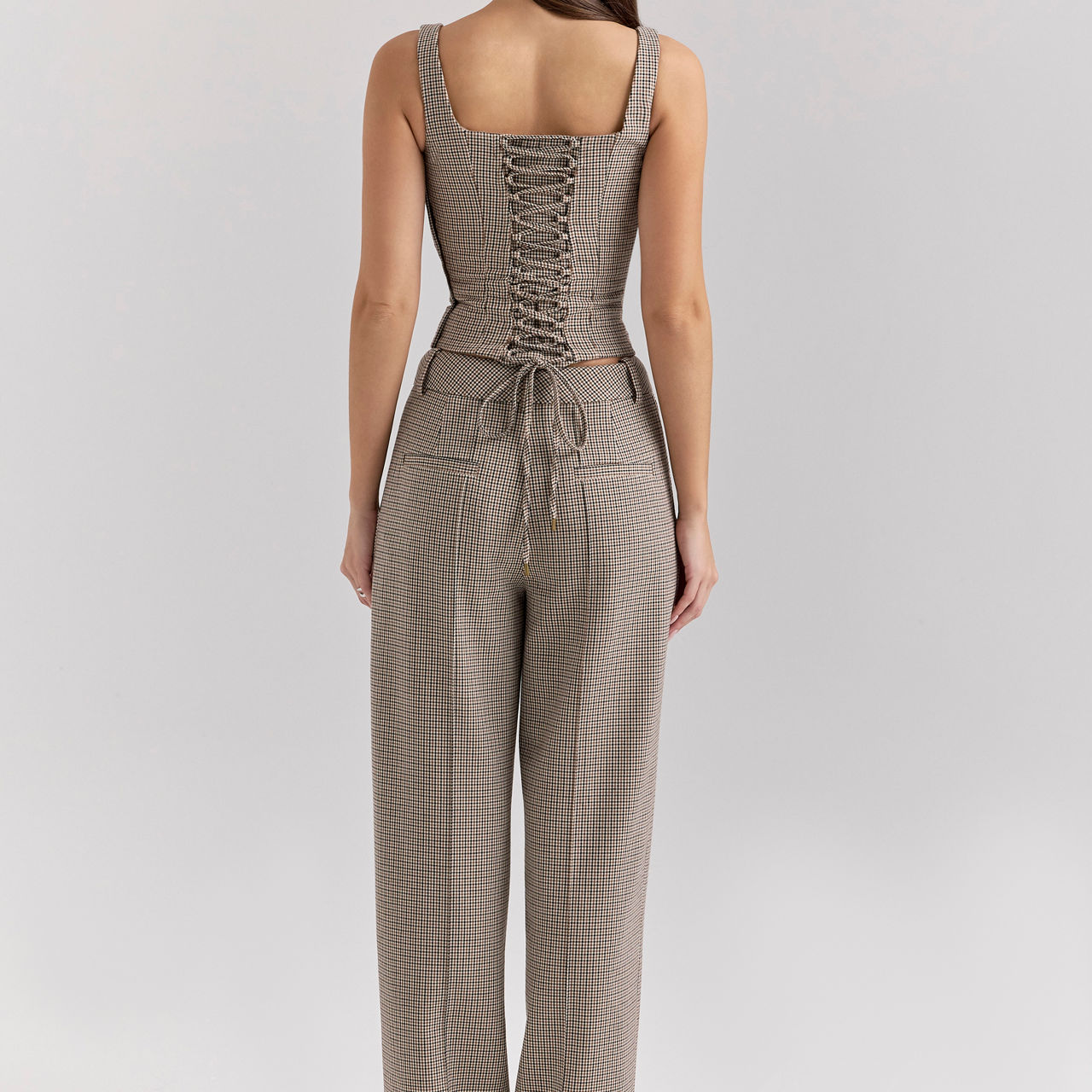 - Puppytooth pattern, boned panels, gathered bust, adjustable lace-up back, side zip fastening, shoulder straps