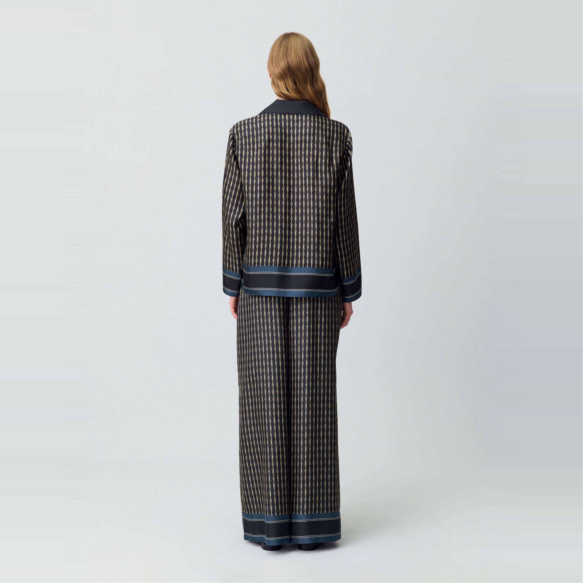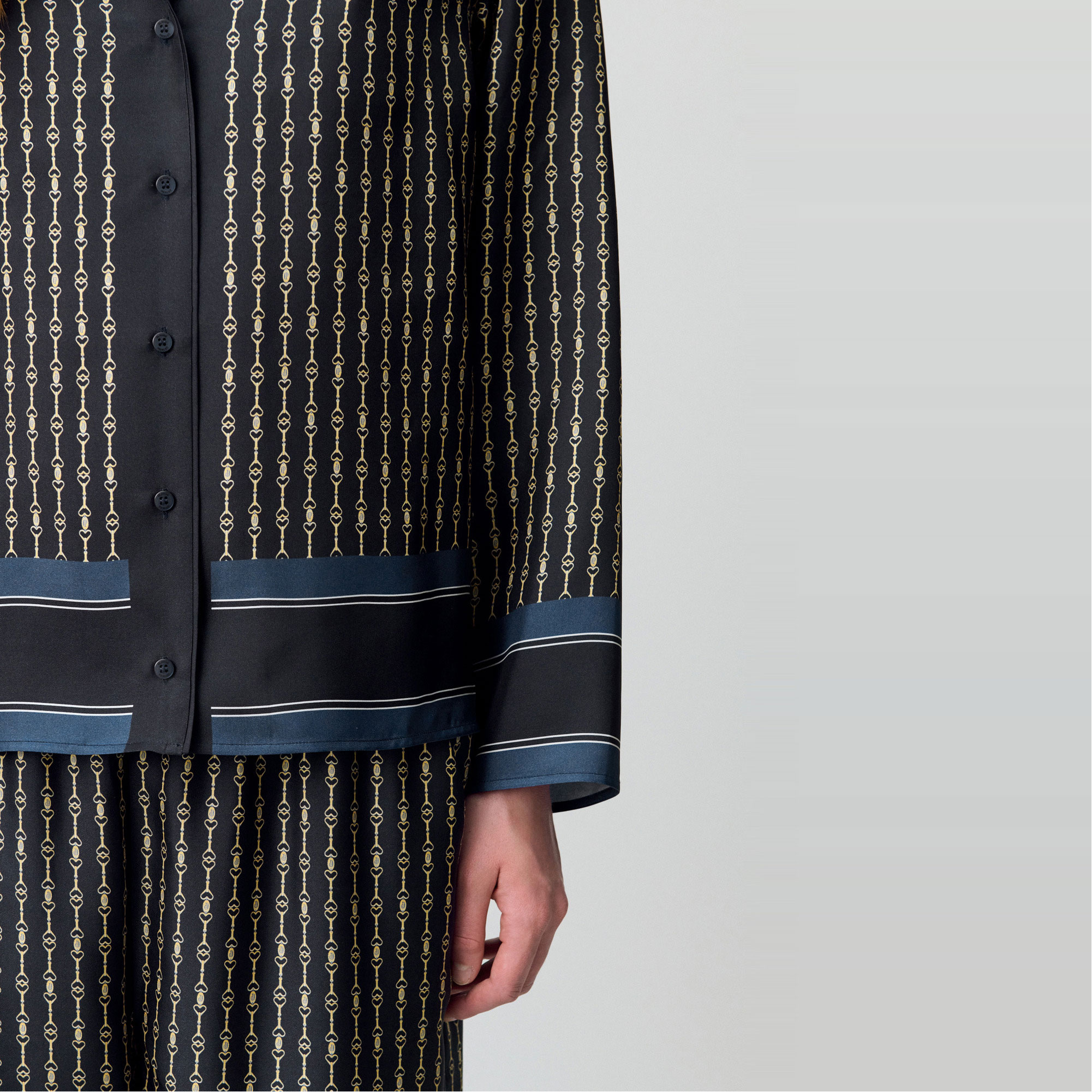 - Tailored collar, long sleeves, front button fastening, straight hem, border trim, mordant patterns, smooth finish