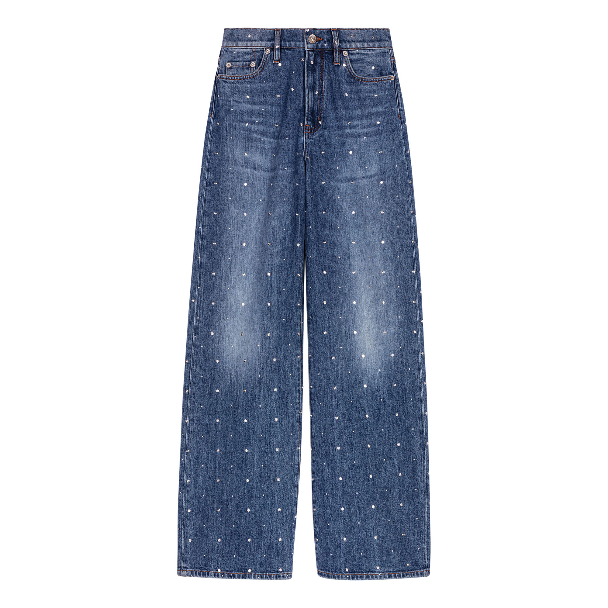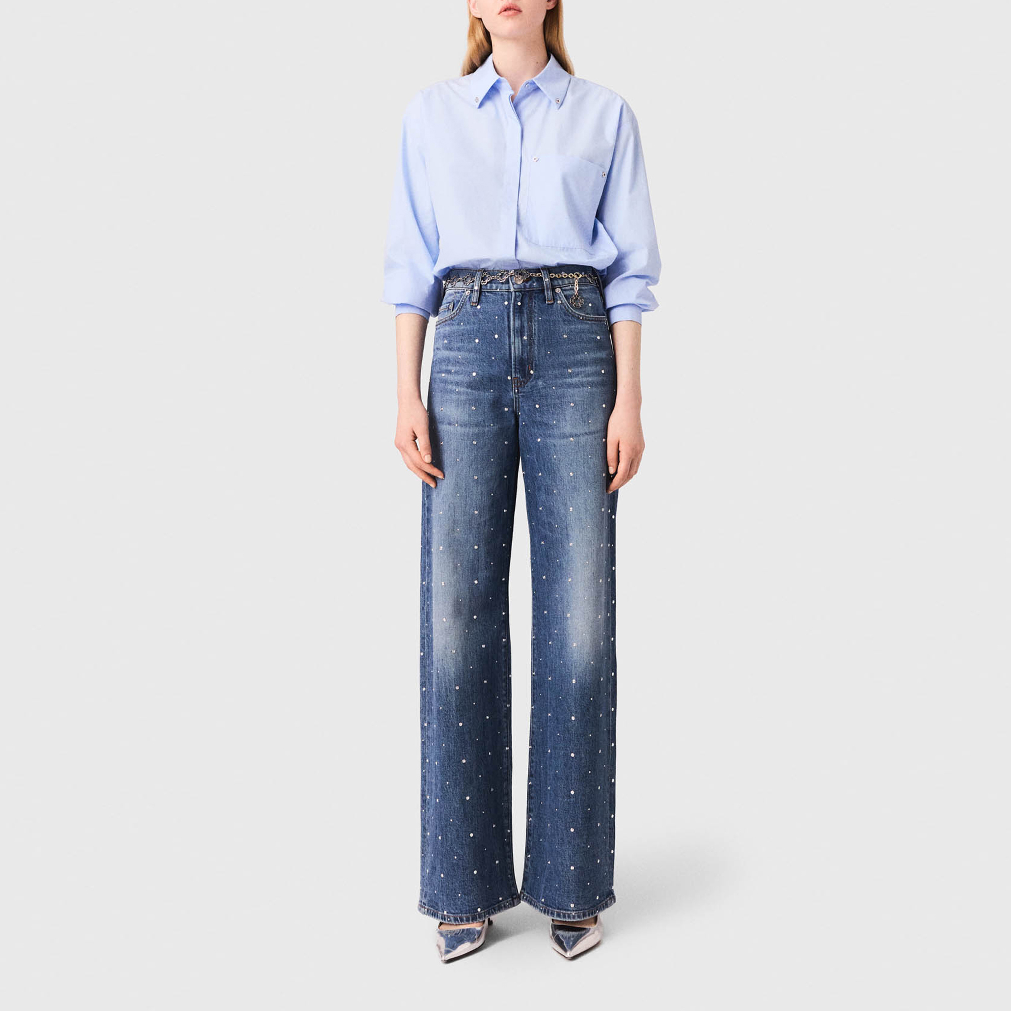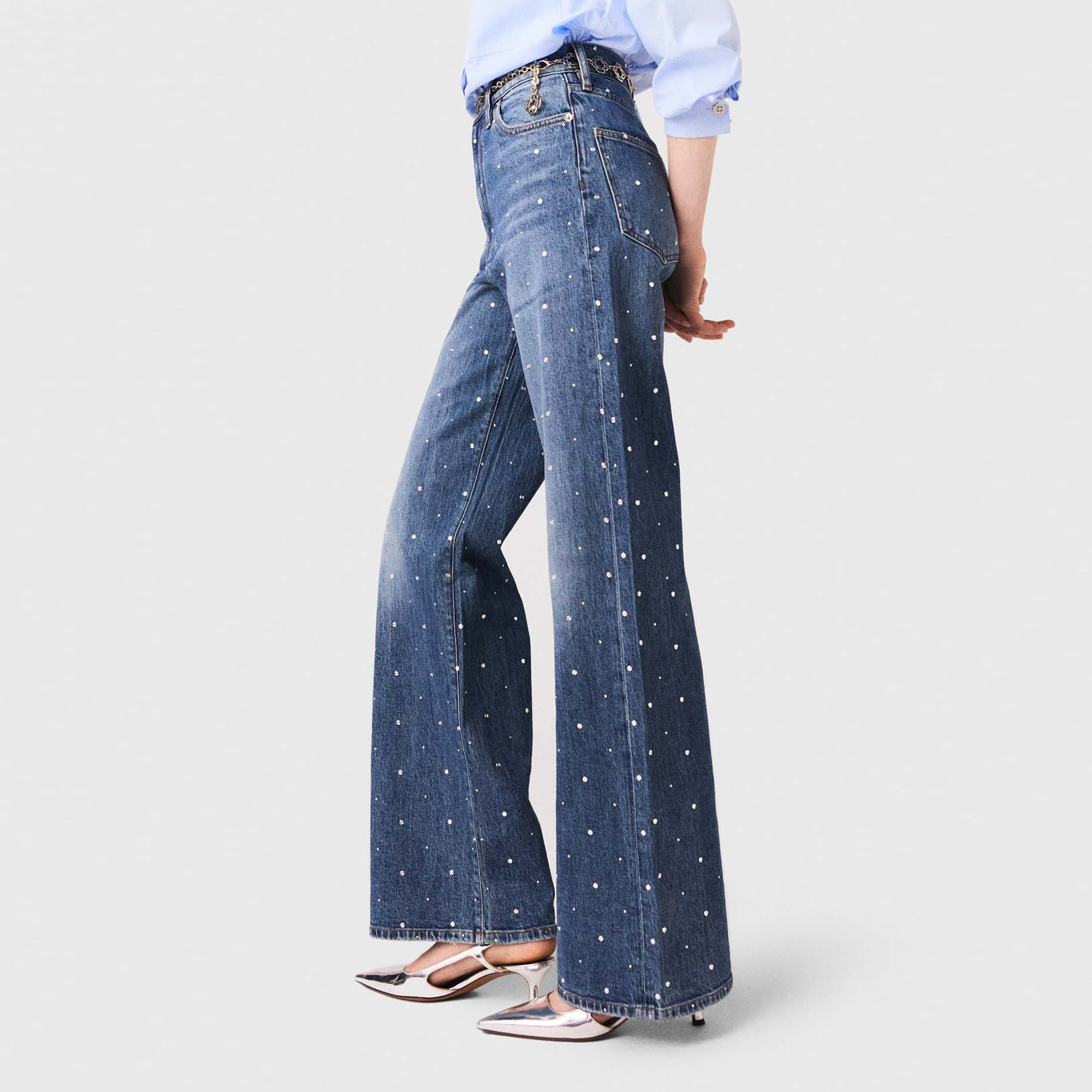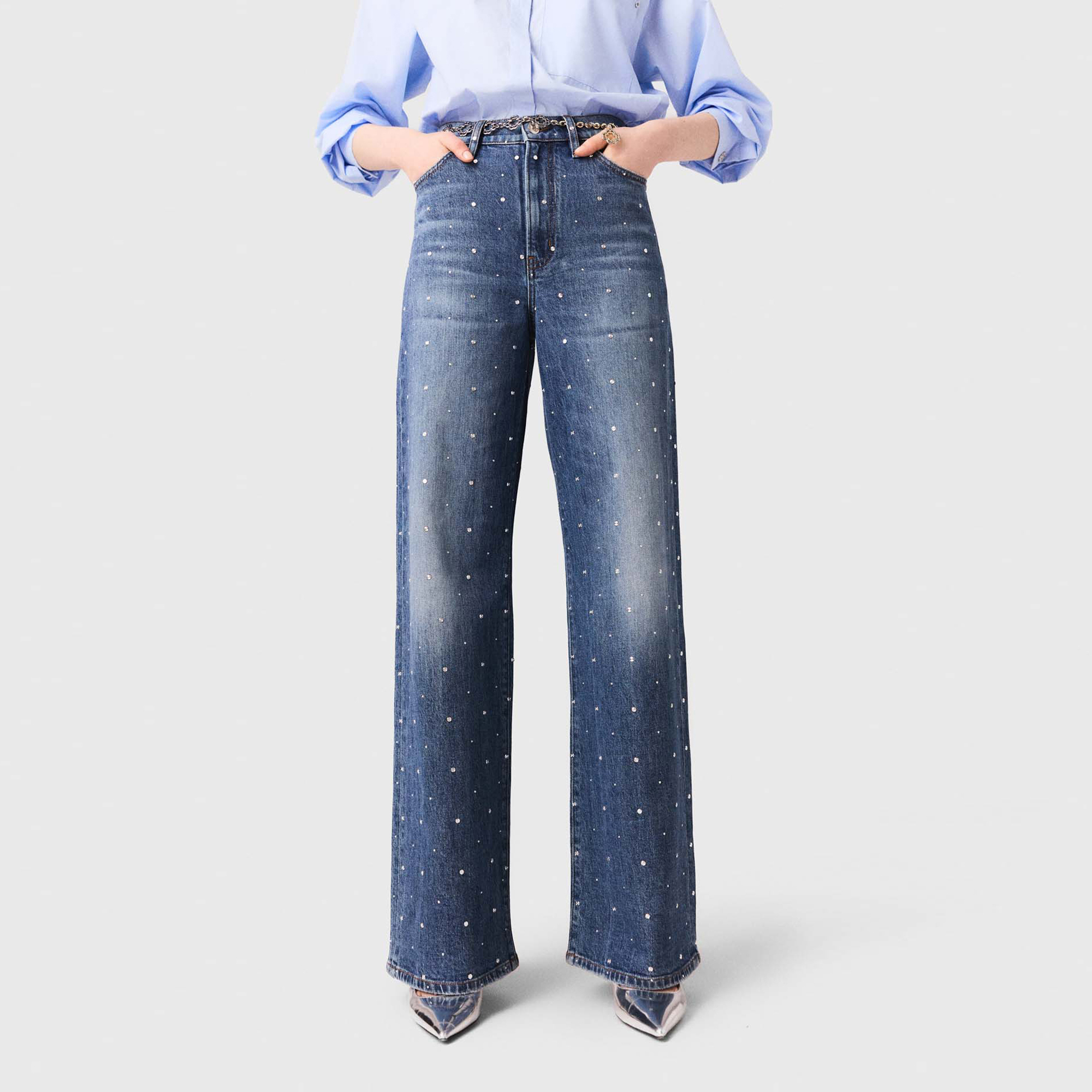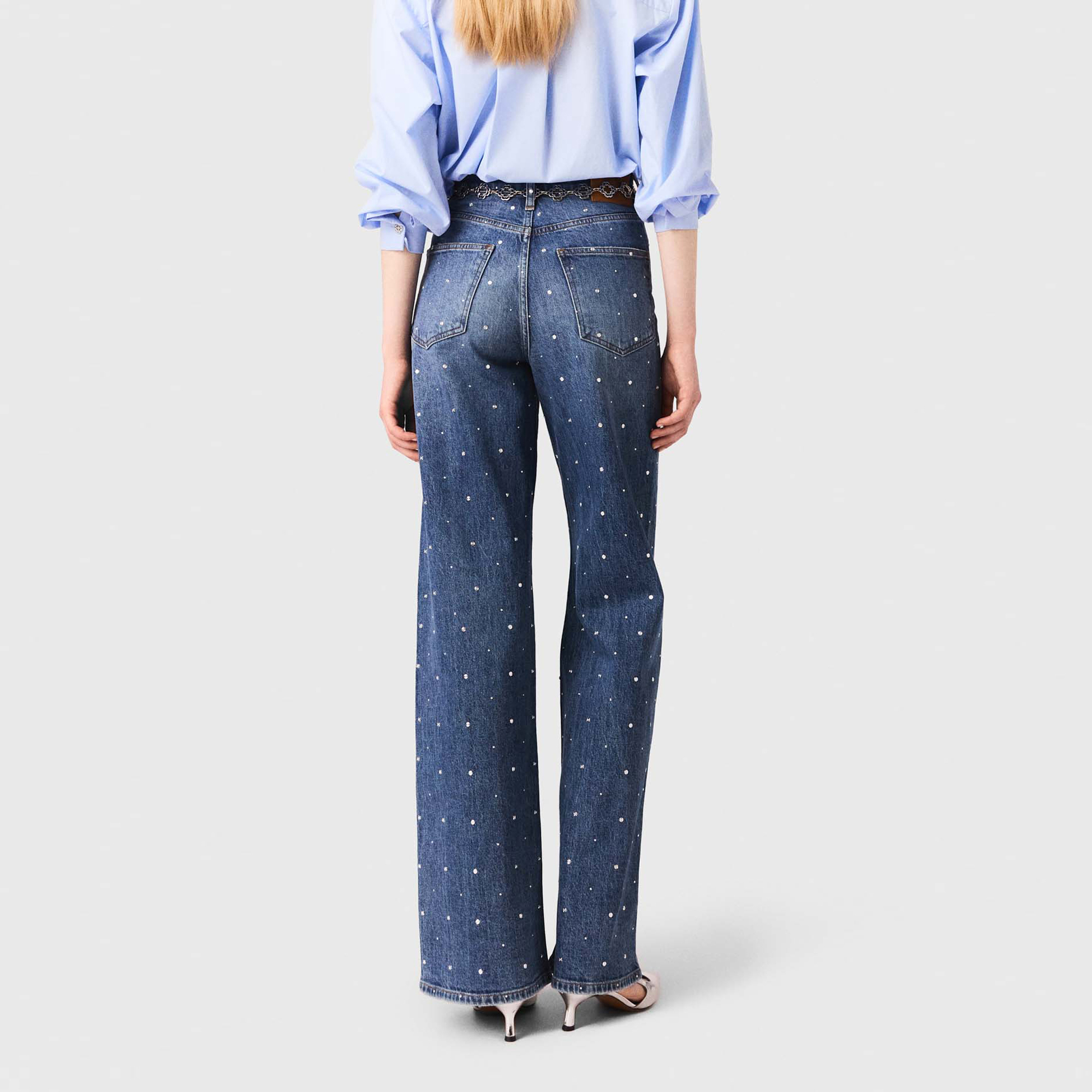 • Studded jeans, five-pocket styling, logo detailing on the back, metallic accents