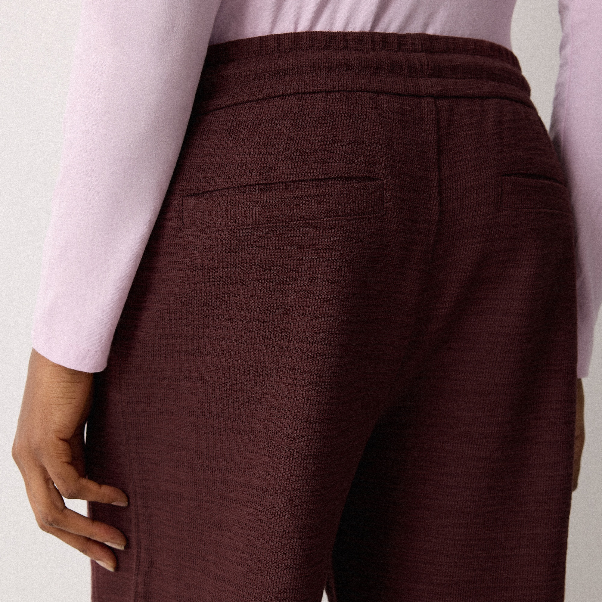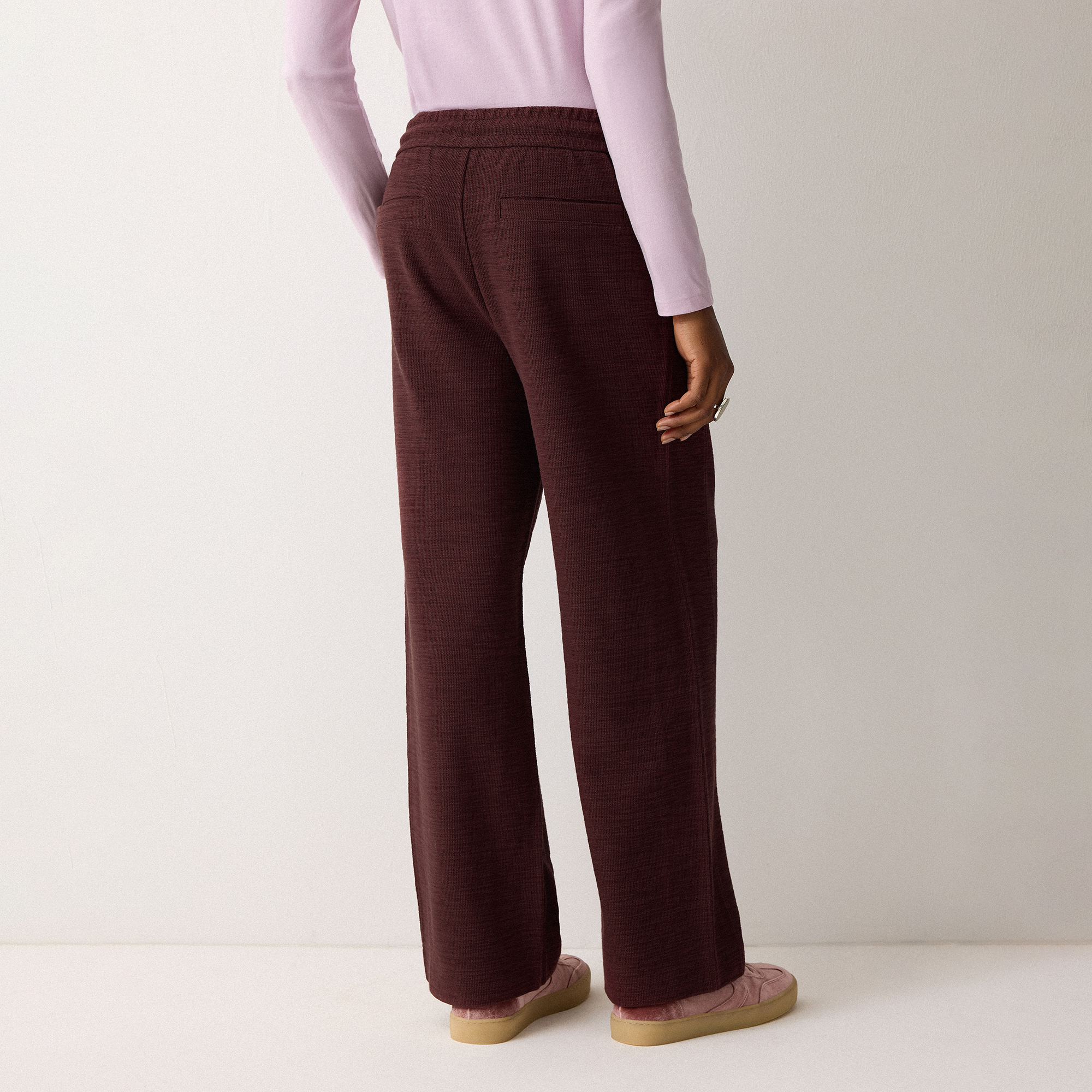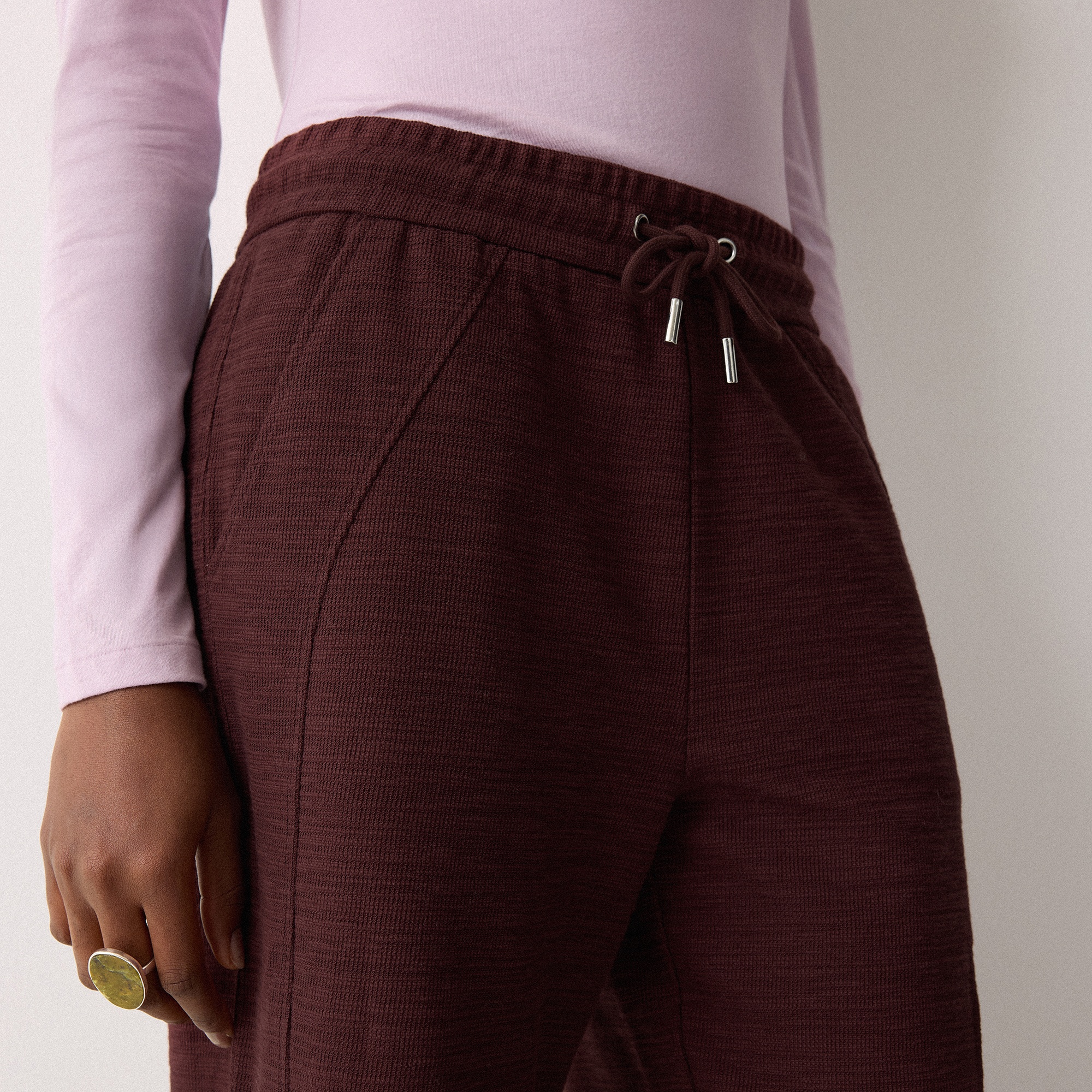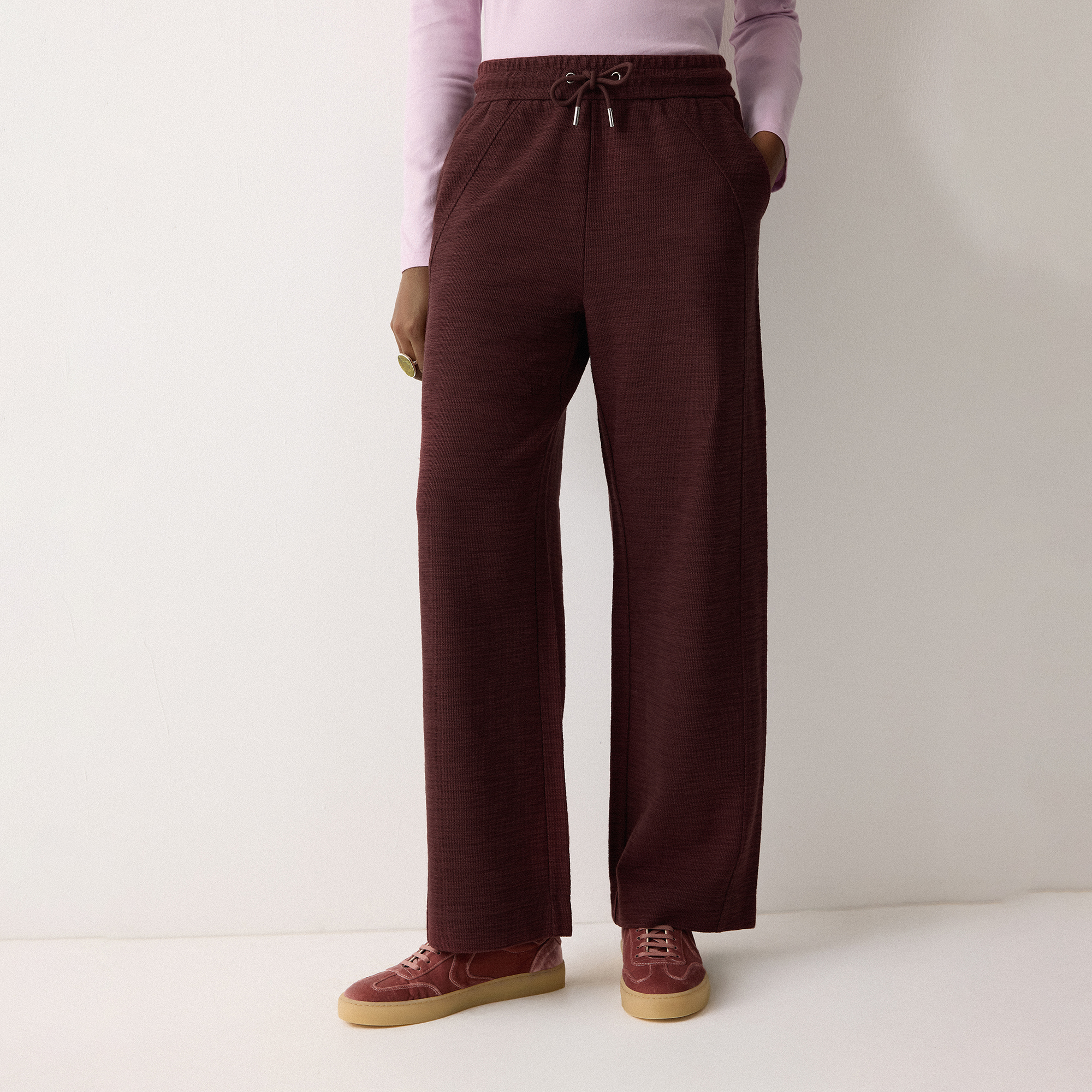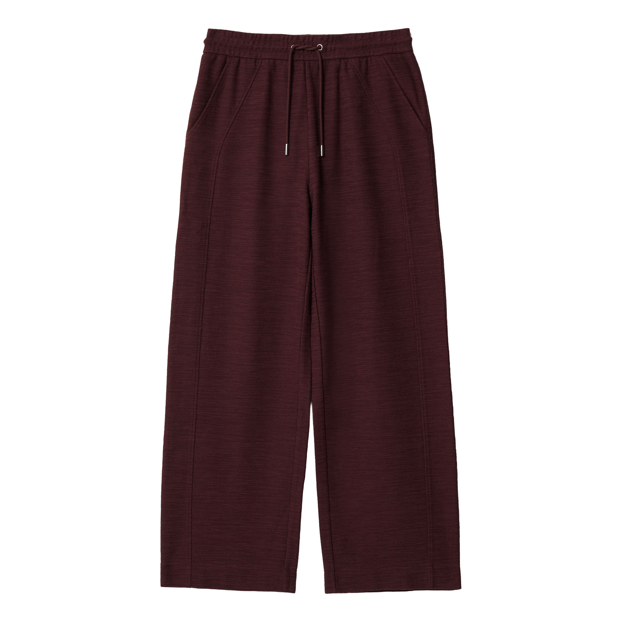 • Tie drawstring waist, front seam detailing, slub texture, straight-leg silhouette