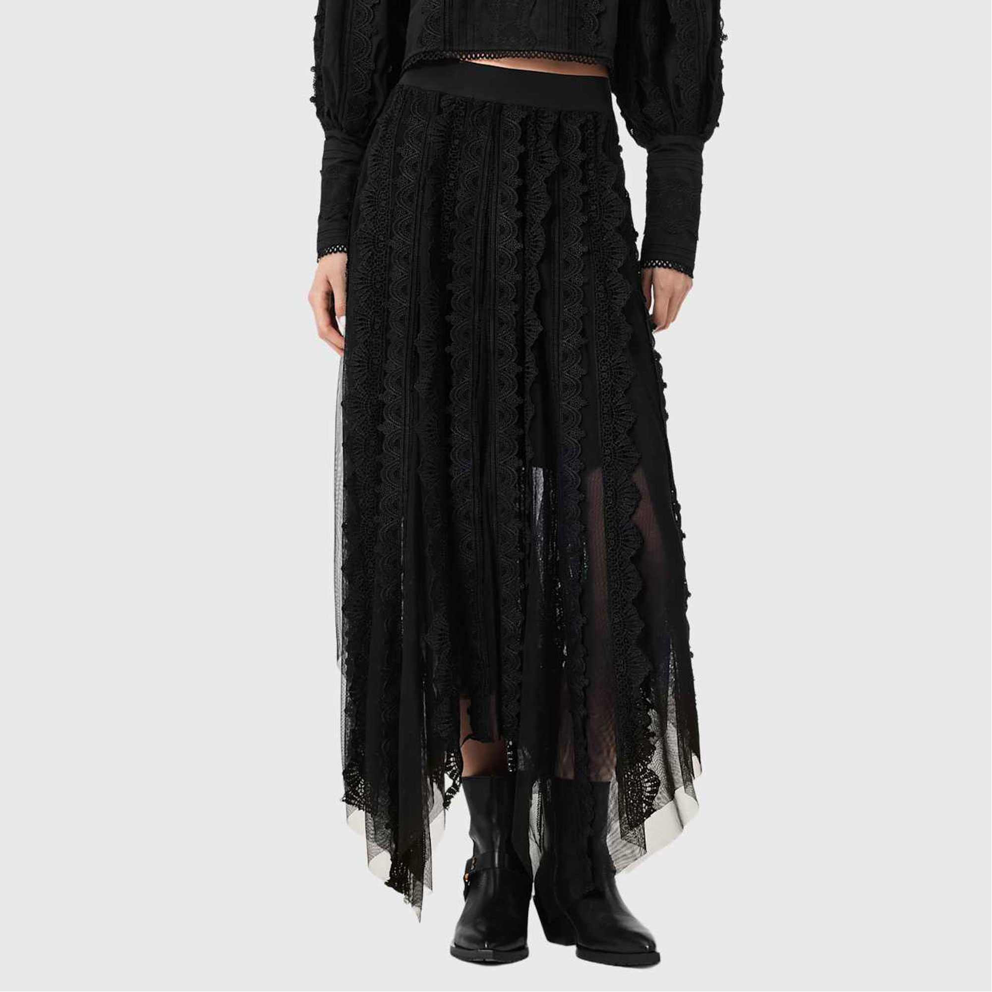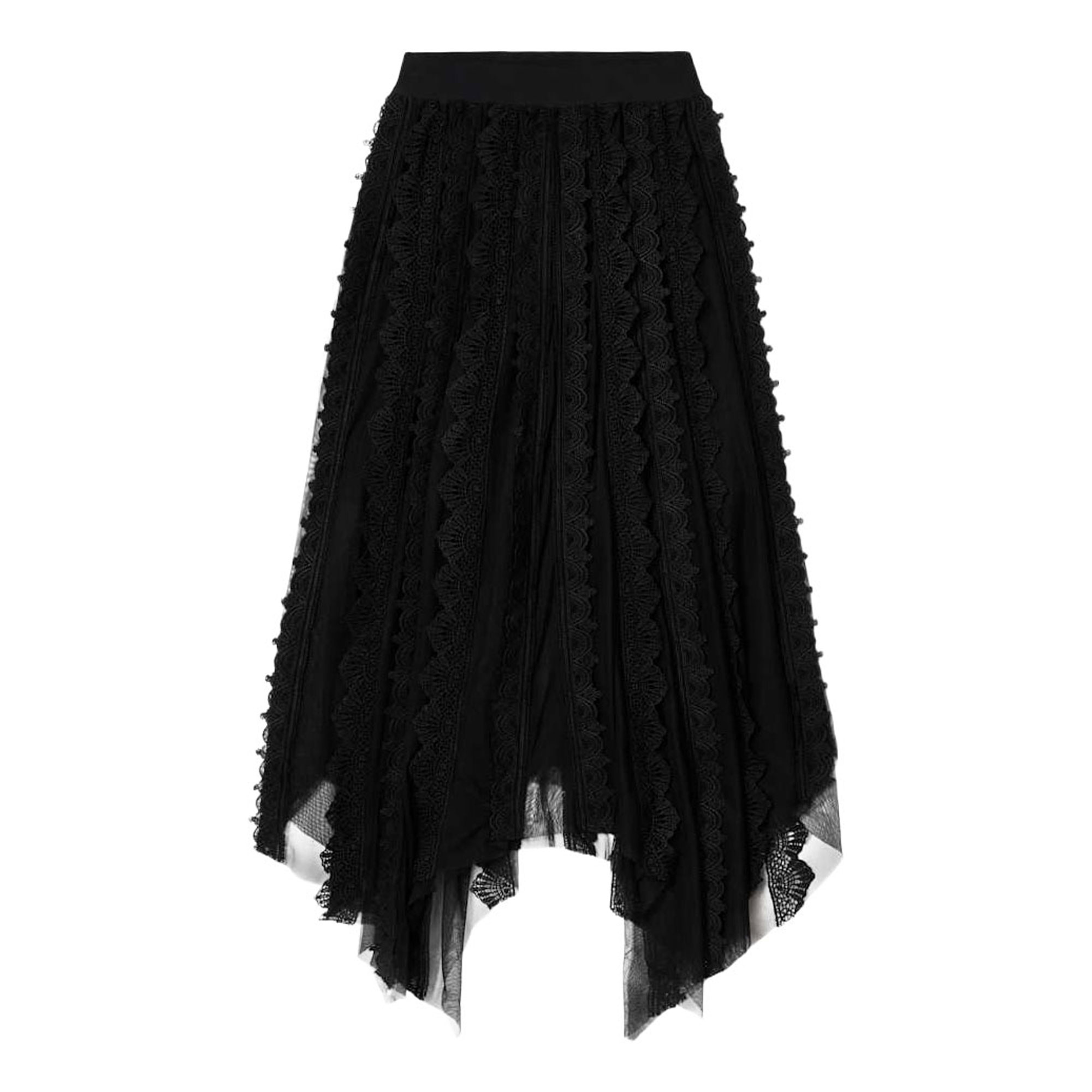 - Elasticated waistband, lace embellishment, tulle base, asymmetric hemline