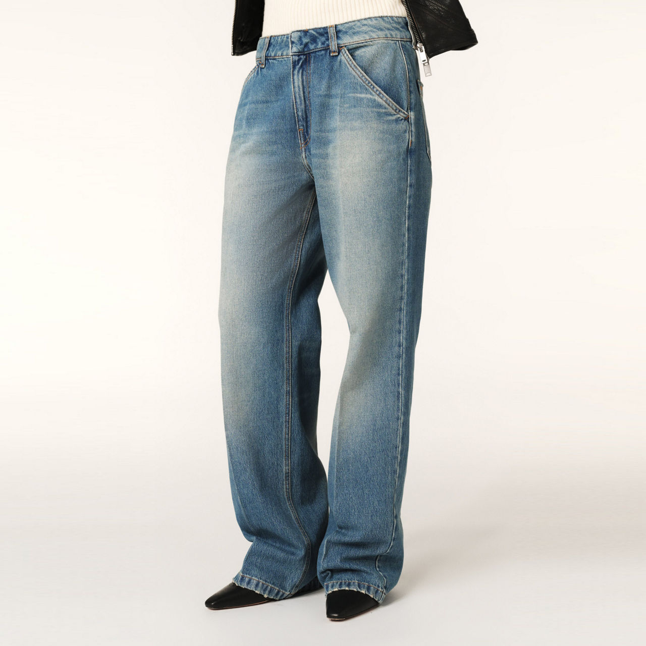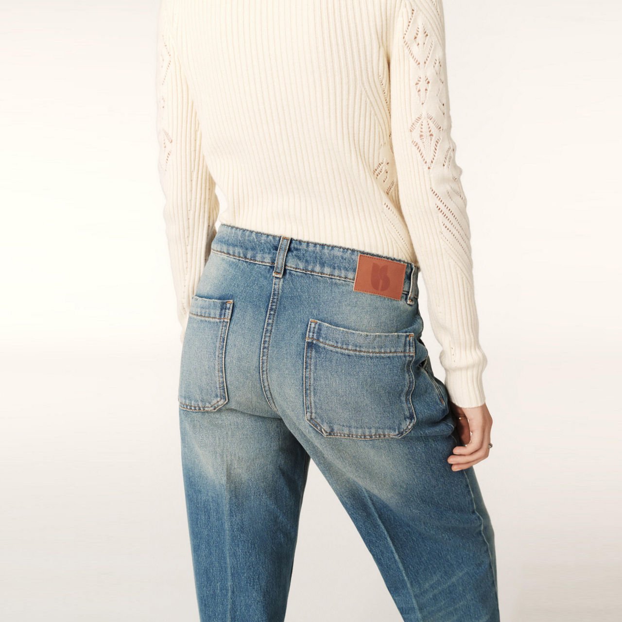 - Low-rise, wide-leg, belt loops, concealed fly and button fastening, two side pockets, two rear patch pockets, clean hems, contrast stitching, embroidered logo detail, distressed-design#