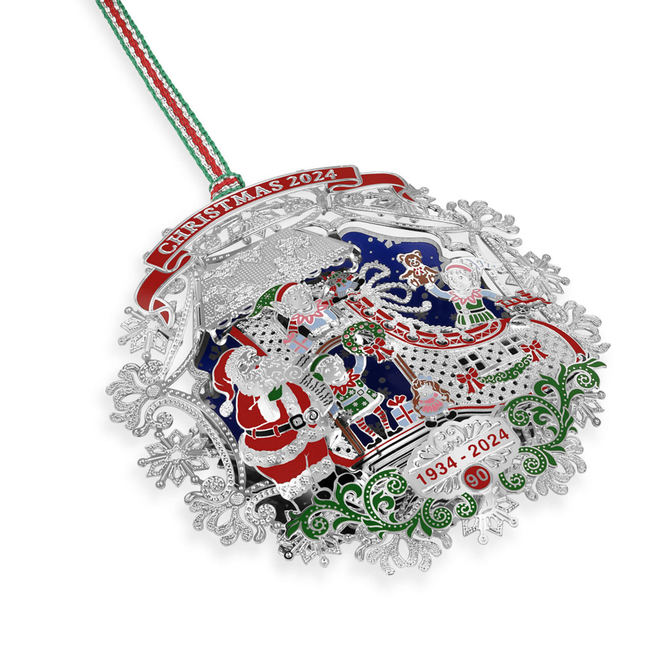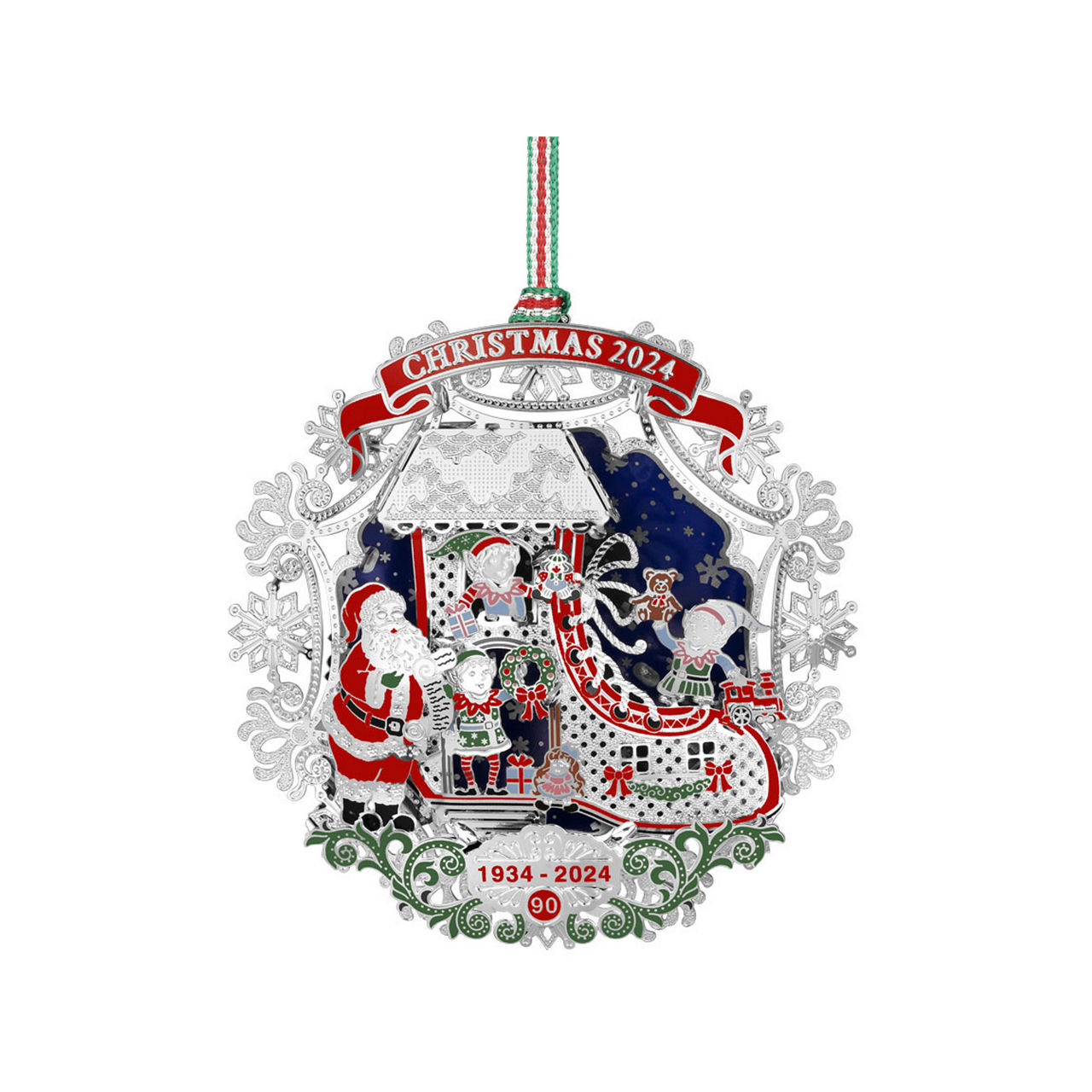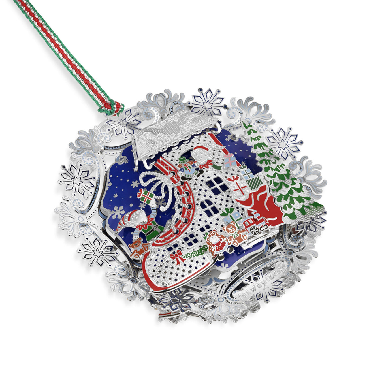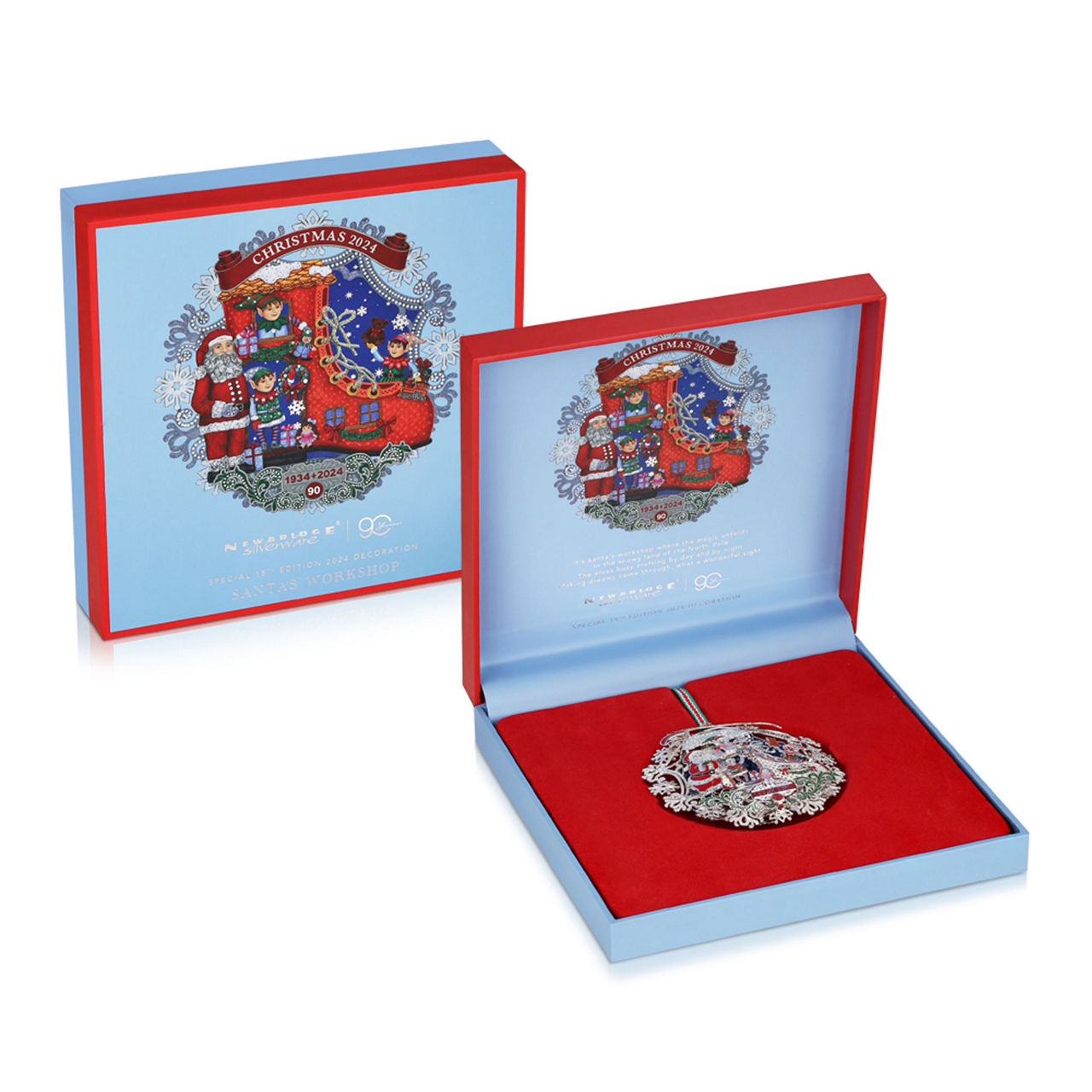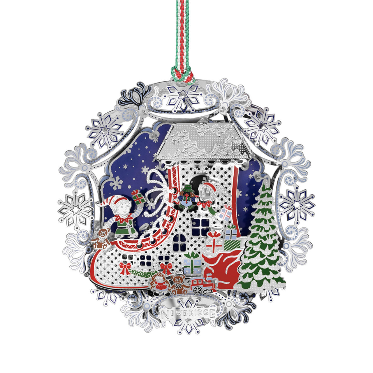 - 3-dimensional, silver plated with a protective anti-tarnish layer, Santa's workshop design, intricate details, festive hanging ribbon, presented in Newbridge Silverware Christmas Collectible Packaging