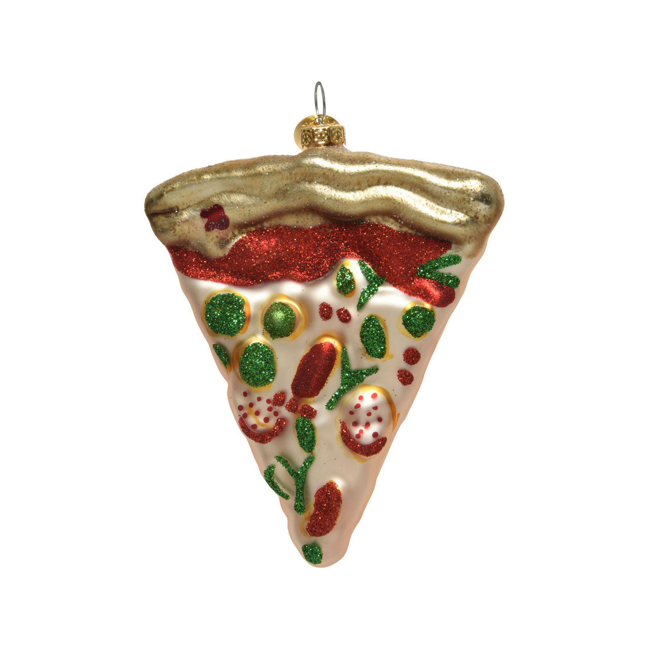 - Pizza slice design, hanging loop, glitter embellishment, matte glass finish