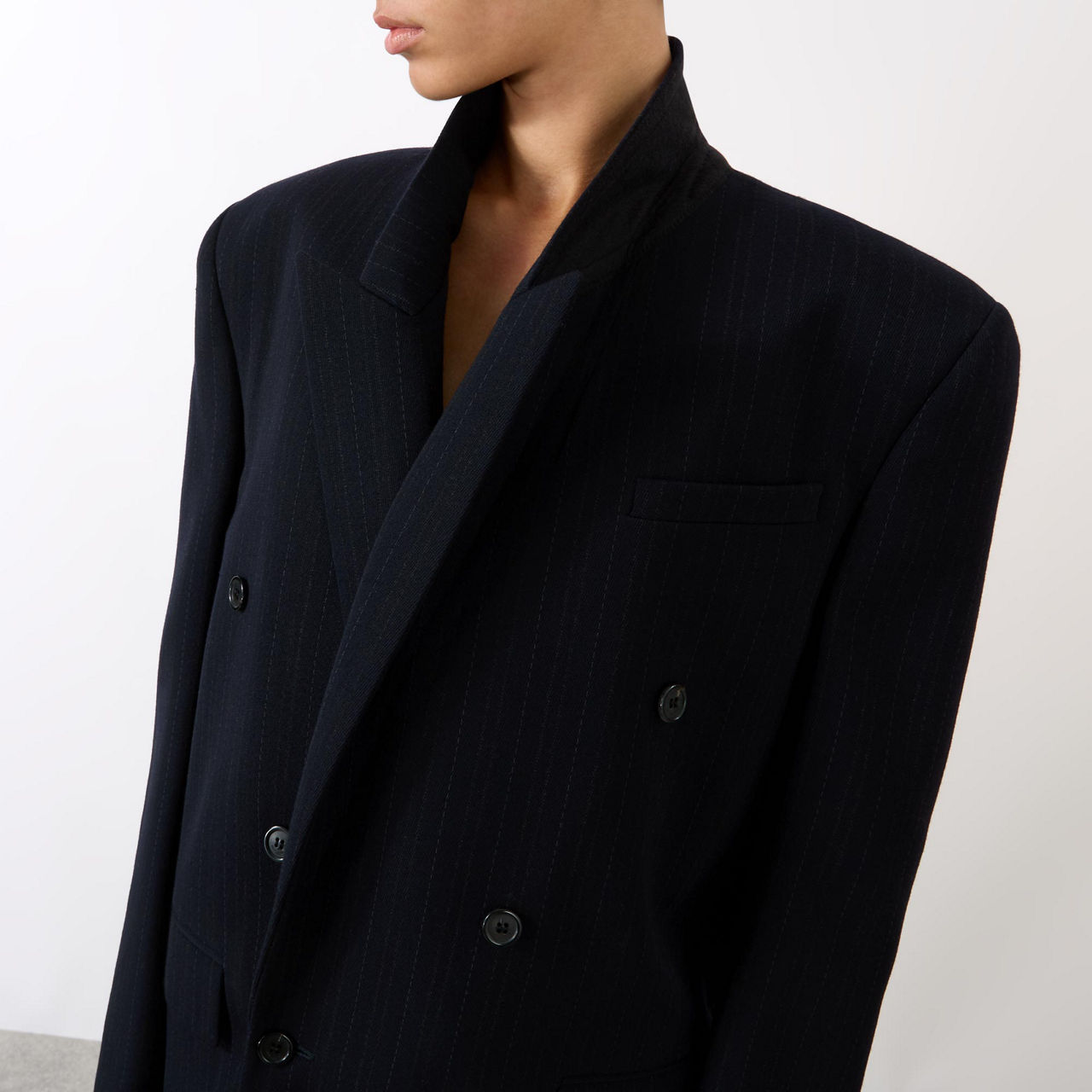 - Double-breasted, pinstripe, six-button closure, pockets, notched lapel, four-button cuffs, padded shoulders, double back vent, lined