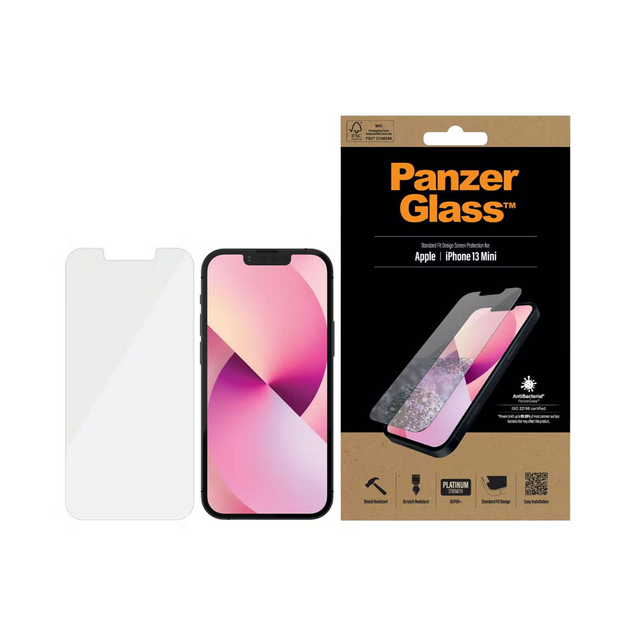 The PanzerGlass screen protector for iPhone 13 Mini with antibactrial coating has the same features as the original PanzerGlass and will protect your screen from scratches and bumps. The Standard Fit glass is reduced in size and features full silicone adhesive which gives perfect touch sensitivity whilst still delivering the superior PanzerGlass strength.