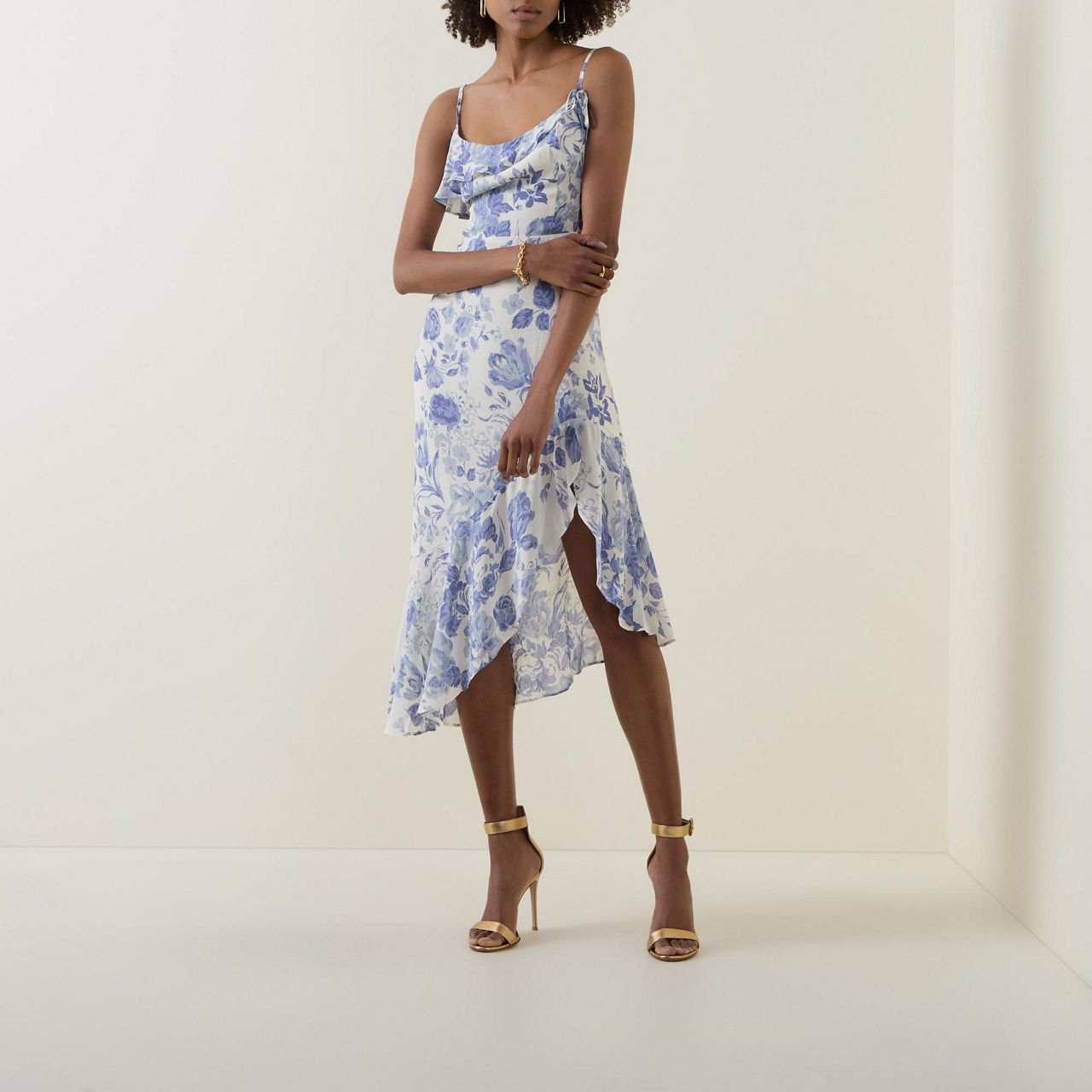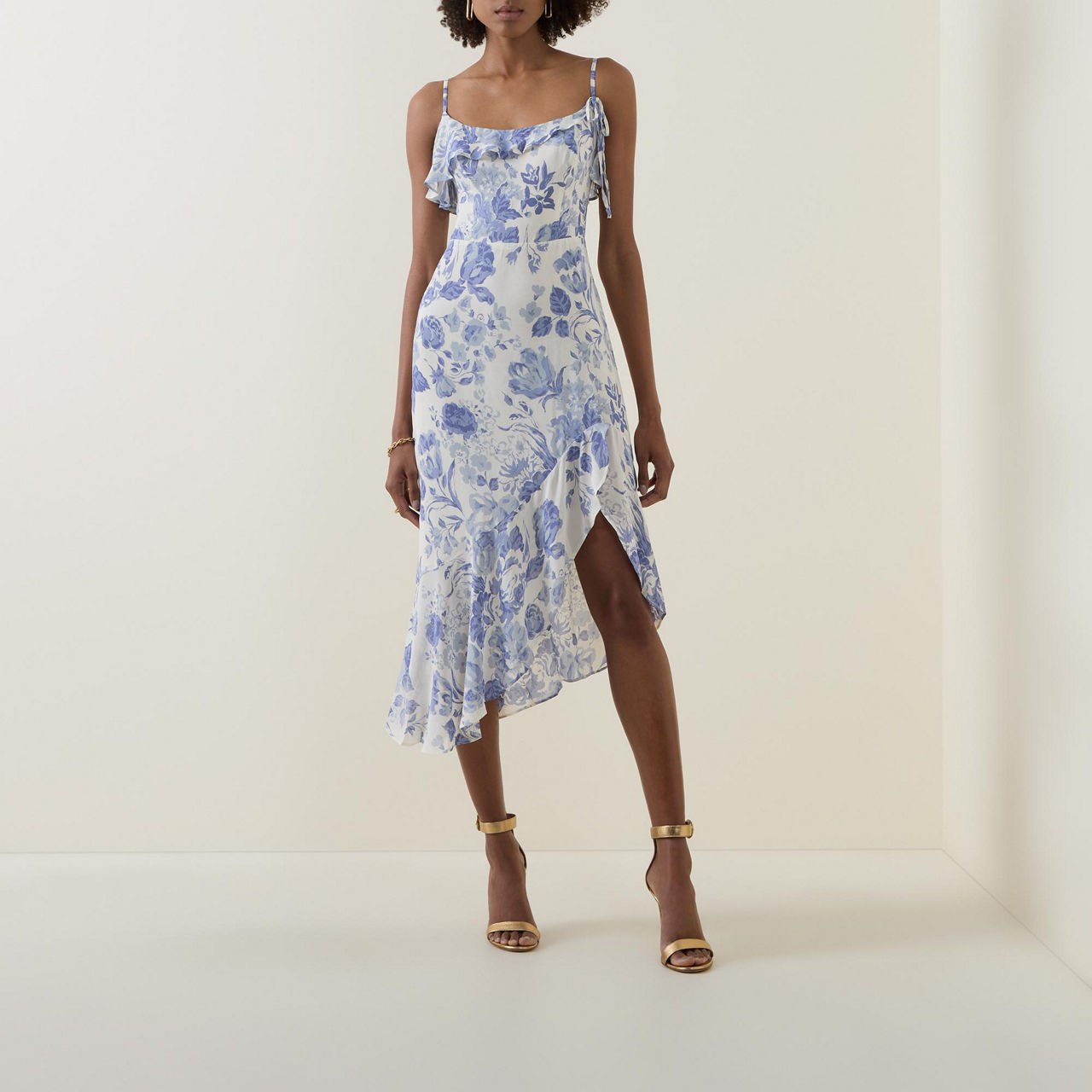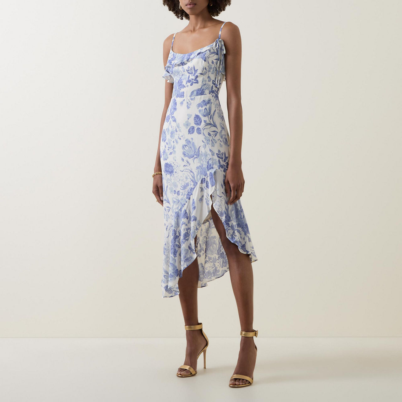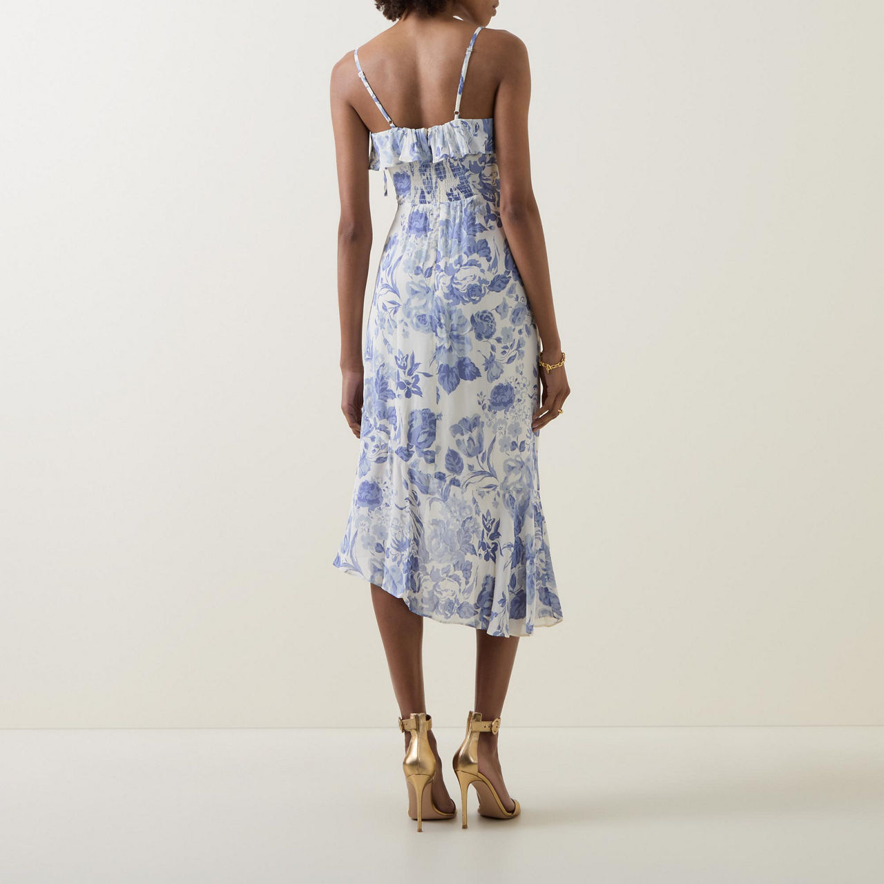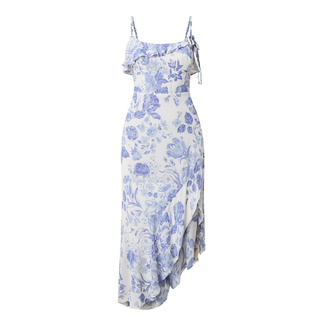 - Asymmetrical hemline, spaghetti straps, ruffled neckline, ruffled hemline, printed, side slits, adjustable straps, smocked detail