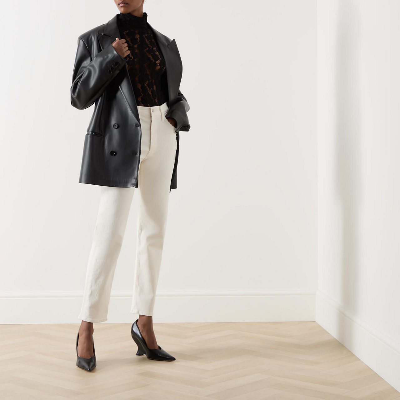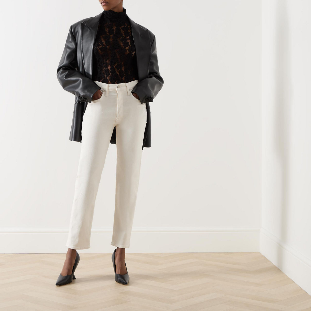 - High-rise, straight leg, belt loops, zip fly and button fastening, five-pocket design, tonal hardware, clean hems, logo detail