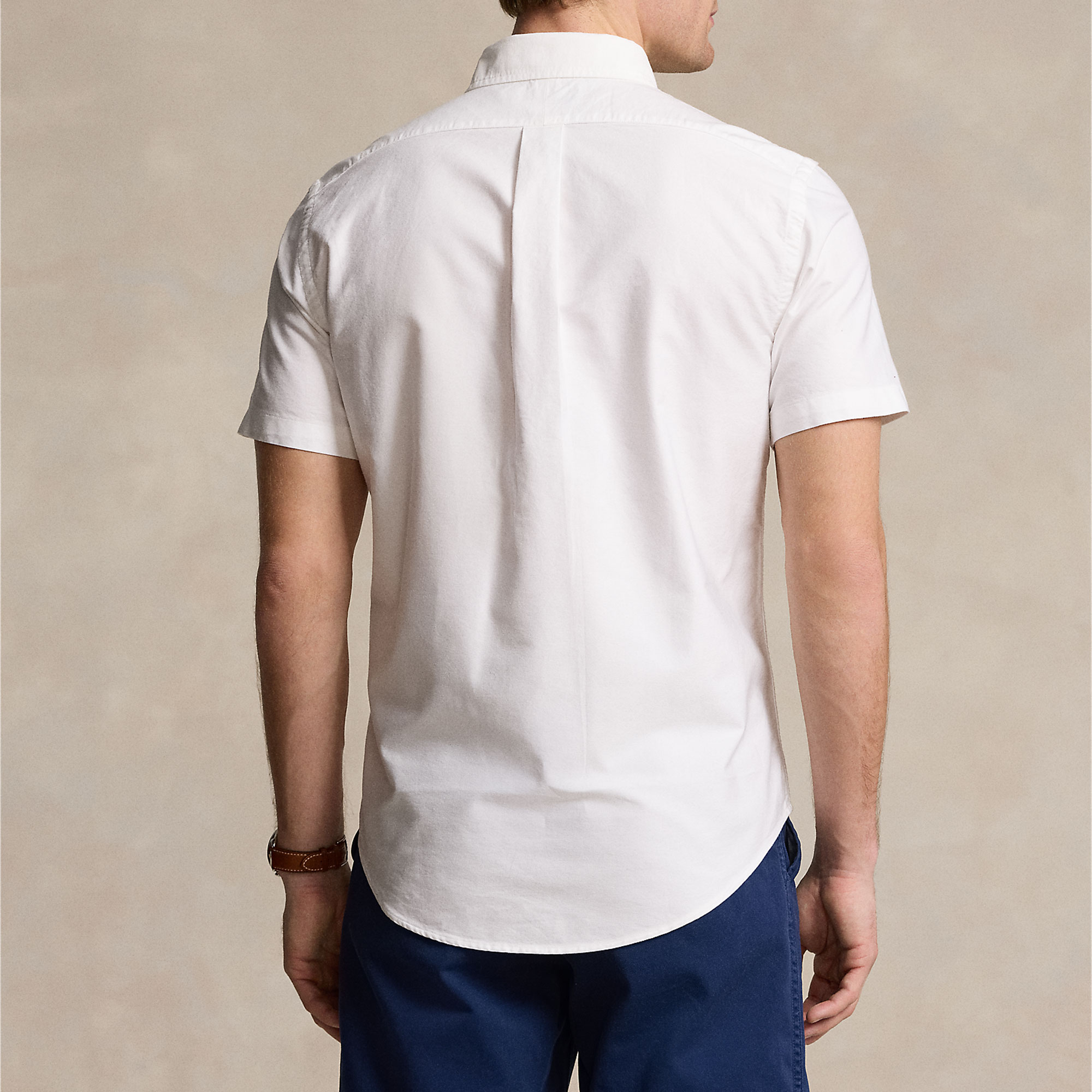 Button-down point collar, buttoned placket, short sleeves, split back yoke, box pleat, signature embroidered Pony logo, Oxford style