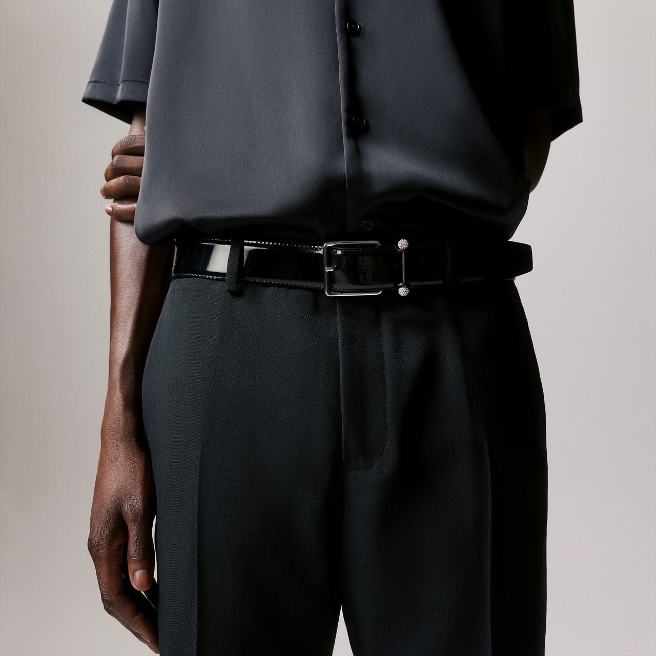 - Smooth calf leather, silver-tone hardware, square buckle, horizontal embellished tie pin detail, adjustable