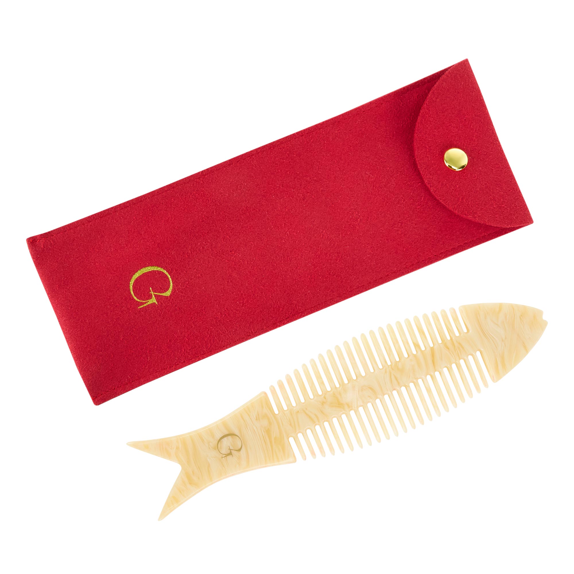 - Sardine design, fine tooth comb, engraved logo detail, comes with a soft protective pouch