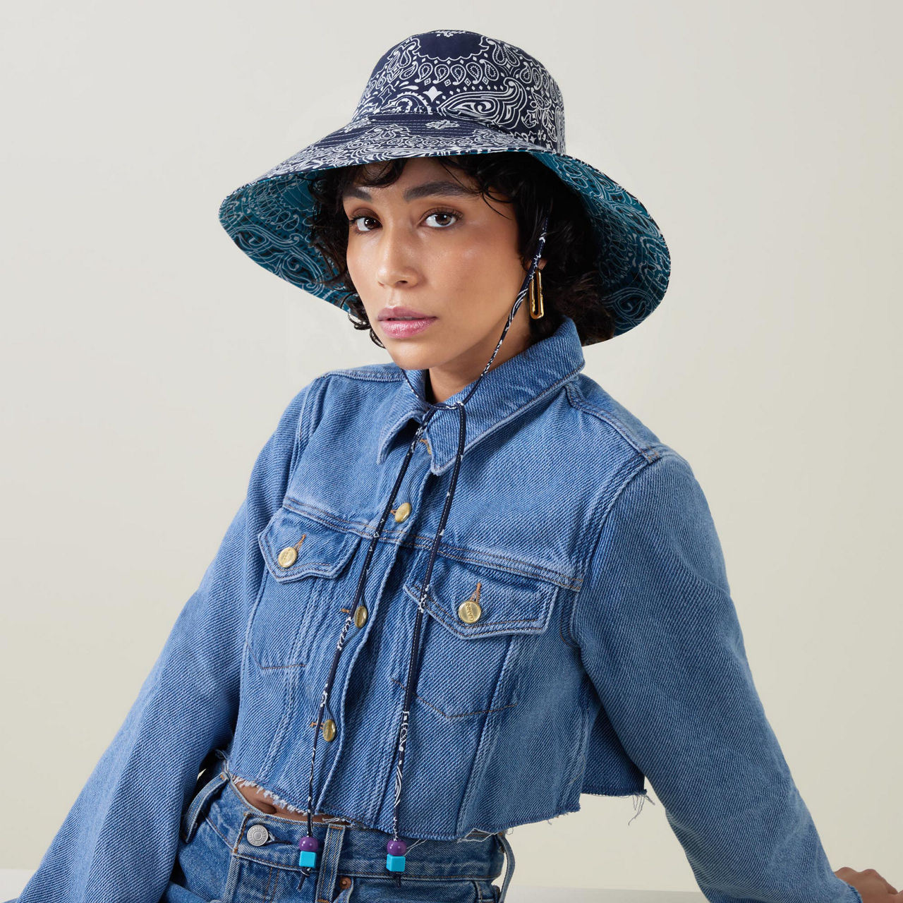 - Wide brim, paisley pattern, contrast stitching, bucket shape, adjustable drawstrings with beads