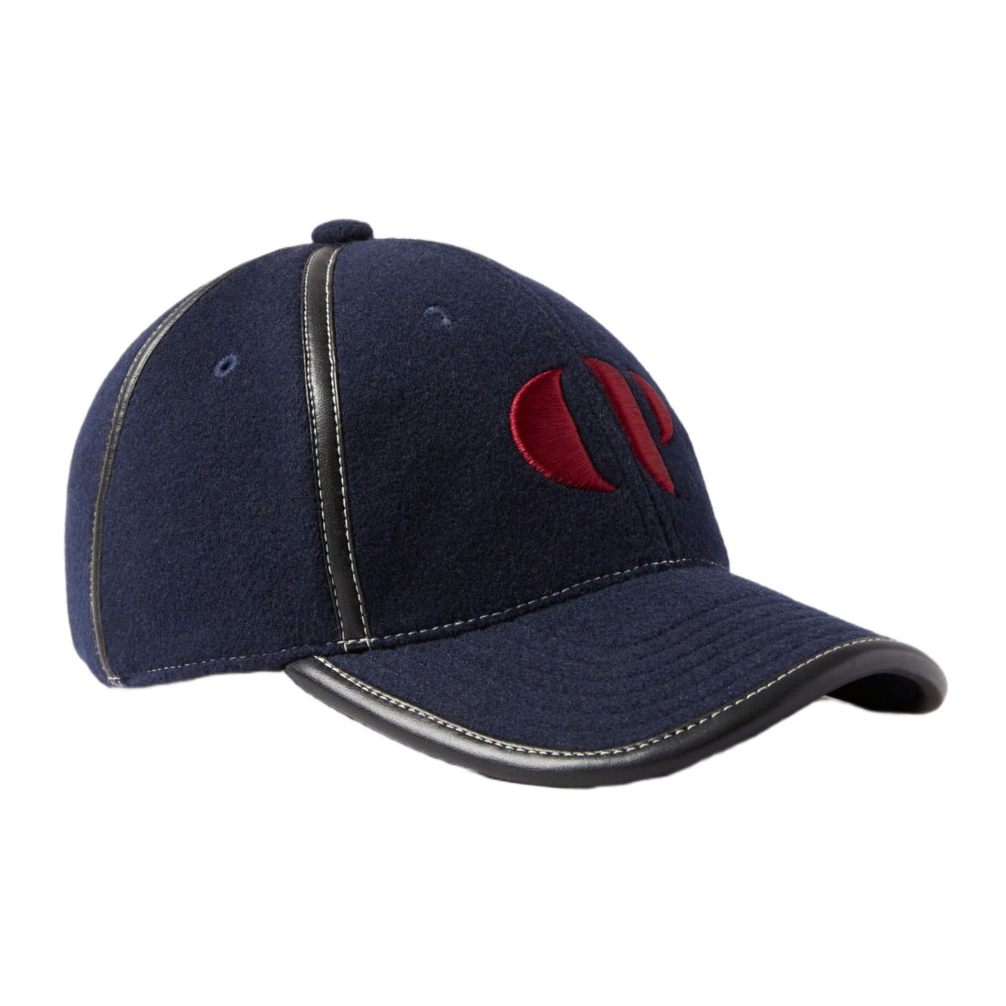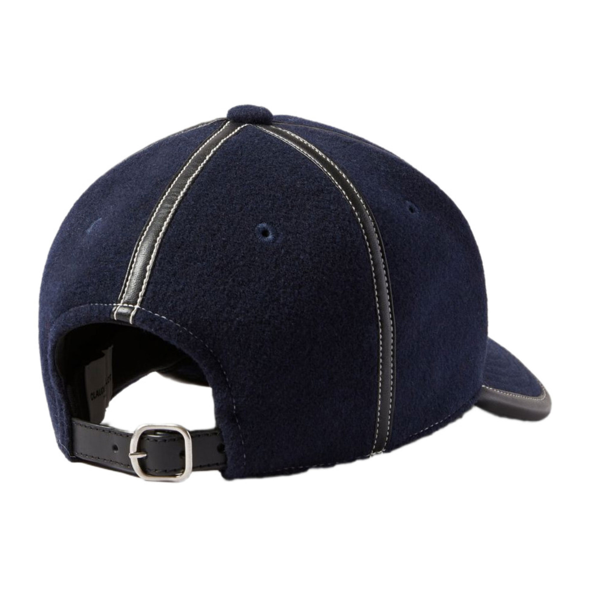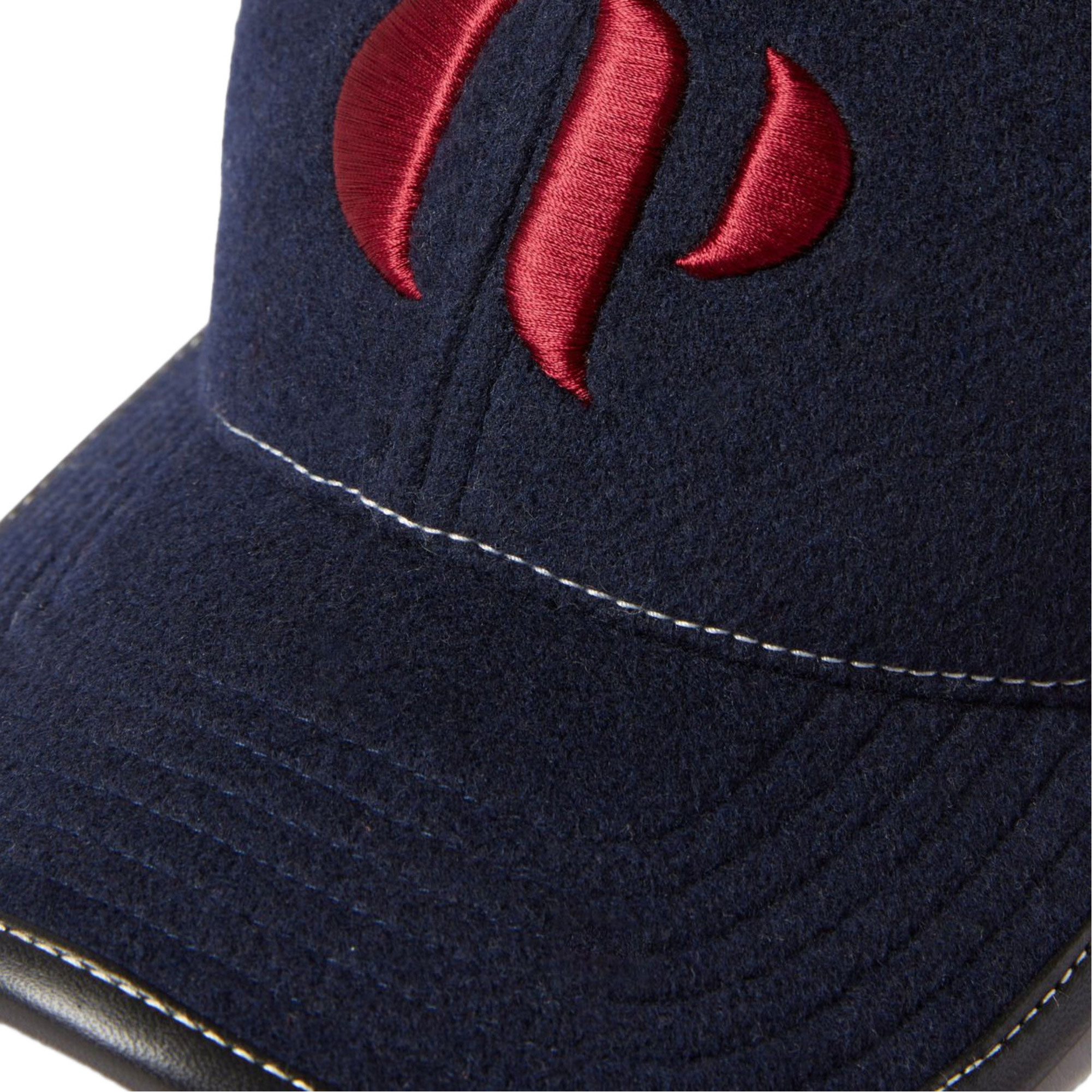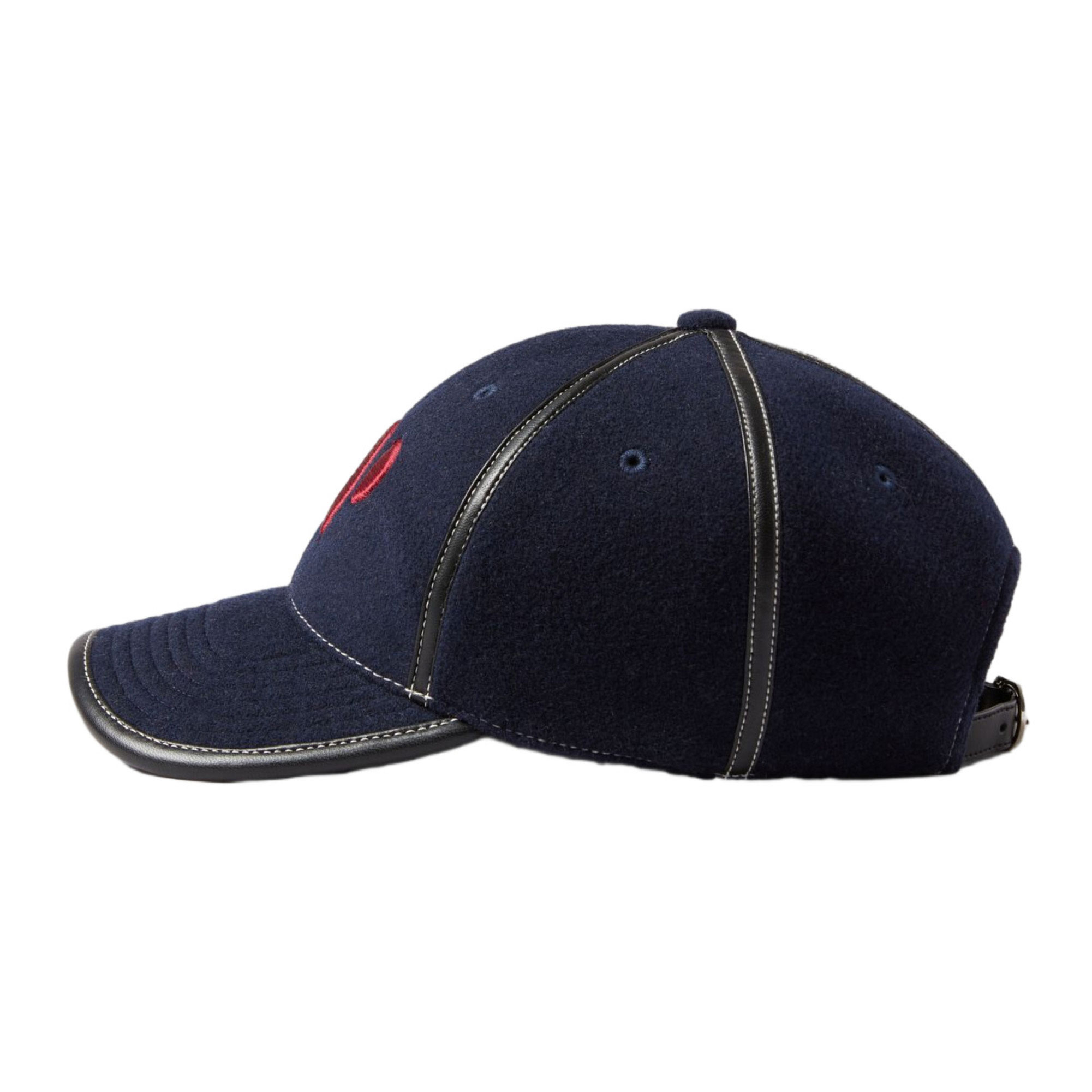 - Stiff peaked cap, contrast stitching details, faux-leather trims, embroidered logo detail, adjustable buckle closure to back