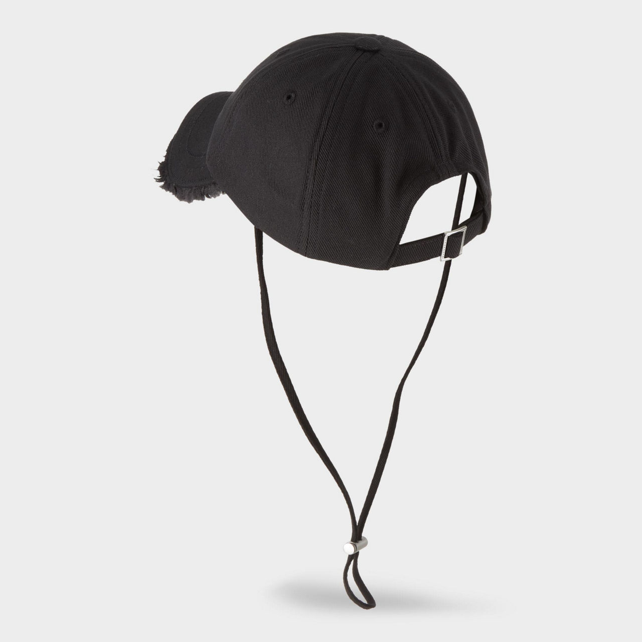 - Peak visor, topstitched brim with frayed edges, adjustable strap with metal stopper, long adjustable strap, silver-tone metal logo detail, weather-resistant