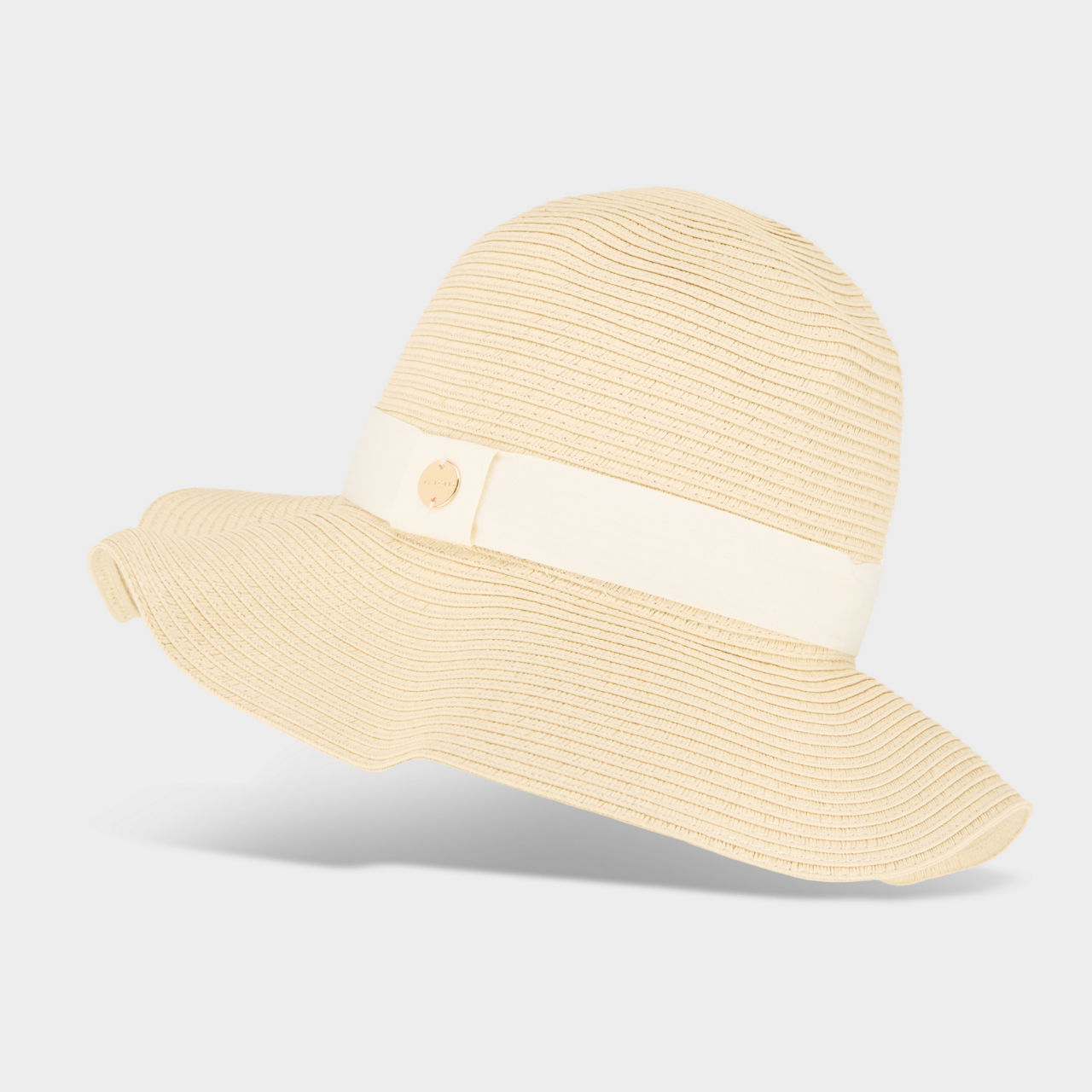 - Woven structure, wide brim, ribbon detail, logo hardware, collapsible