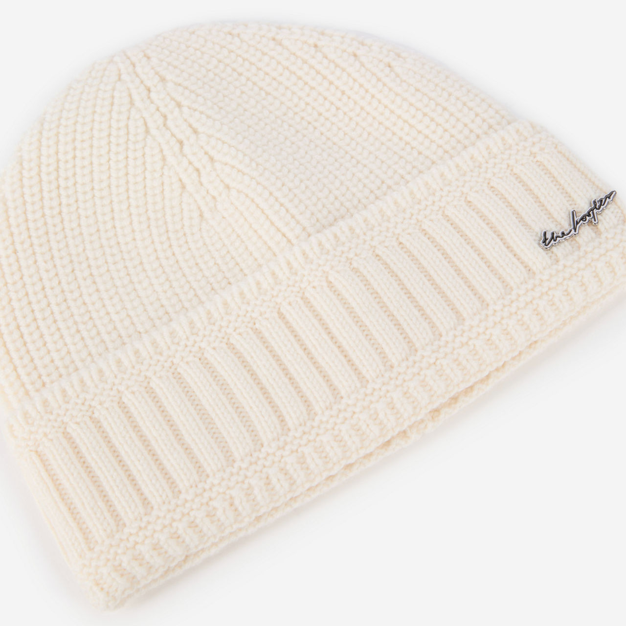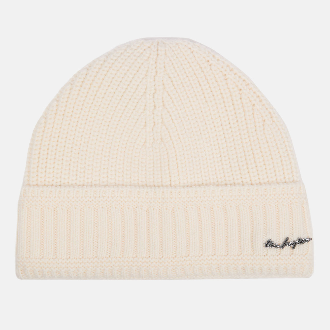 - Ribbed merino wool construction, round beanie style, fold-over cuff, logo pins