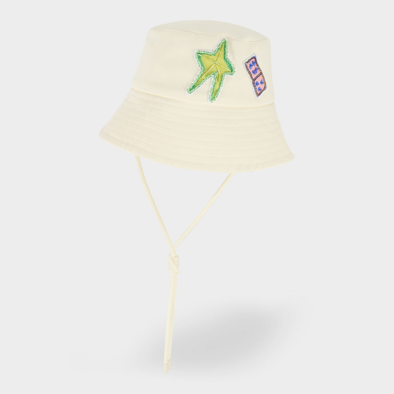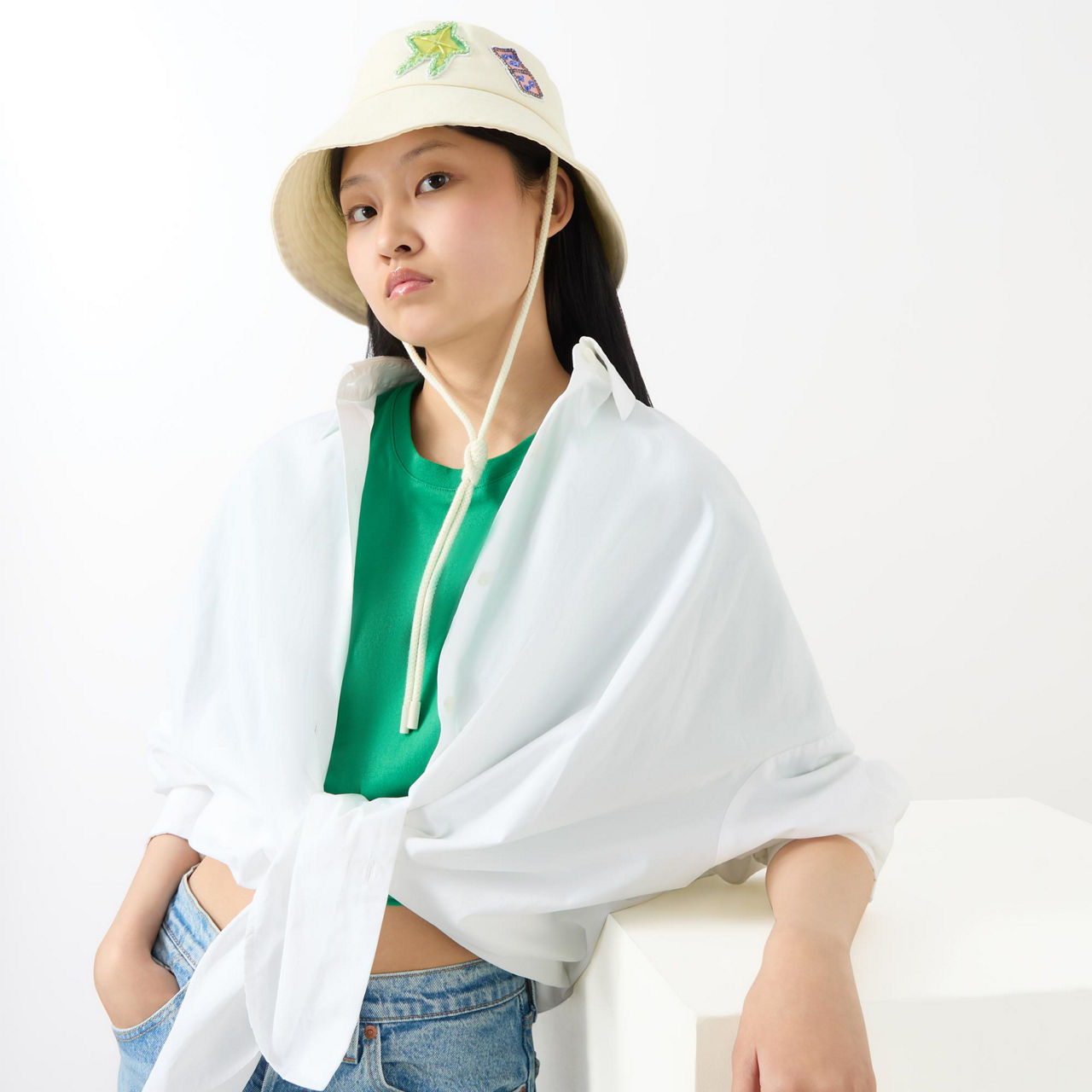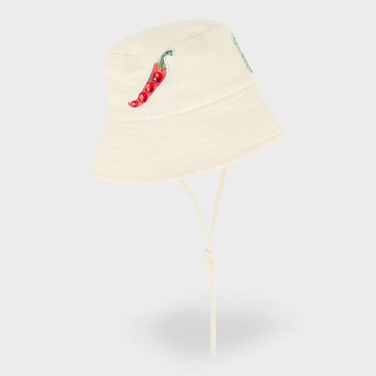 - Embroidered bucket hat, top-stitch detailing on brim, all-over embellished design, self-tie neck fastening