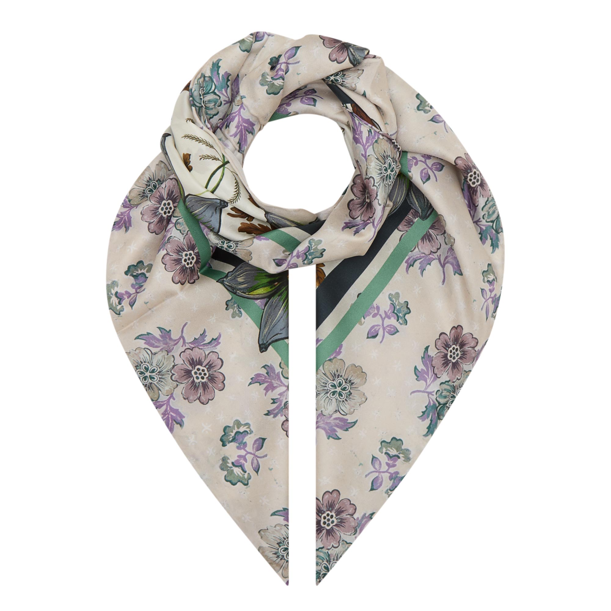• Square shape, contrast border, floral pattern, logo details, smooth silk finish, stitched edges