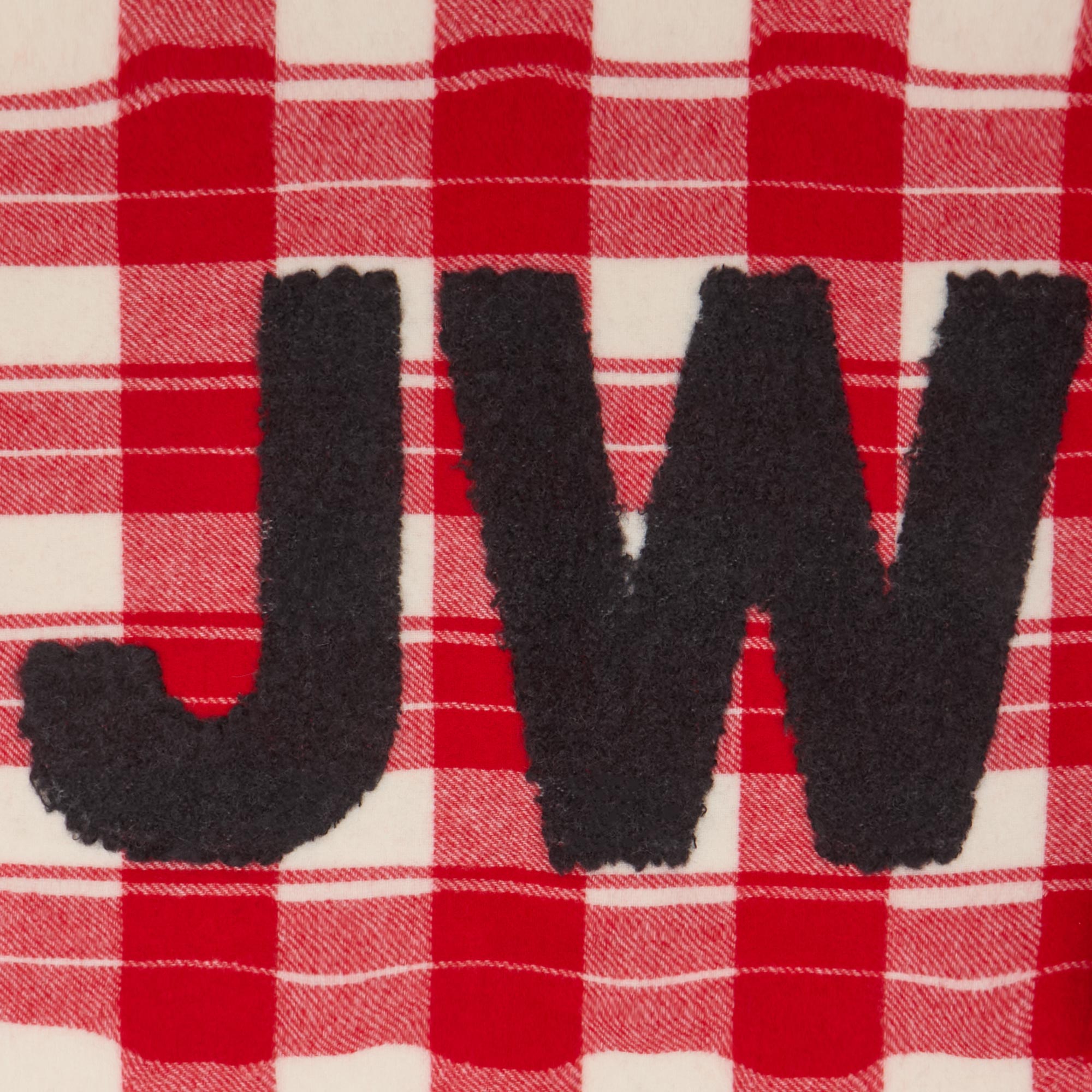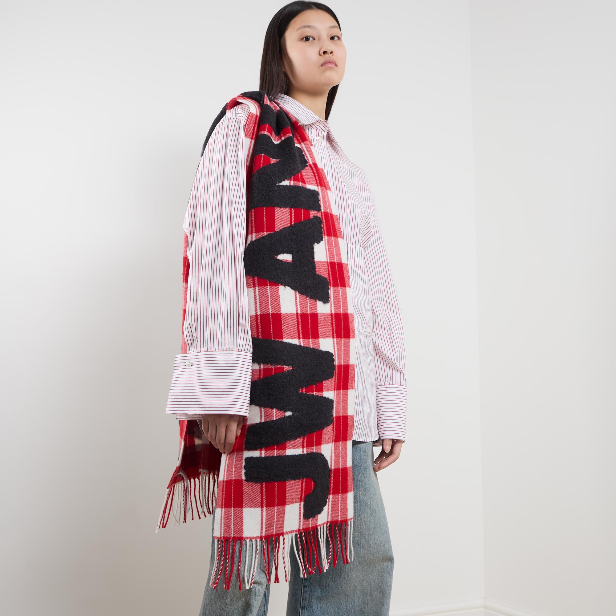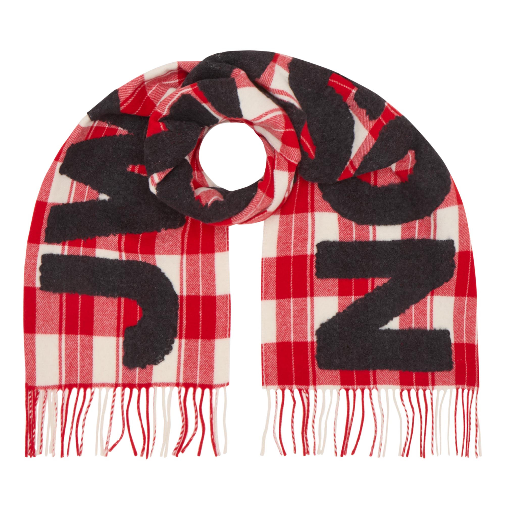 - Wrap design, fringed tassels, big logo lettering, check pattern, smooth fabric