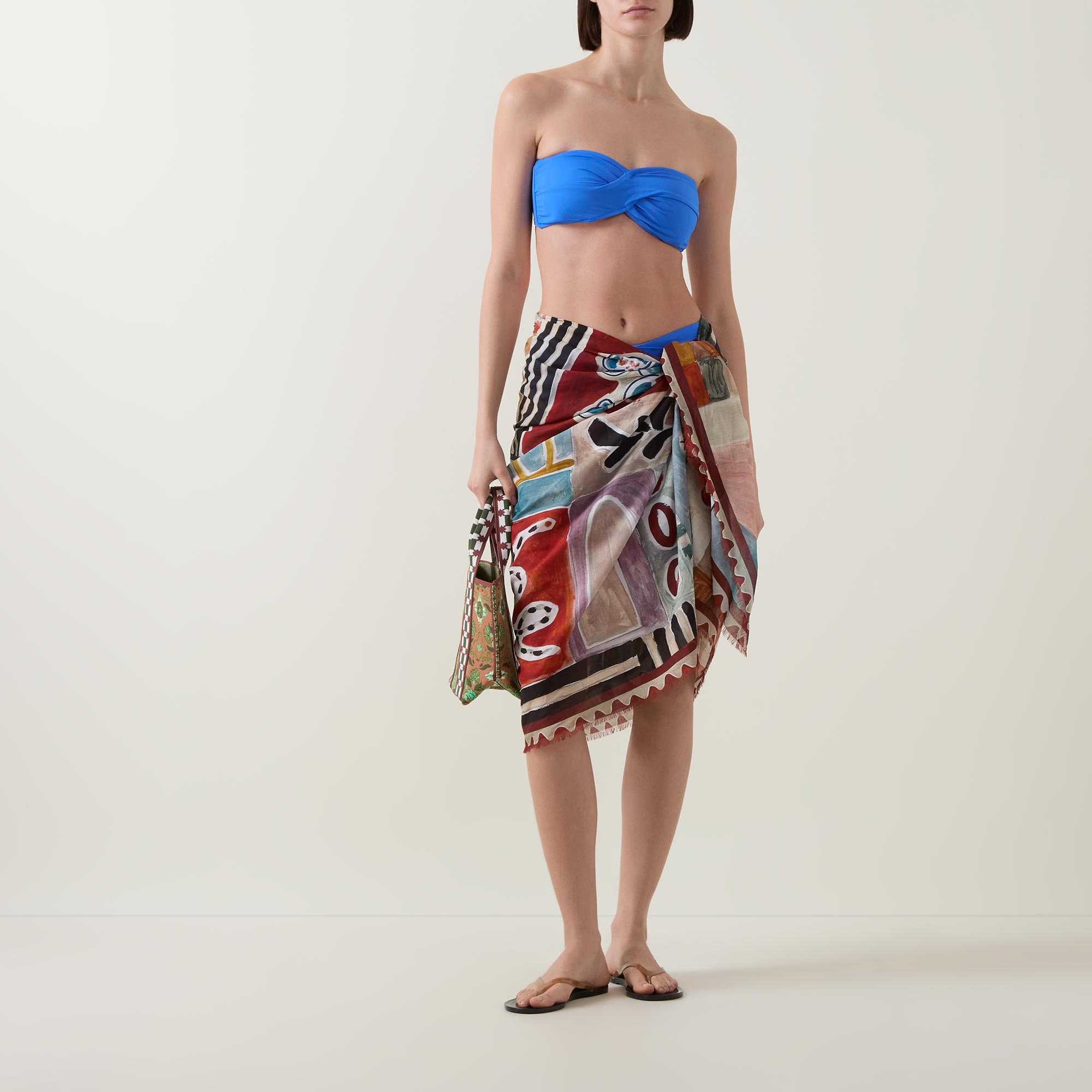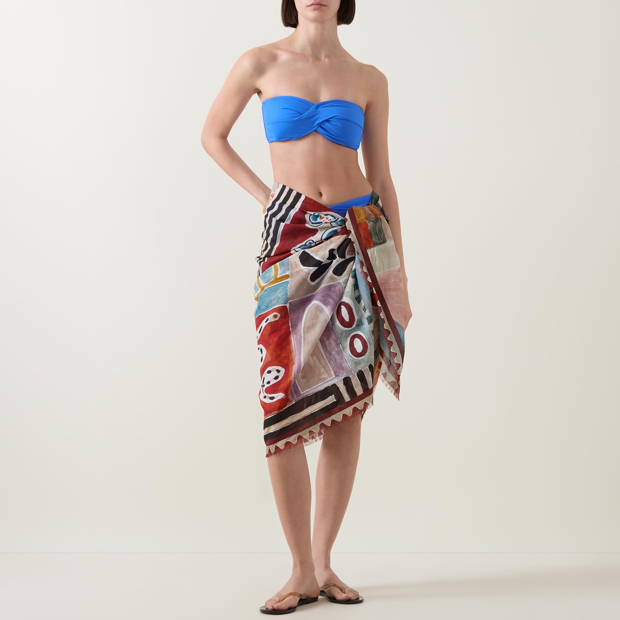 - Wrap style, bold colours, printed design, fringed edges, logo branding, smooth silk finish