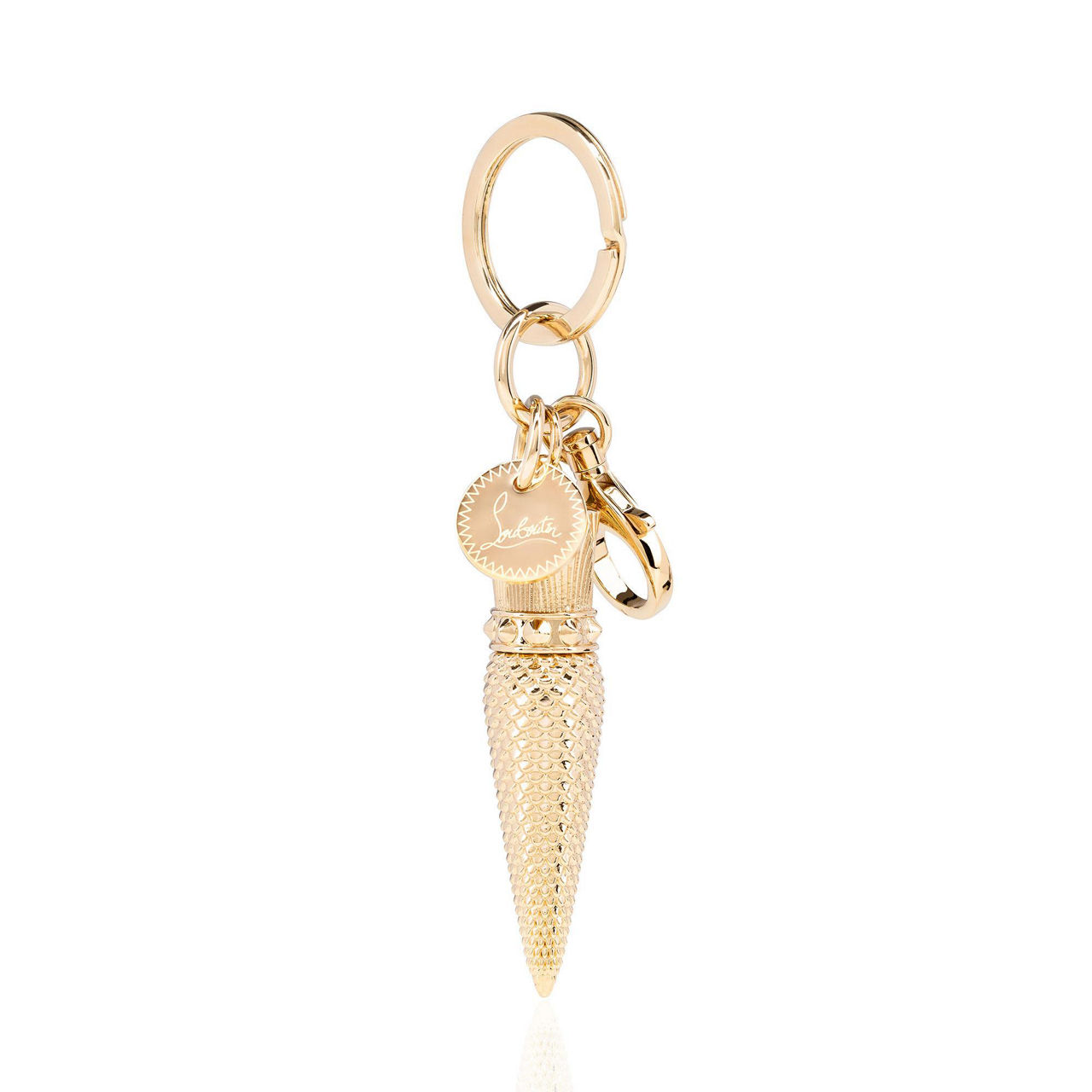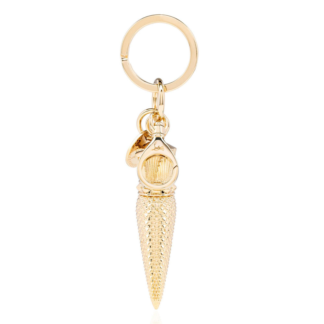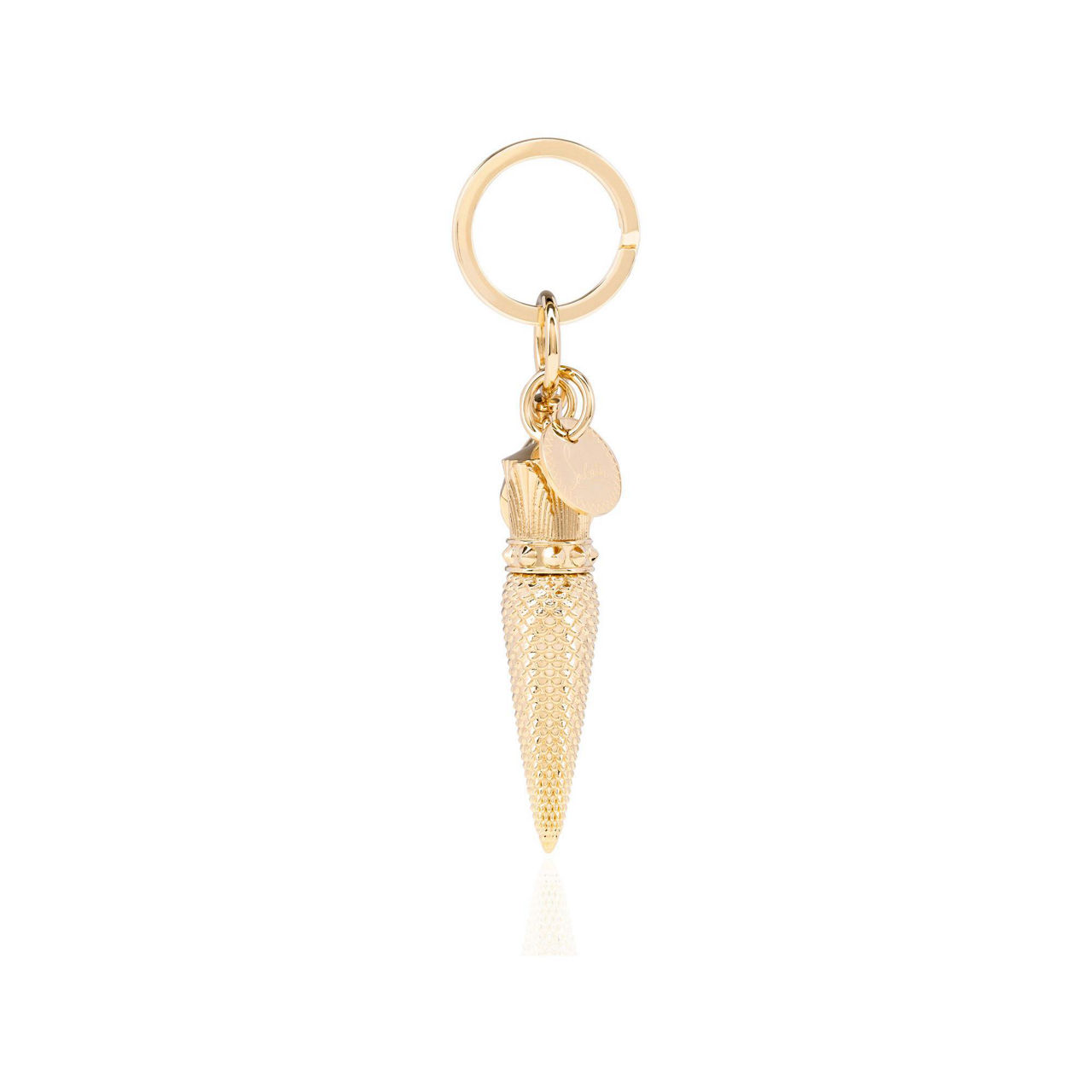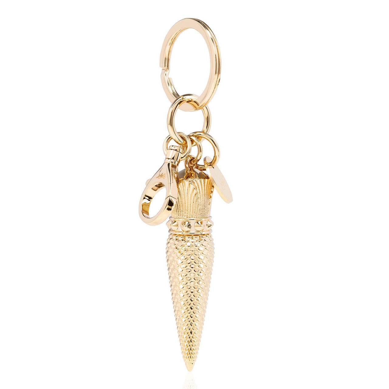 A gleaming addition to your keys, this gold tone keyring from Christian Louboutin presents in the brand's lipstick case silhouette with a monogram embossed charm detail.