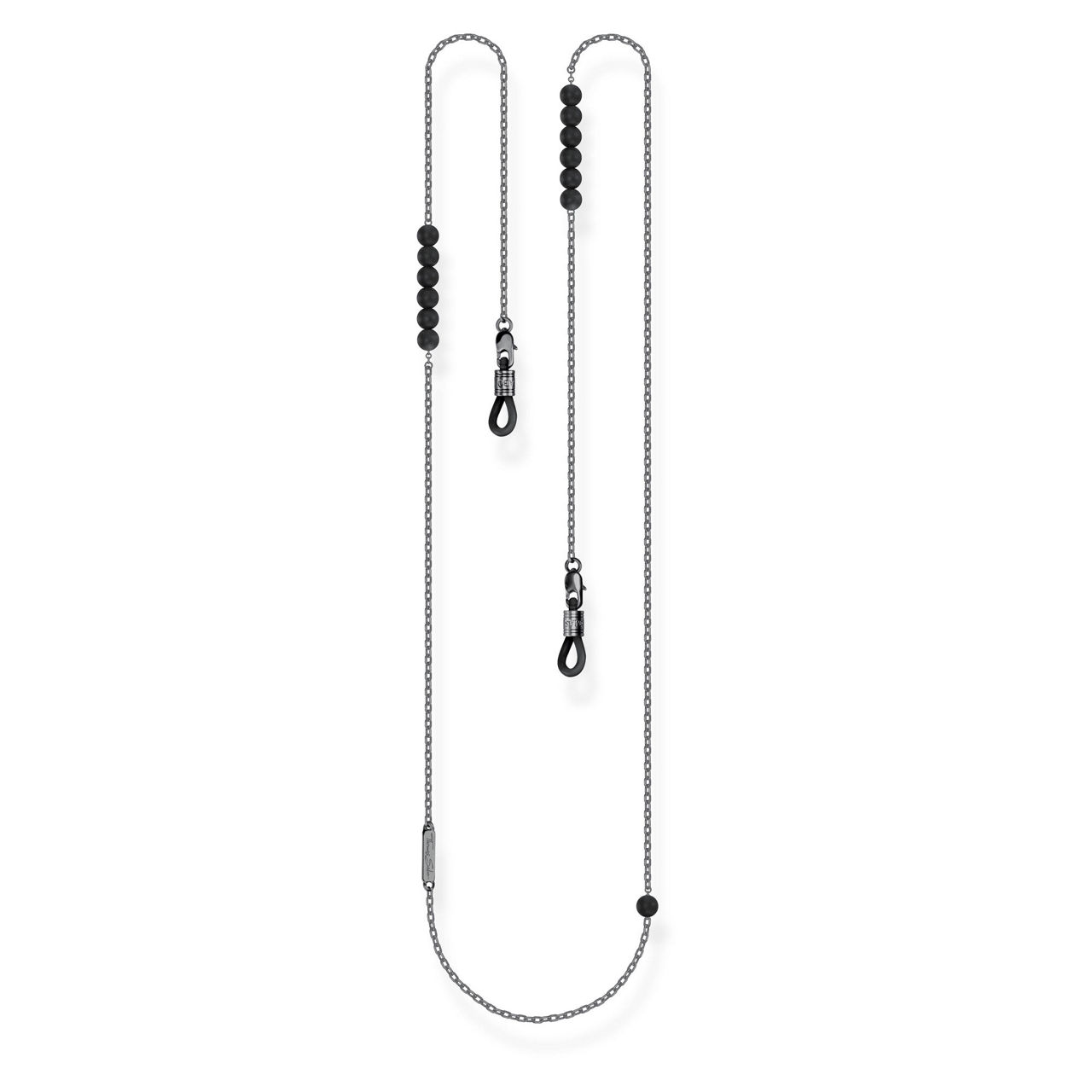 • Black metal glasses chain, matt black obsidian bead detailing, silicone loops, movable metal elements, brand logo details, lobster claps fastenings