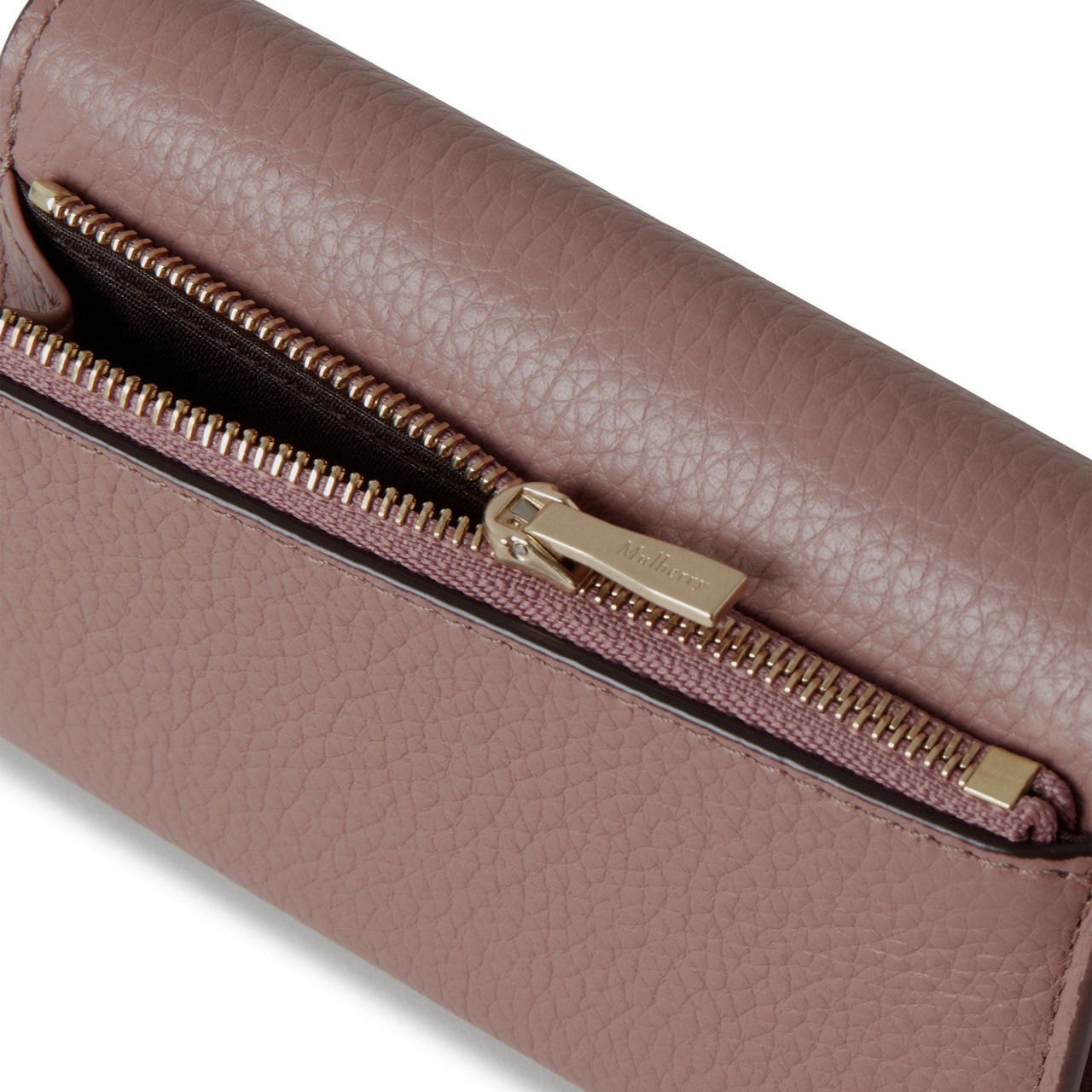 - Foil-embossed Mulberry signature, one zipped compartment, soft gold-tone hardware finish, nappa lining with moire detailing
