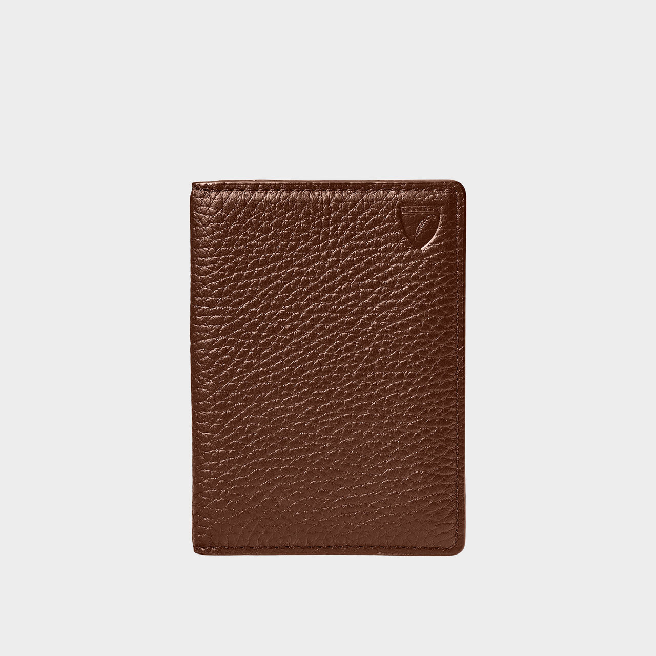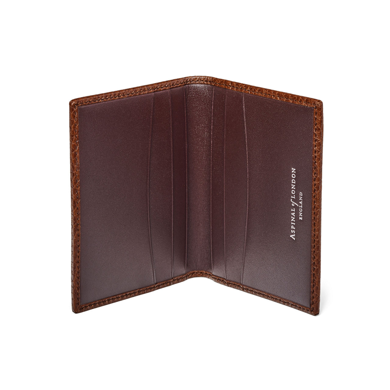 - Fold-over design, six card slots, lined, grained leather texture, lined, slimline, logo lettering