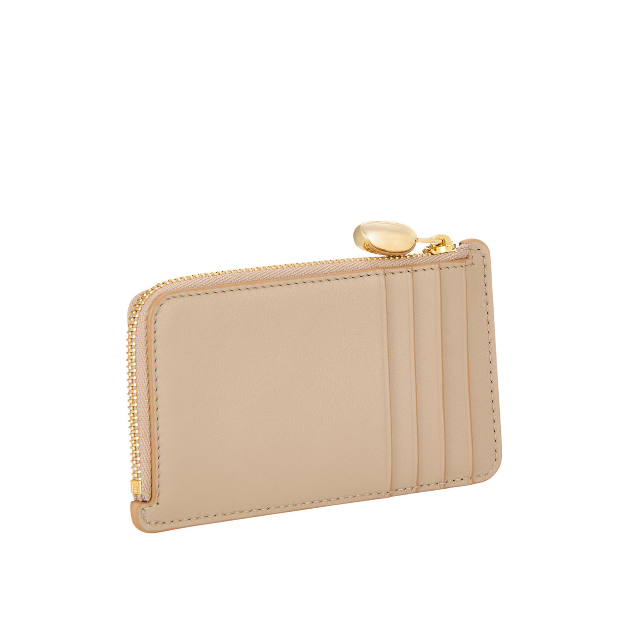 - Four card slots, one zipped compartment, embossed logo, engraved monogram, stitching edging