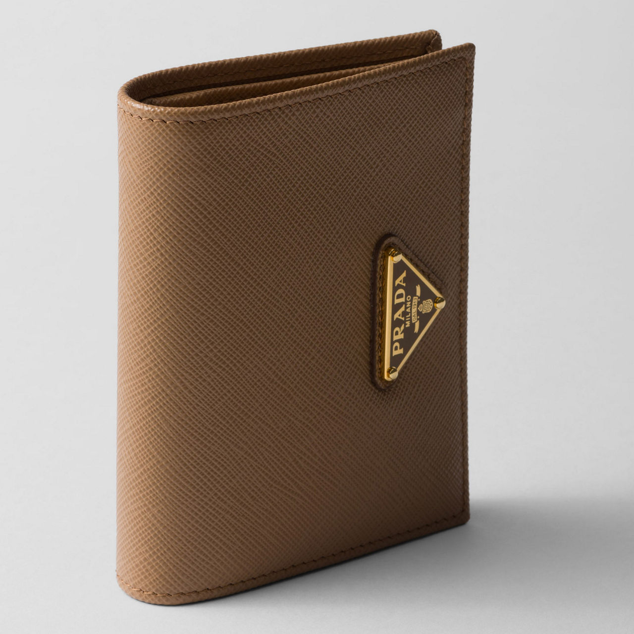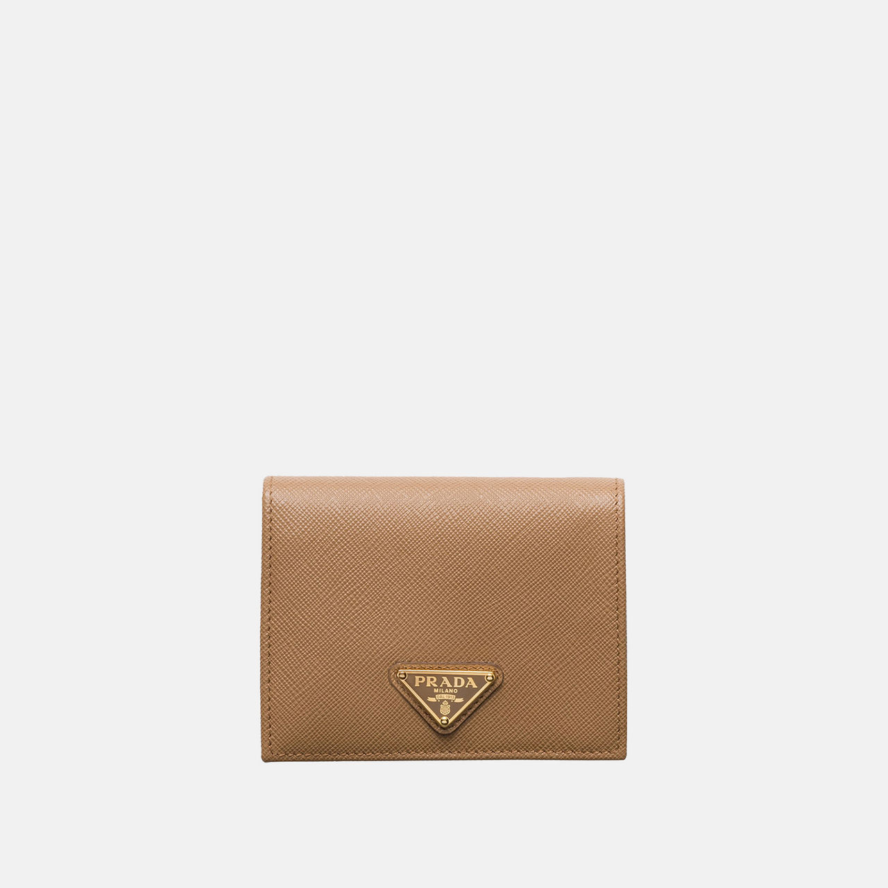 - Snap fastening, enamelled metal triangle logo, gold-tone hardware, fold-over style, moiree and saffiano leather lining