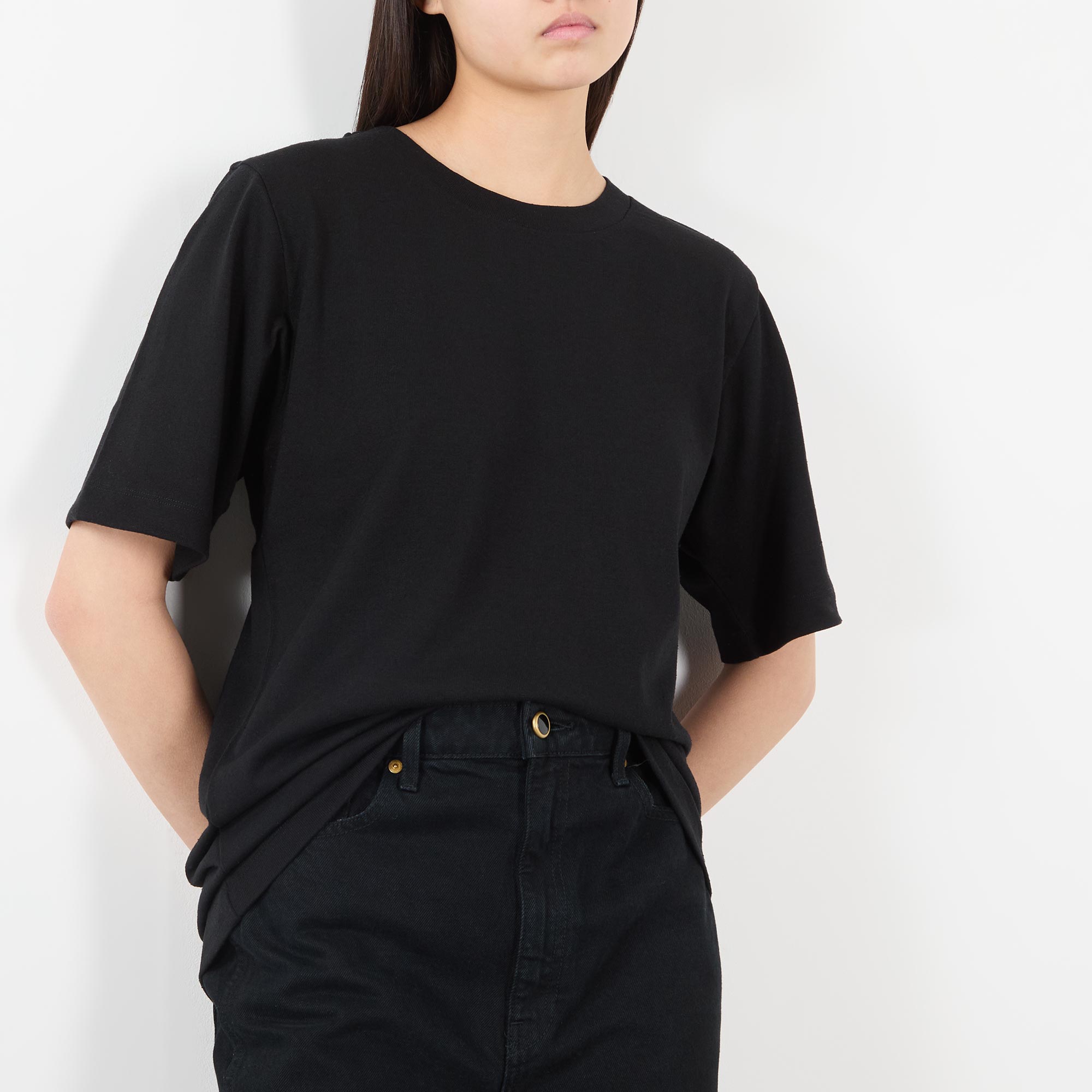 Minimalistic styles feature across the SS26 collection from Khaite, like the Allen t-shirt. Cut from a silk jersey, it features a scooped round neckline and elbow-grazing sleeves. Perfect for styling with your favourite denim.