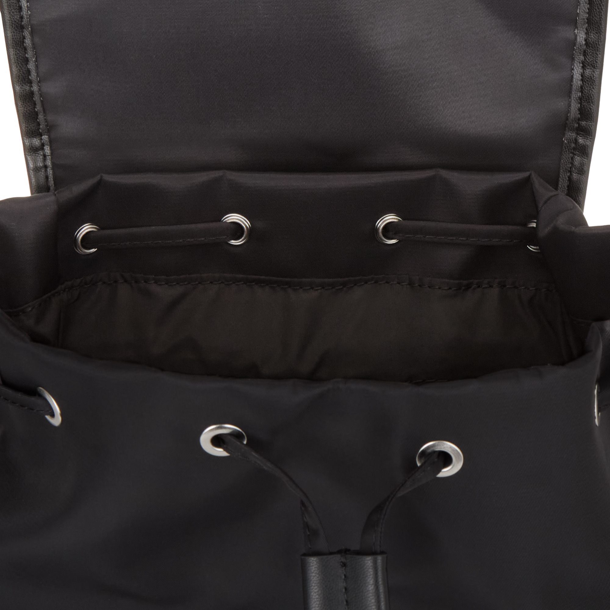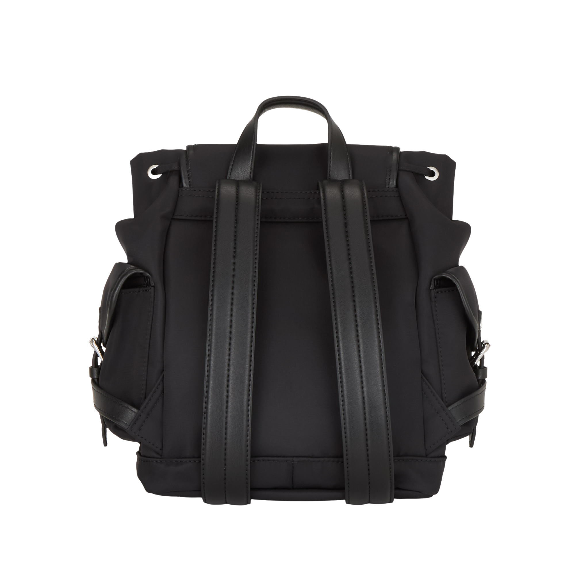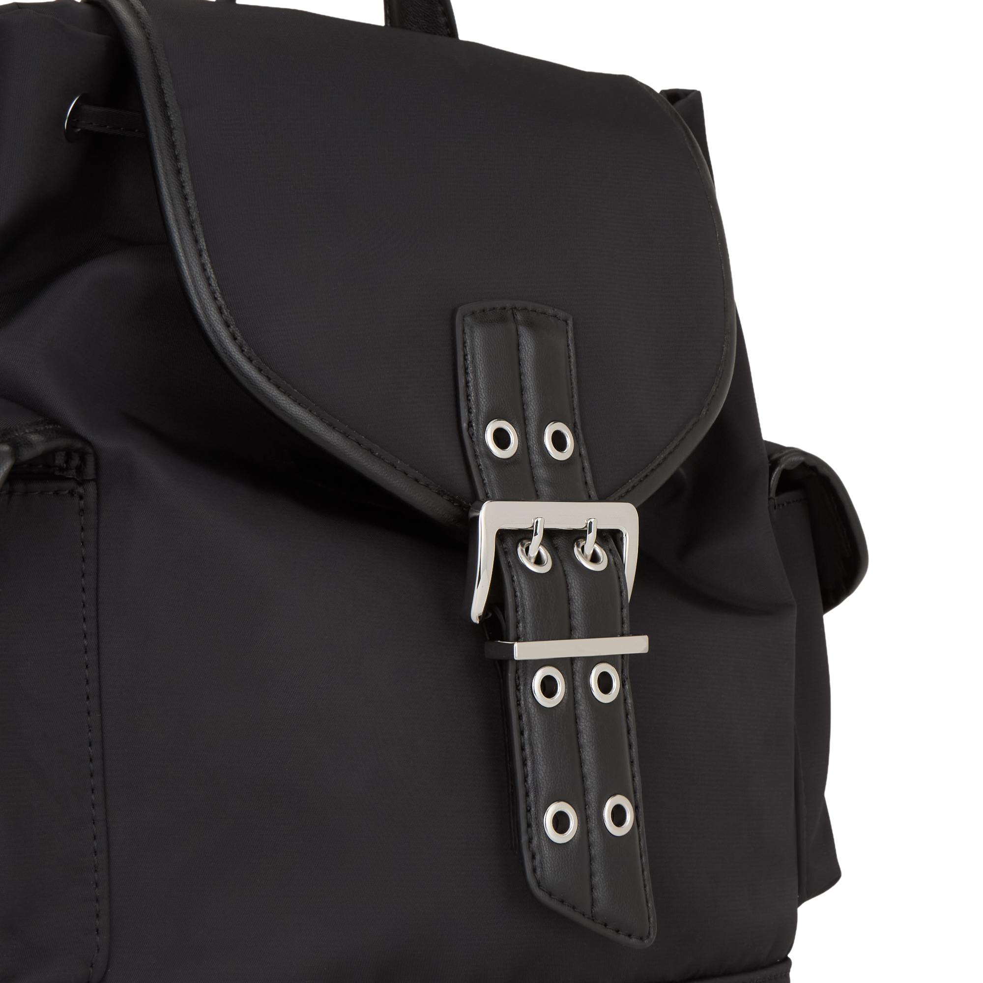 - Top carry handle, adjustable straps, drawstring fastening, front flap with buckle fastening, side flap pockets with buckle fastenings, logo lettering, silver-tone hardware
