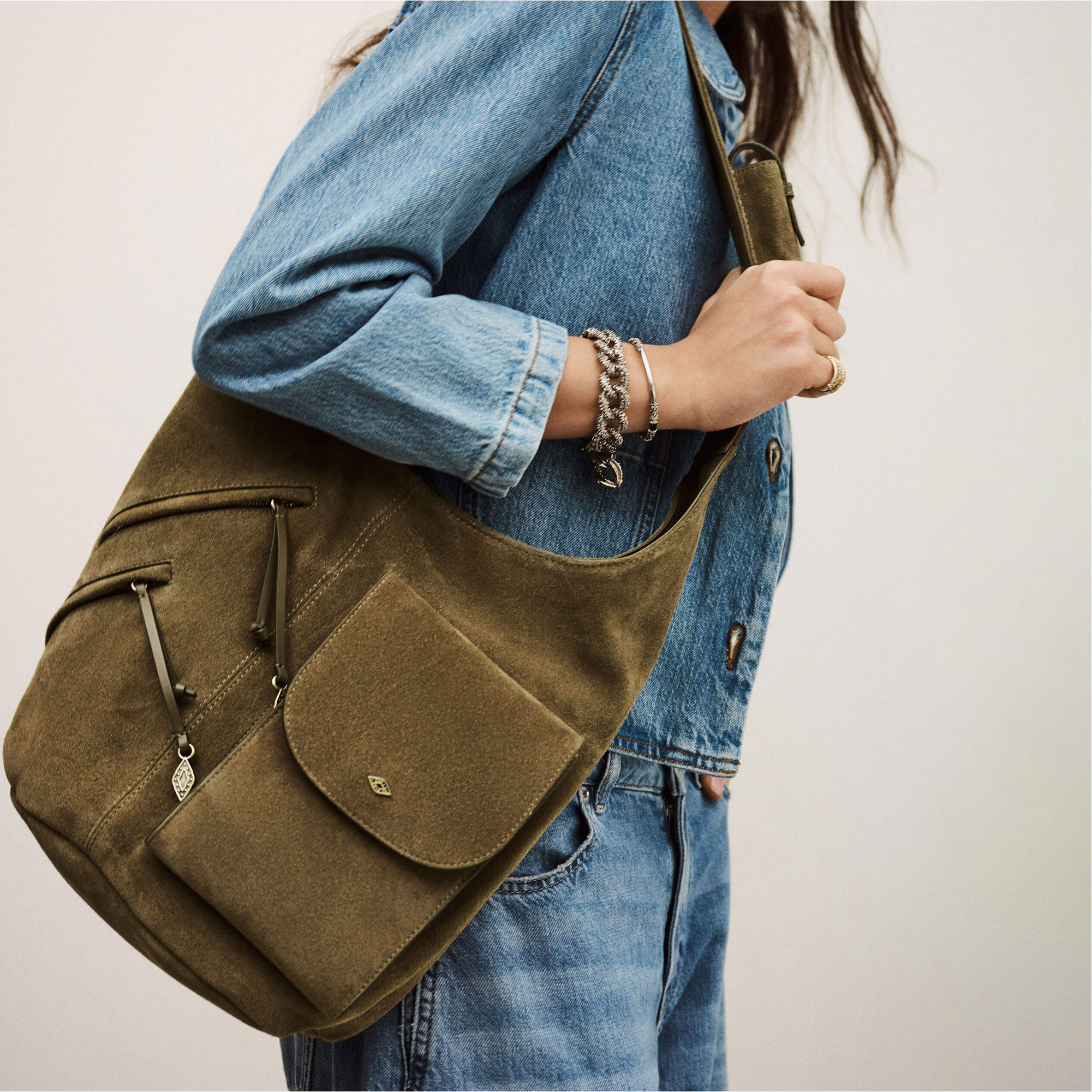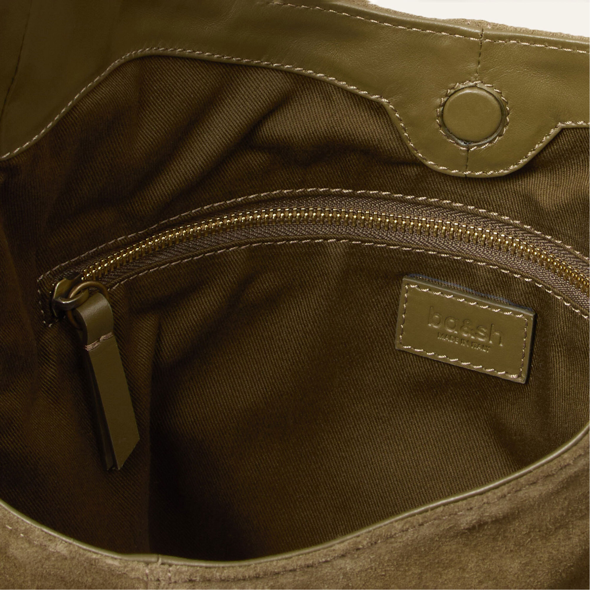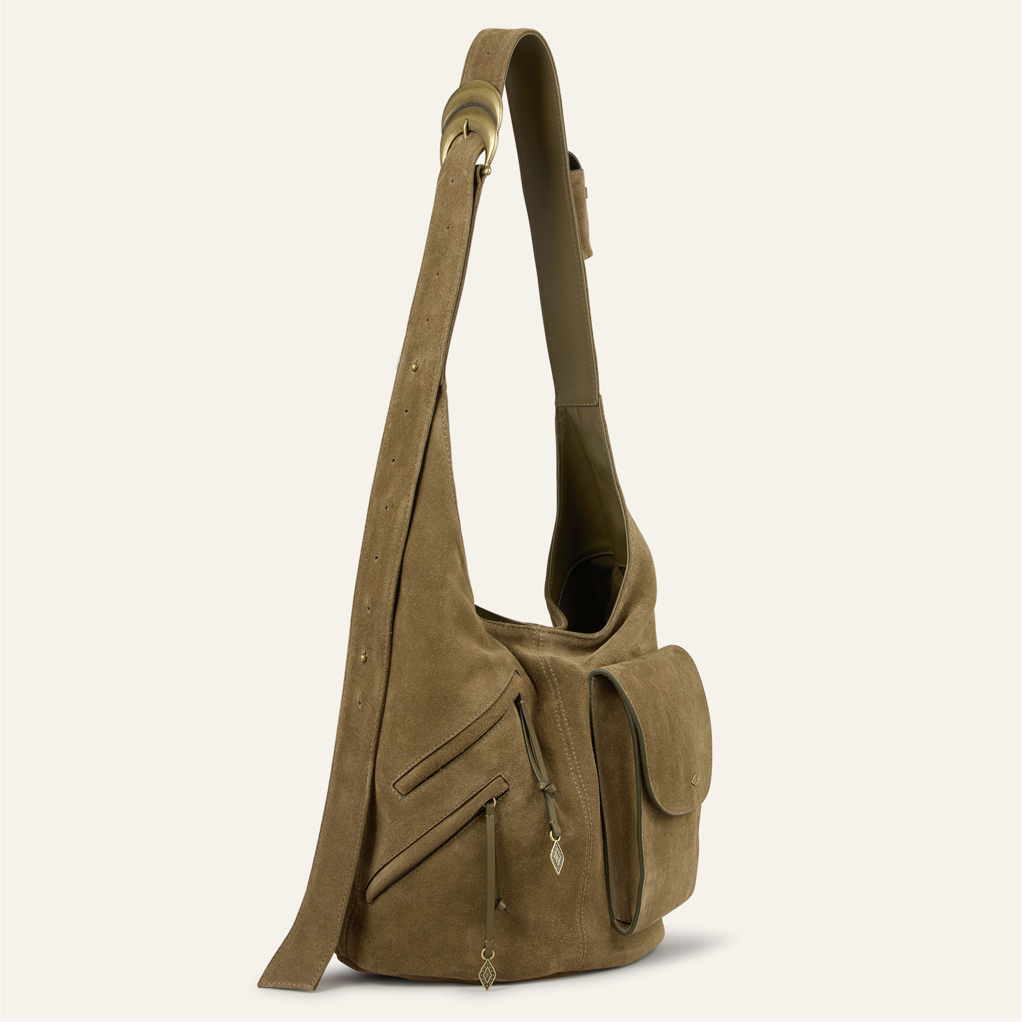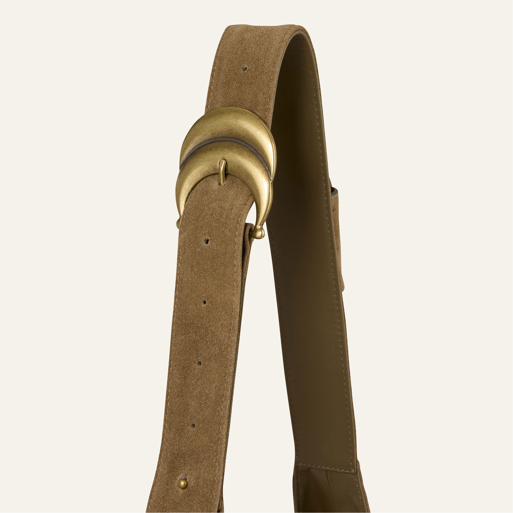 • Slender silhouette, wide adjustable handle, crescent-shaped buckle, double metal buckle, iconic metal hardware, diamond-shaped inserts, logo details, concealed press-stud fastening, external pockets, leather construction