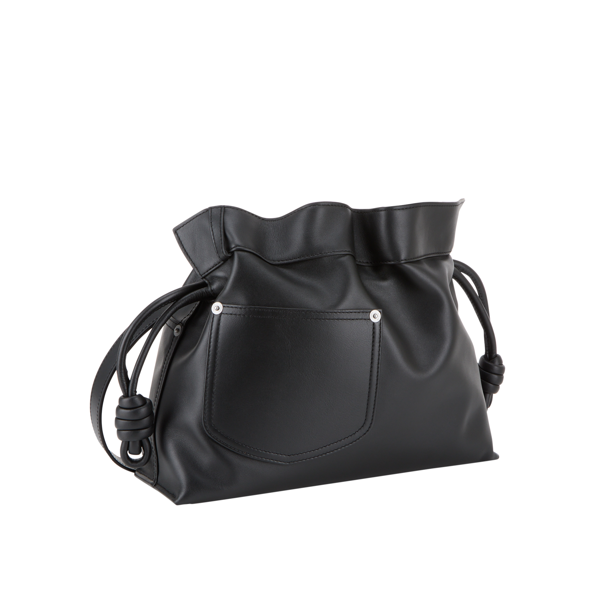 - Ruched opening with signature knot design, discreet magnetic closure, detachable and adjustable strap, foil logo lettering, pocket design inspired by denim jeans, silver-tone hardware, smooth finish, can be worn on the shoulder, across the body, or carried in the hand