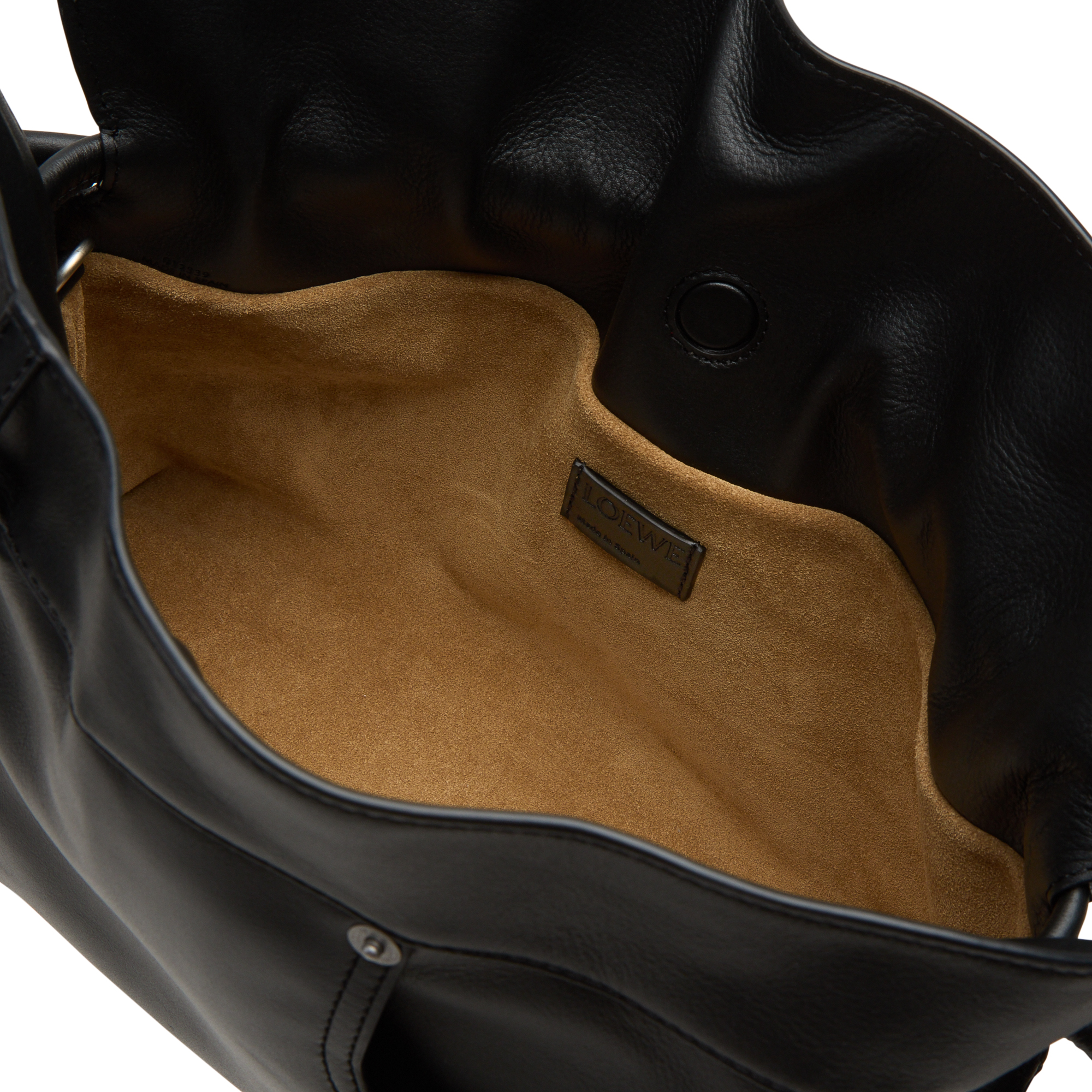 - Interior: One main compartment, suede lined, leather logo patch