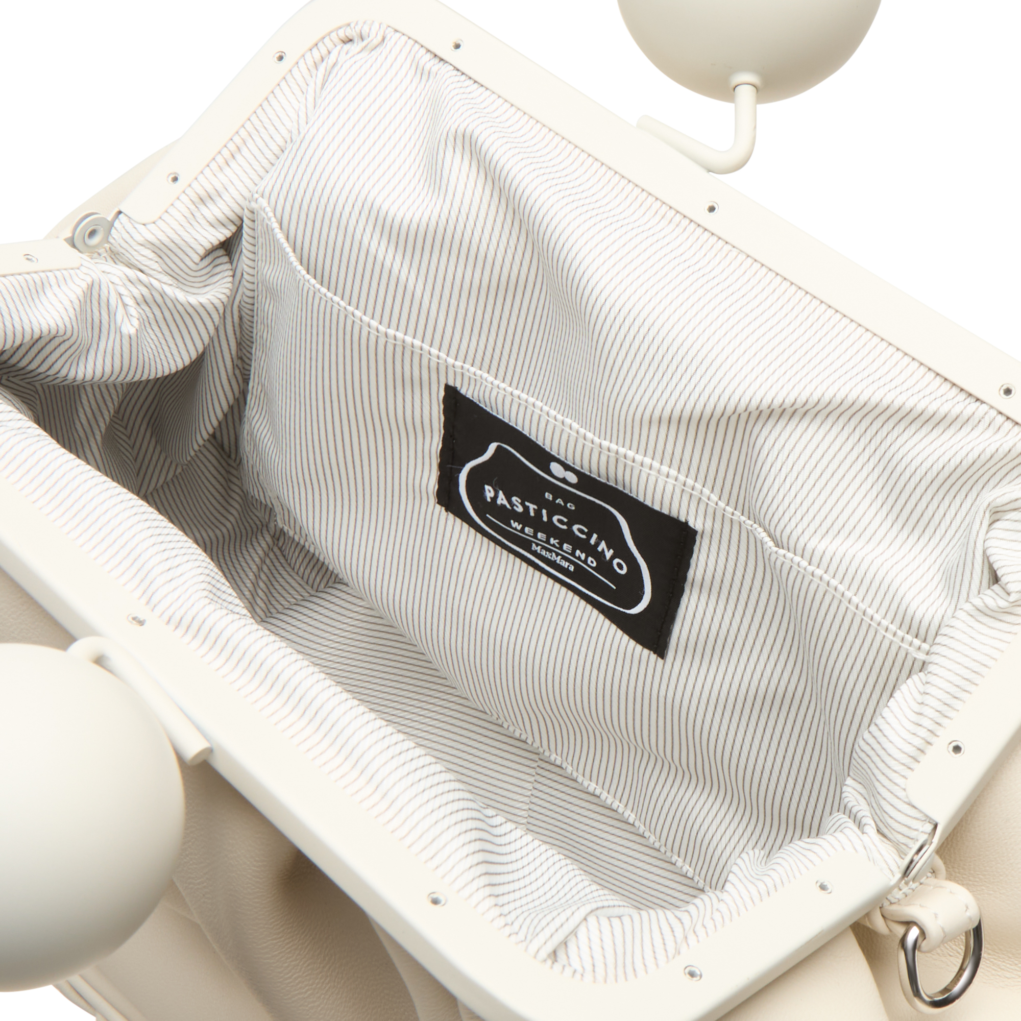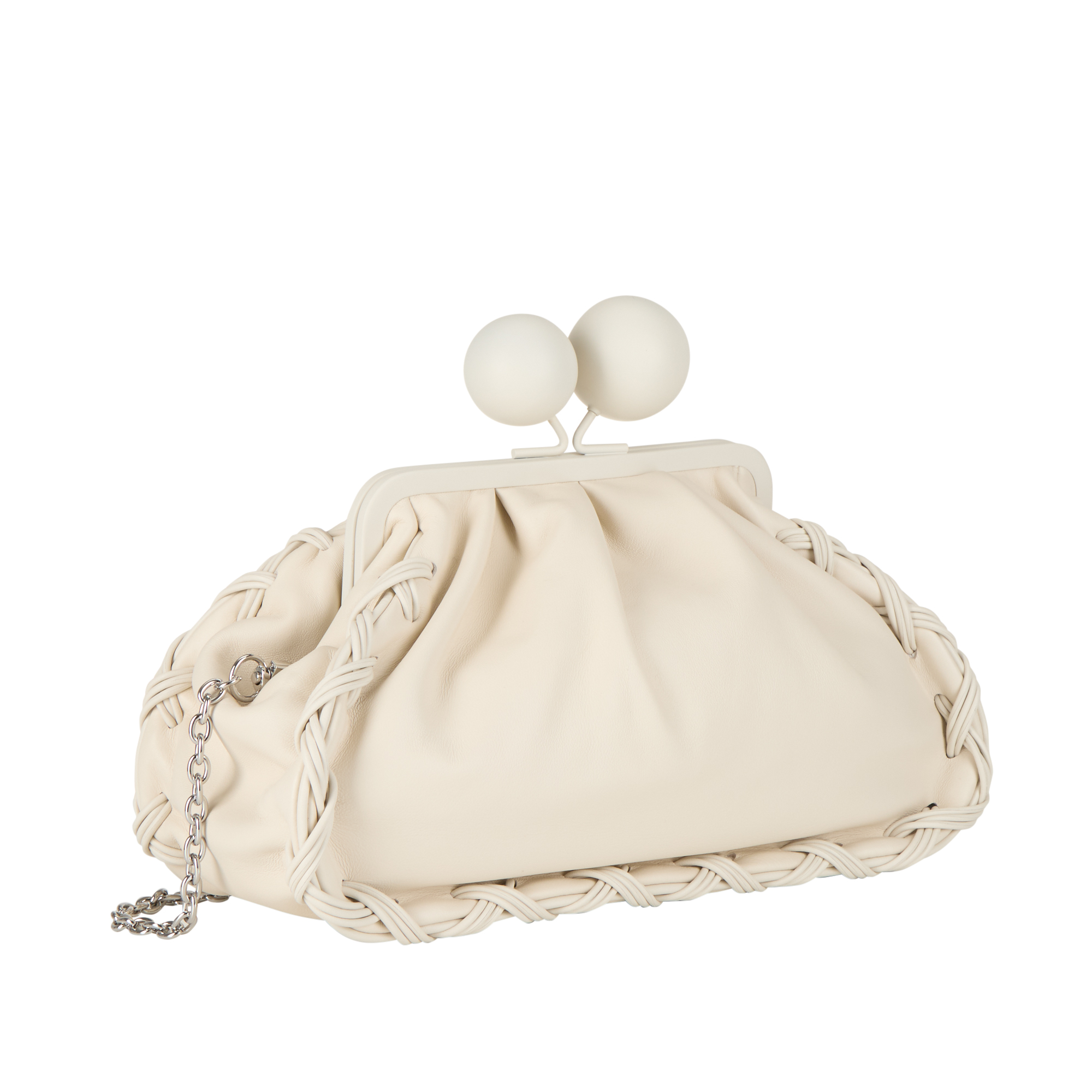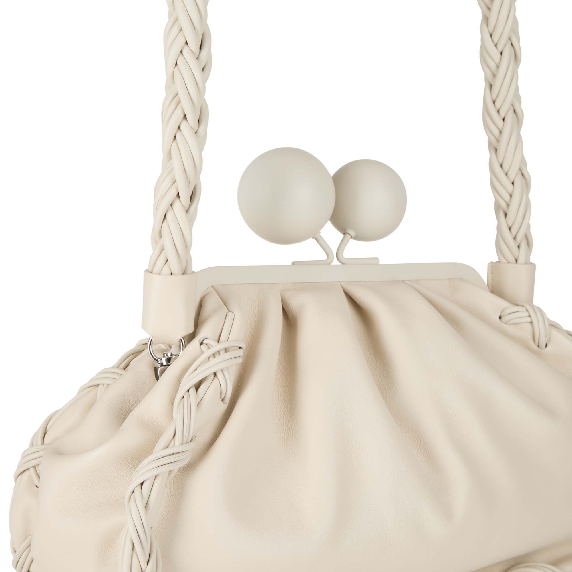 - Braided shoulder strap, kisslock closure, braided outside trimming, metal frame, detachable chain strap that can be worn across the body or over the shoulder, smooth leather finish