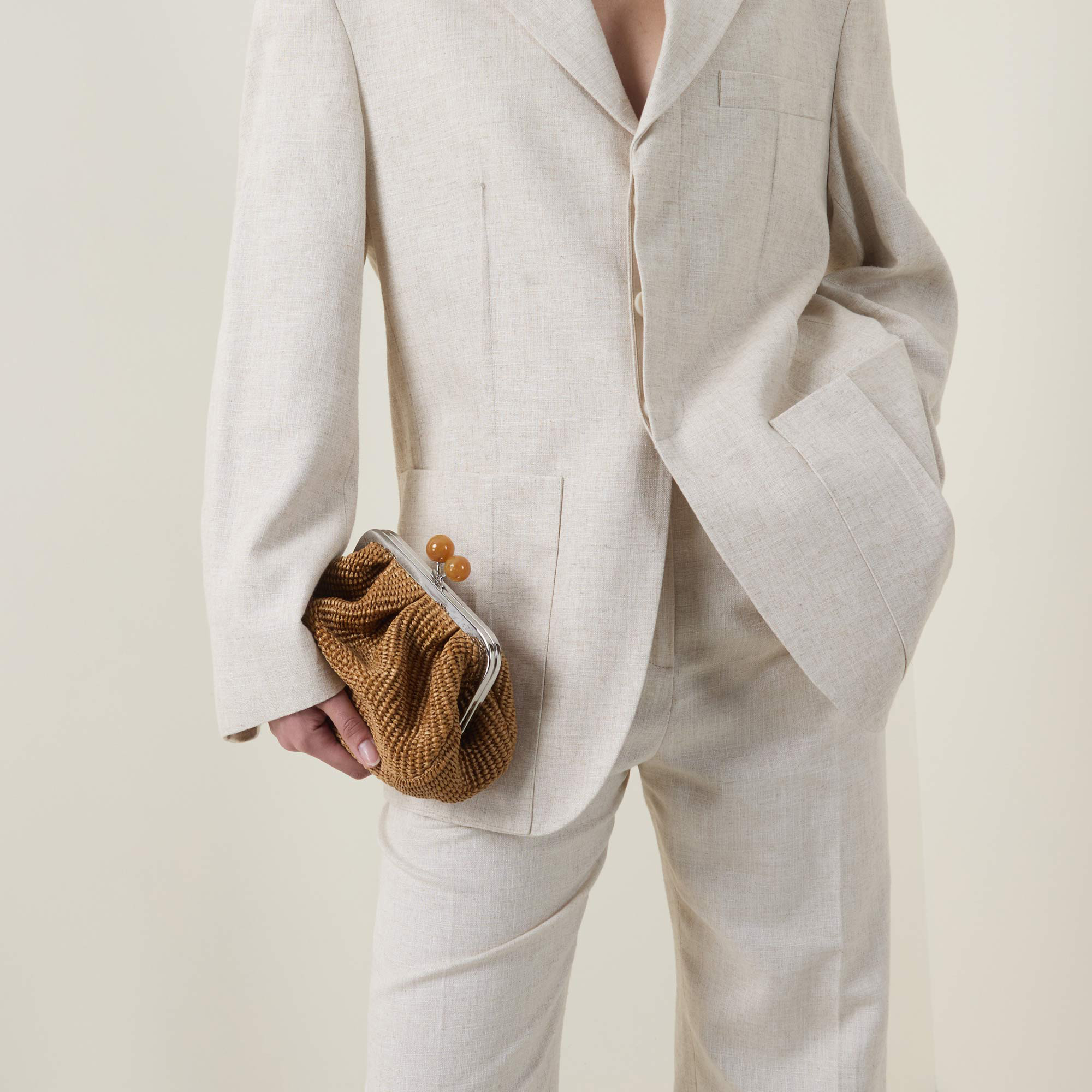 - Clasp closure, raffia-effect outer, silver-tone hardware, detachable chain strap, lined