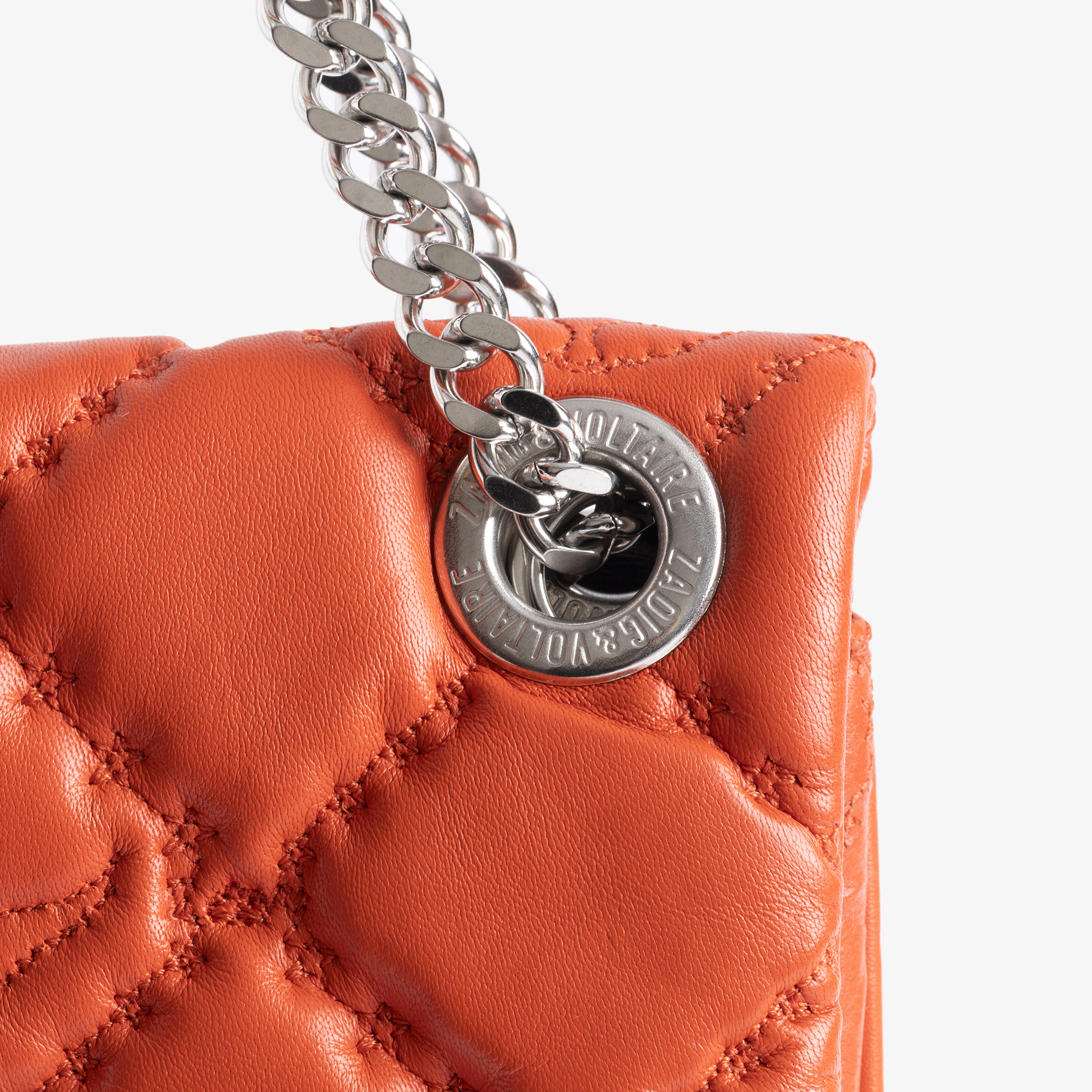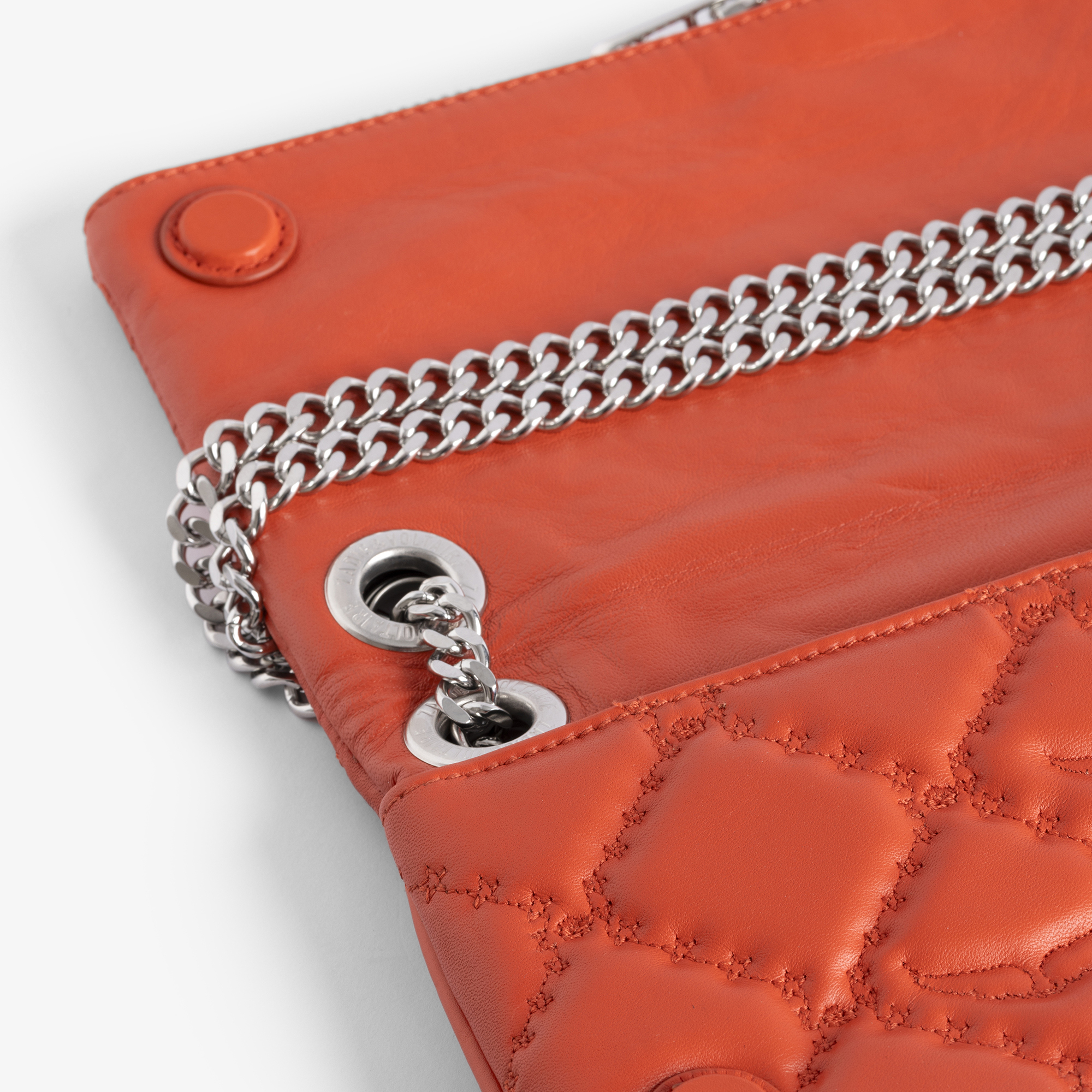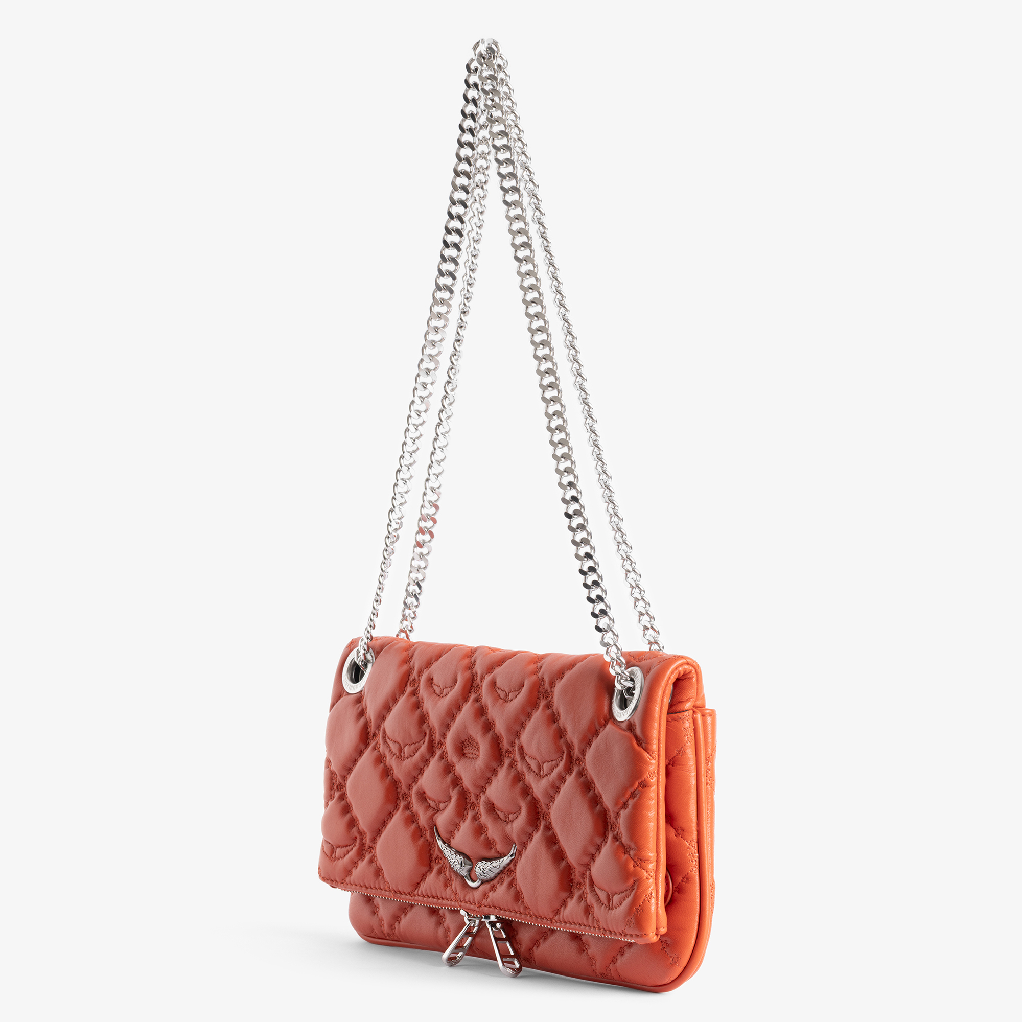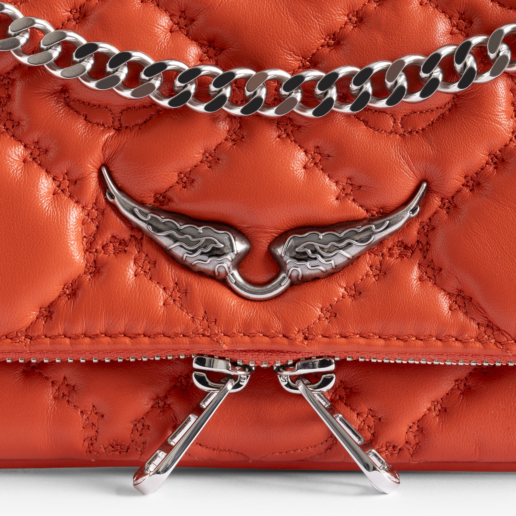 • Dual zip fastening, sliding metal chain strap, signature Wing hardware, silver-tone finishes, quilted design