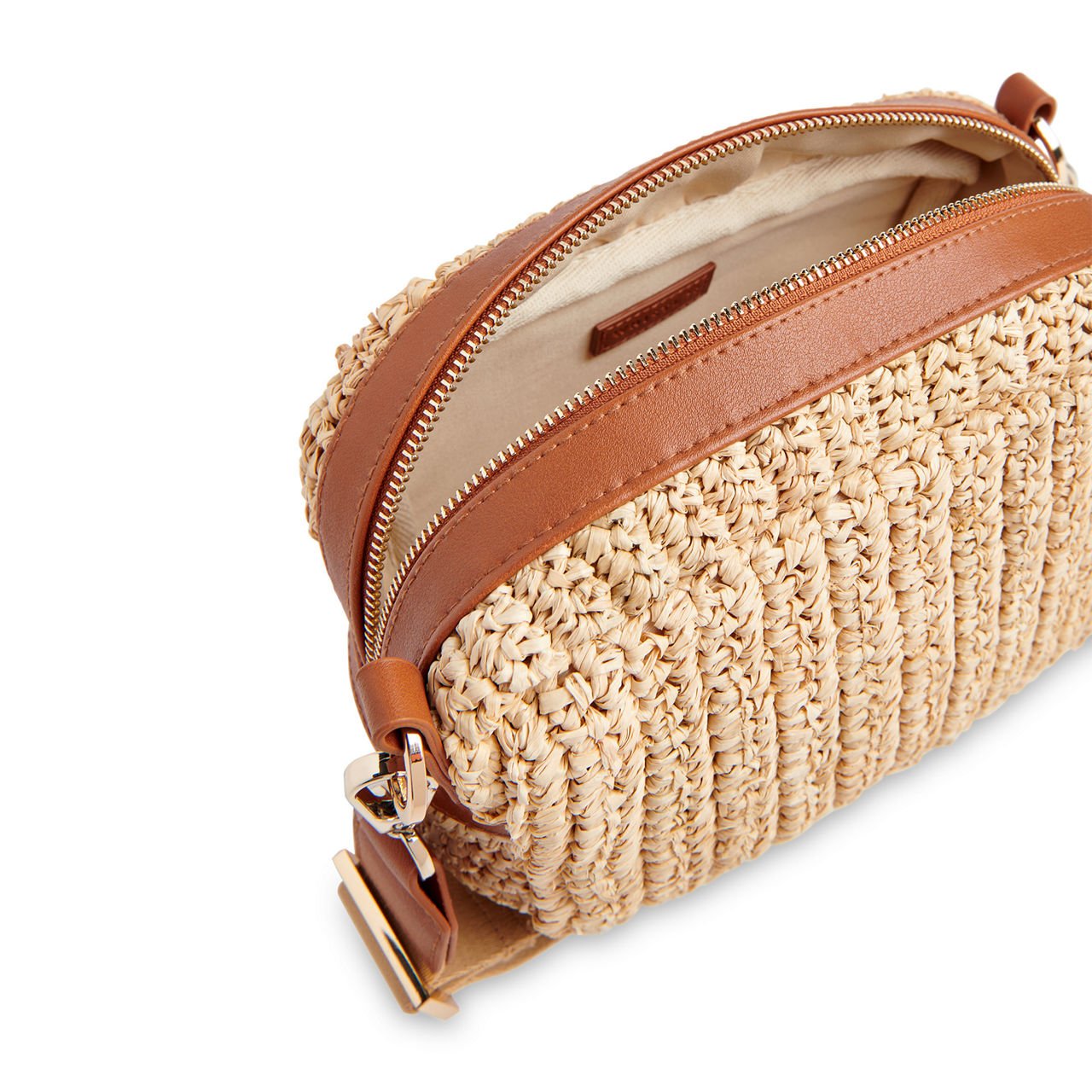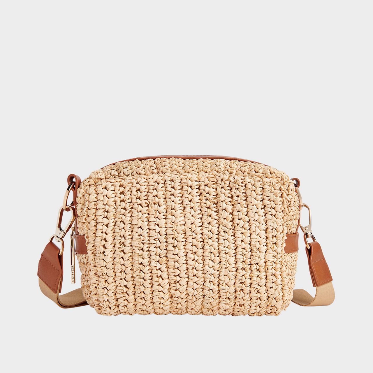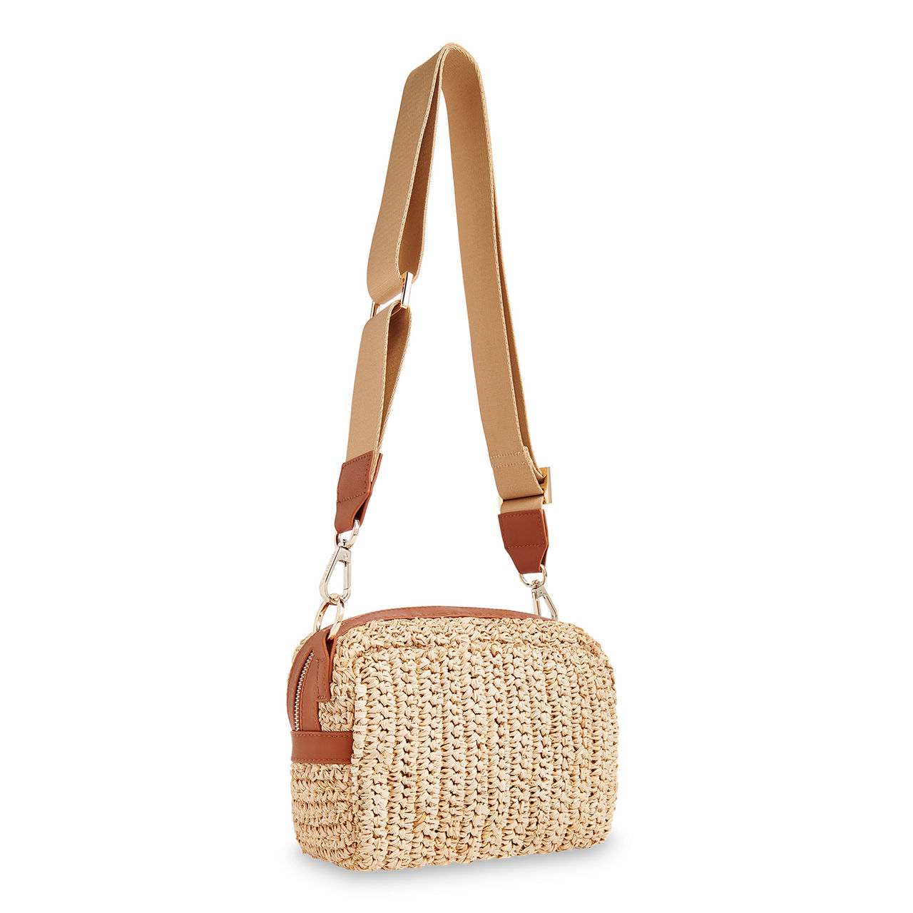- Detachable and adjustable crossbody strap, top zip fastening, branded hardware, woven finish, contrast trims