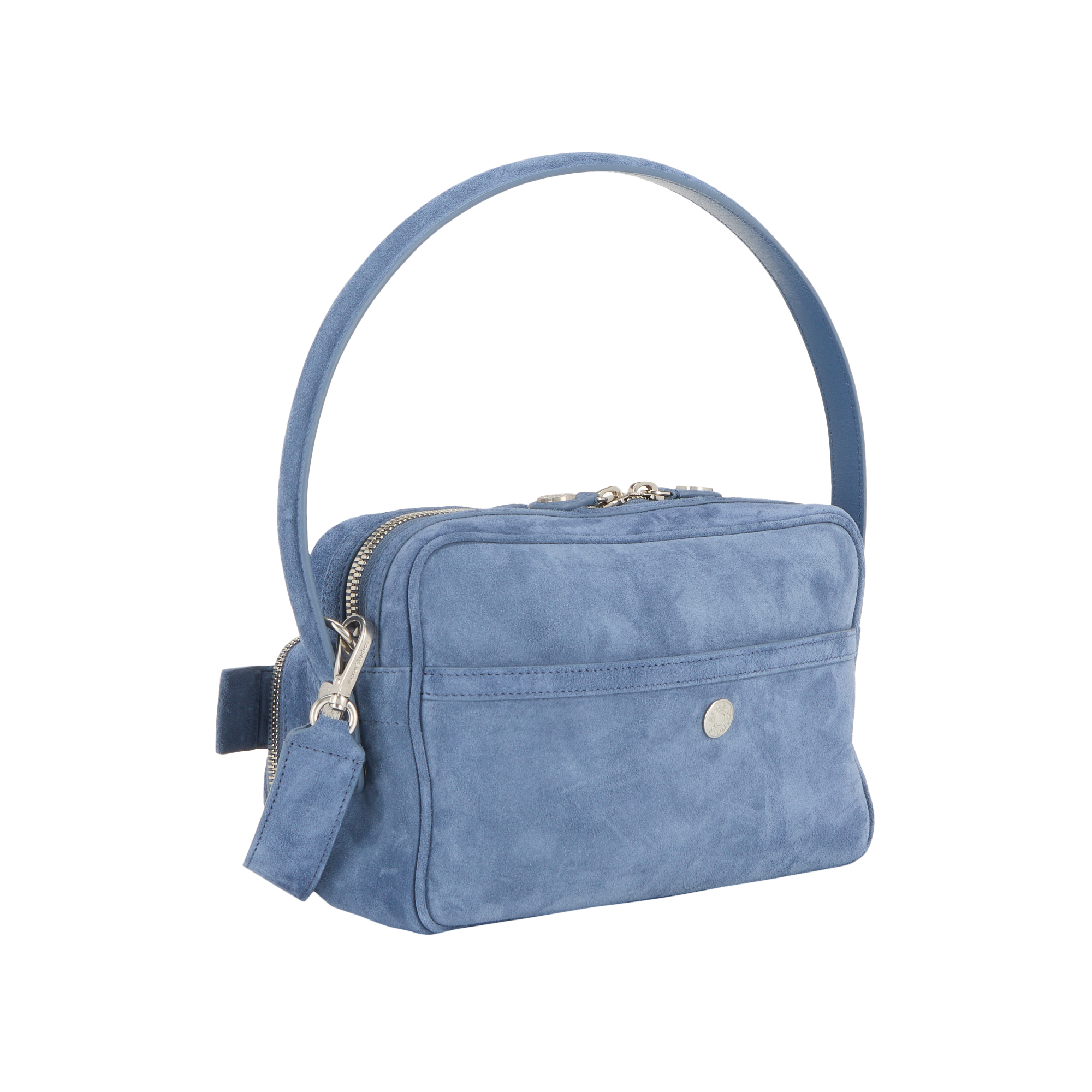 - Fixed shoulder strap, detachable and adjustable crossbody strap, zip fastening, silver-tone hardware, branded key detail, logo details, multiple zipped exterior pocket, slip pocket to the back, suede finish