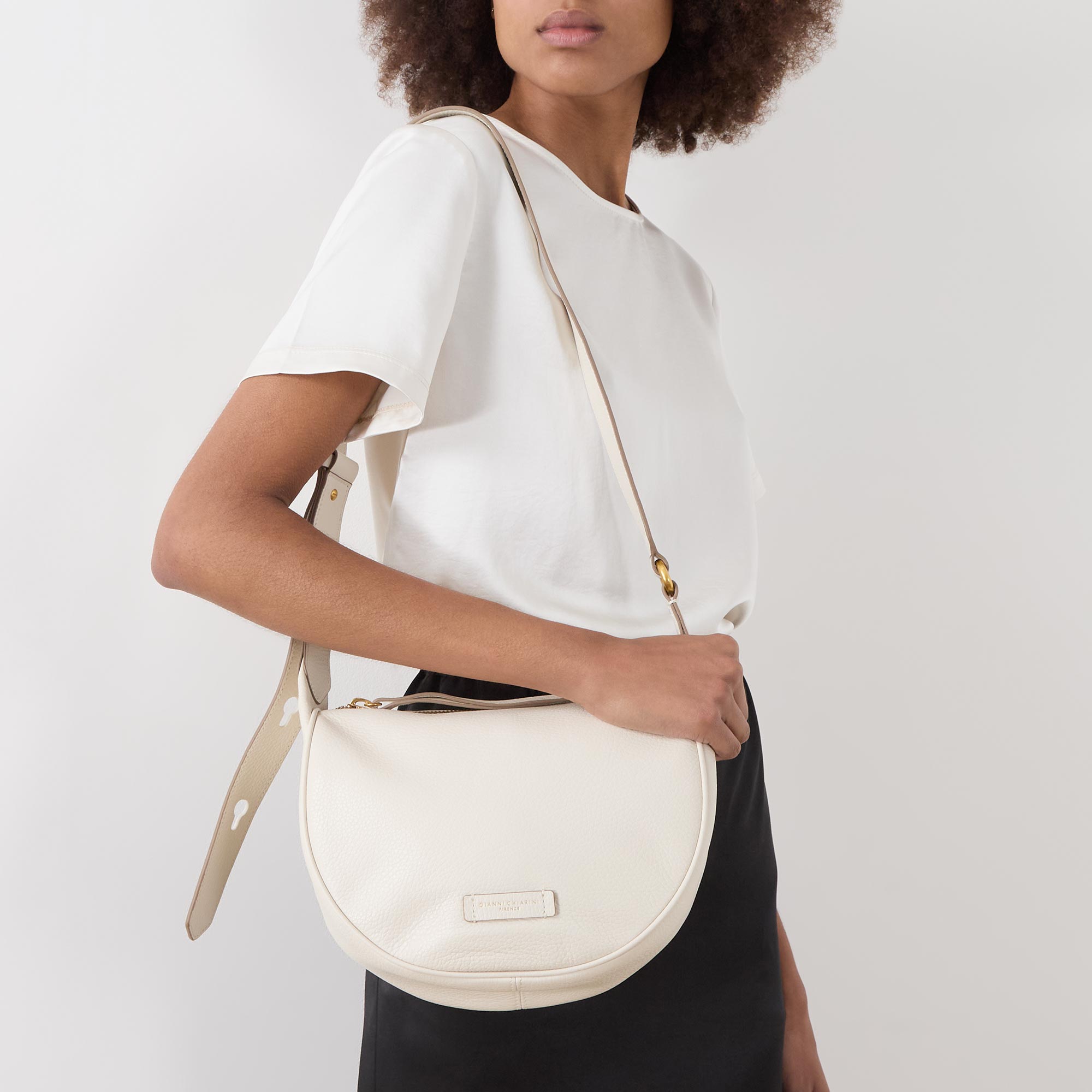 • Semi-circular shape, top zip fastening with leather pull tab, spacious main compartment, adjustable shoulder strap, grained finish, branded patch, gold-tone hardware