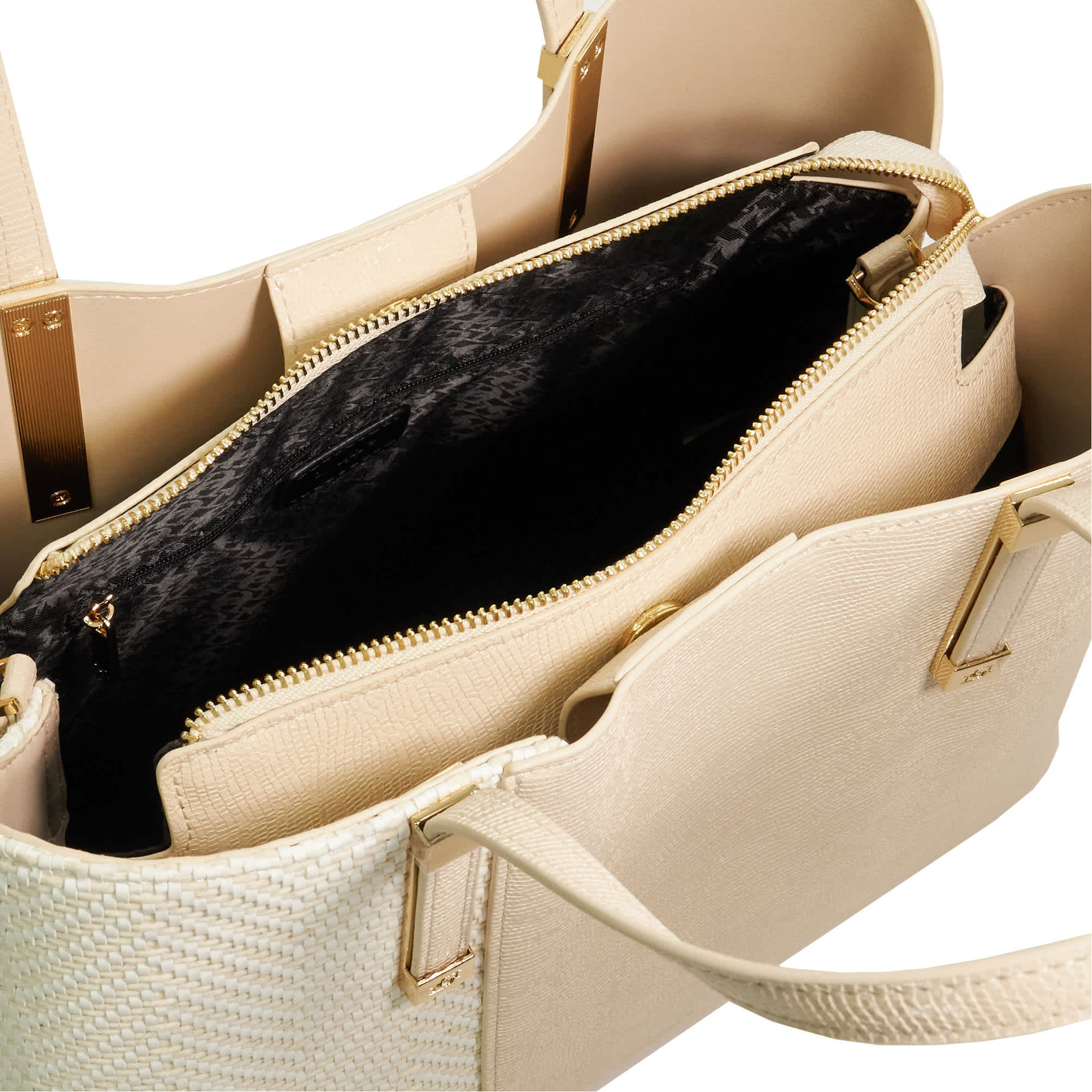 - Boxy silhouette, contrasting textured fabric, detachable crossbody strap, double grab handles, gold-tone hardware Interior: Multiple internal compartments
