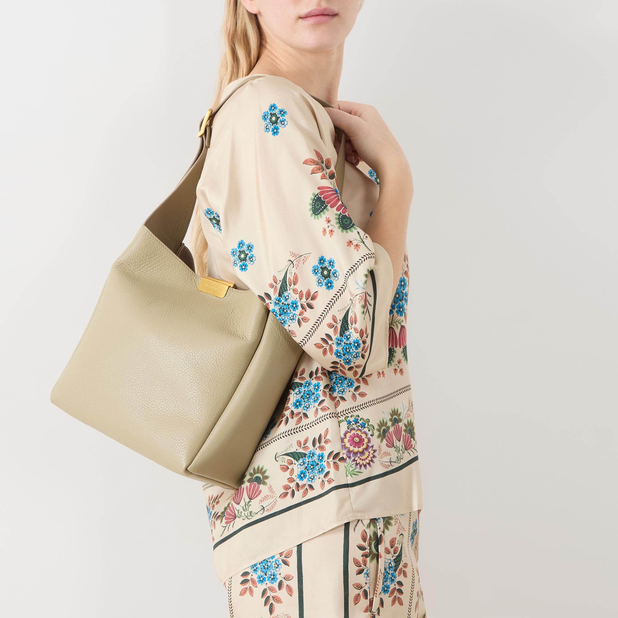 - Adjustable shoulder strap, hardware clasp fastening with engraved logo detailing, gold-tone finishes, grained finish, tonal stitching